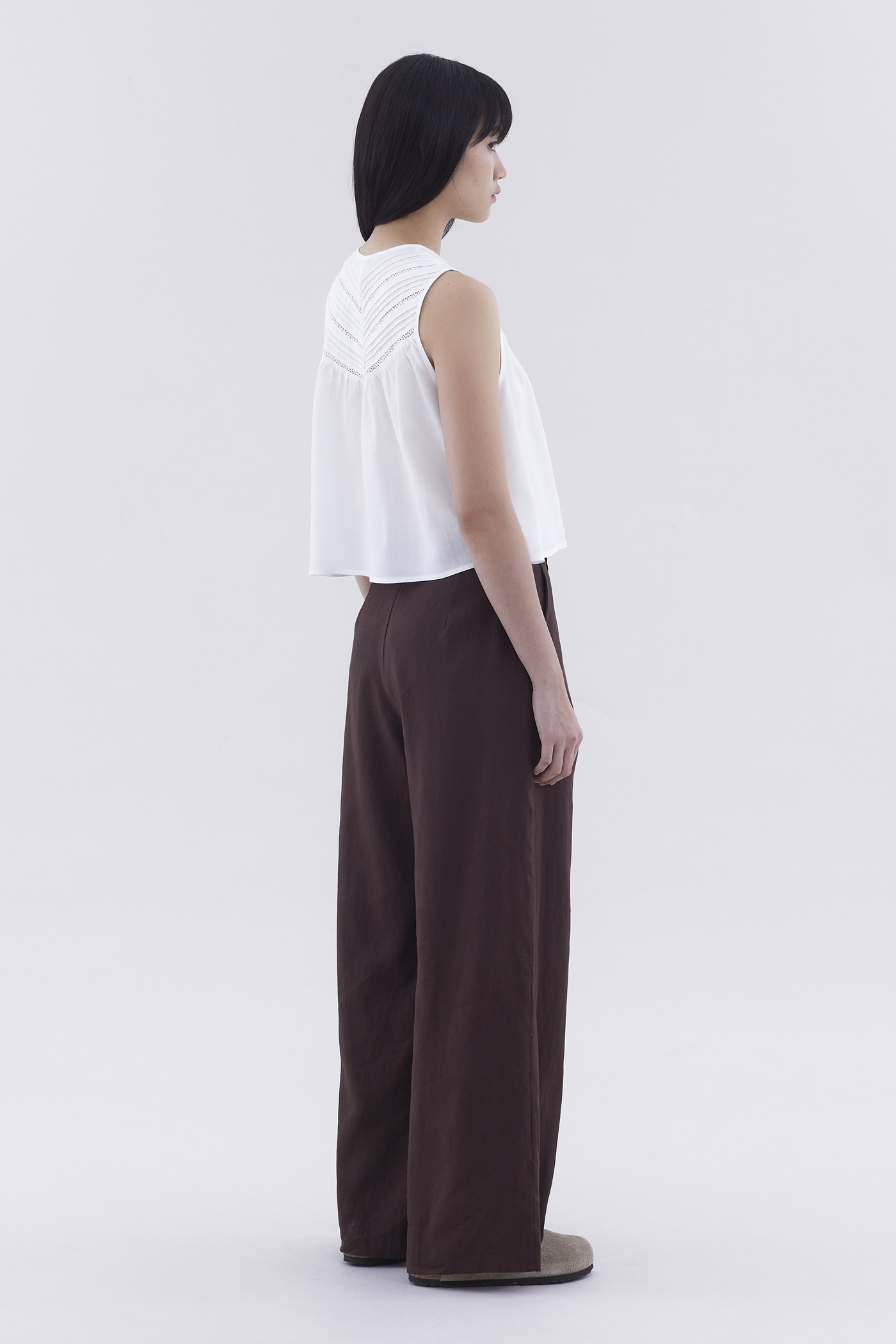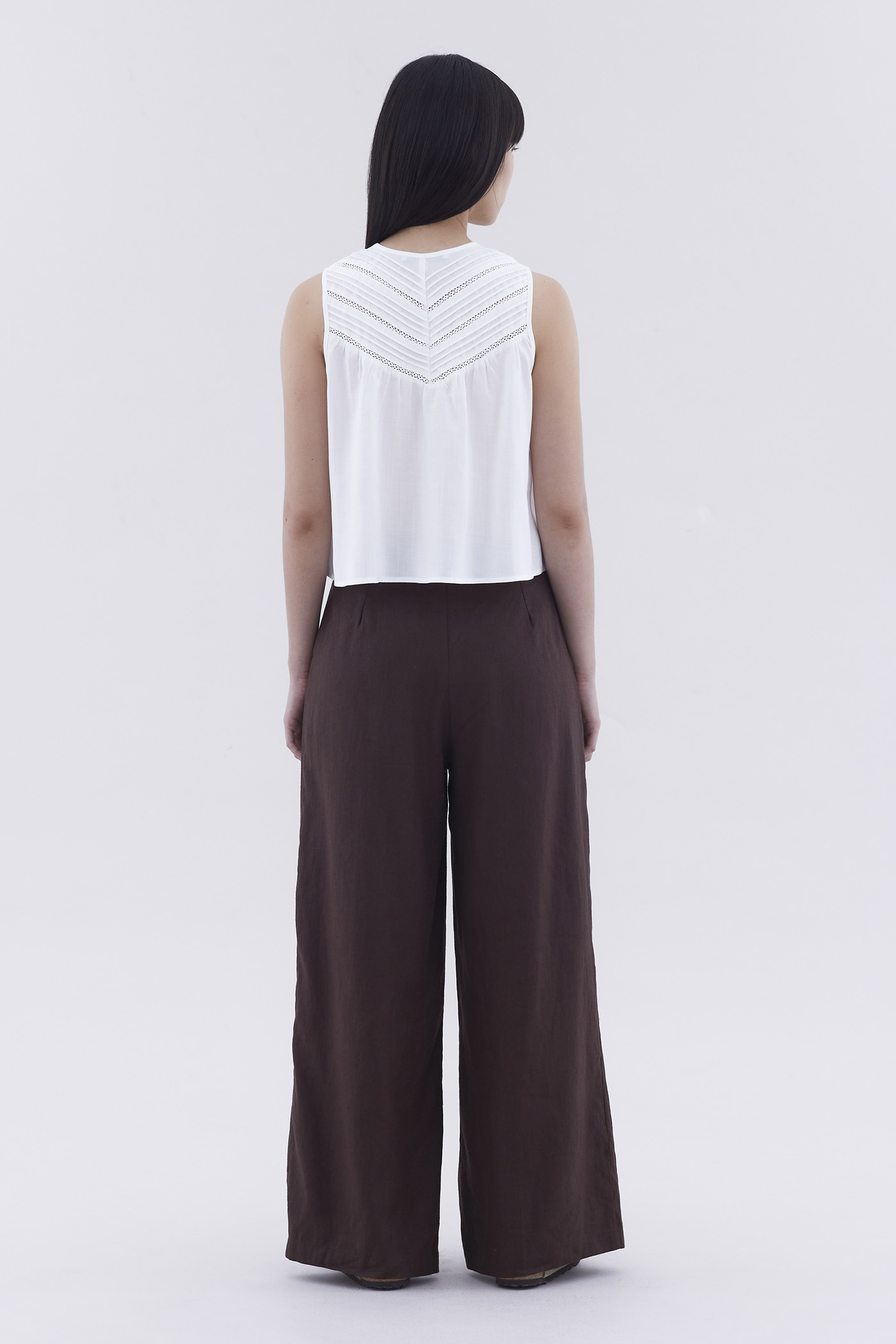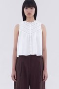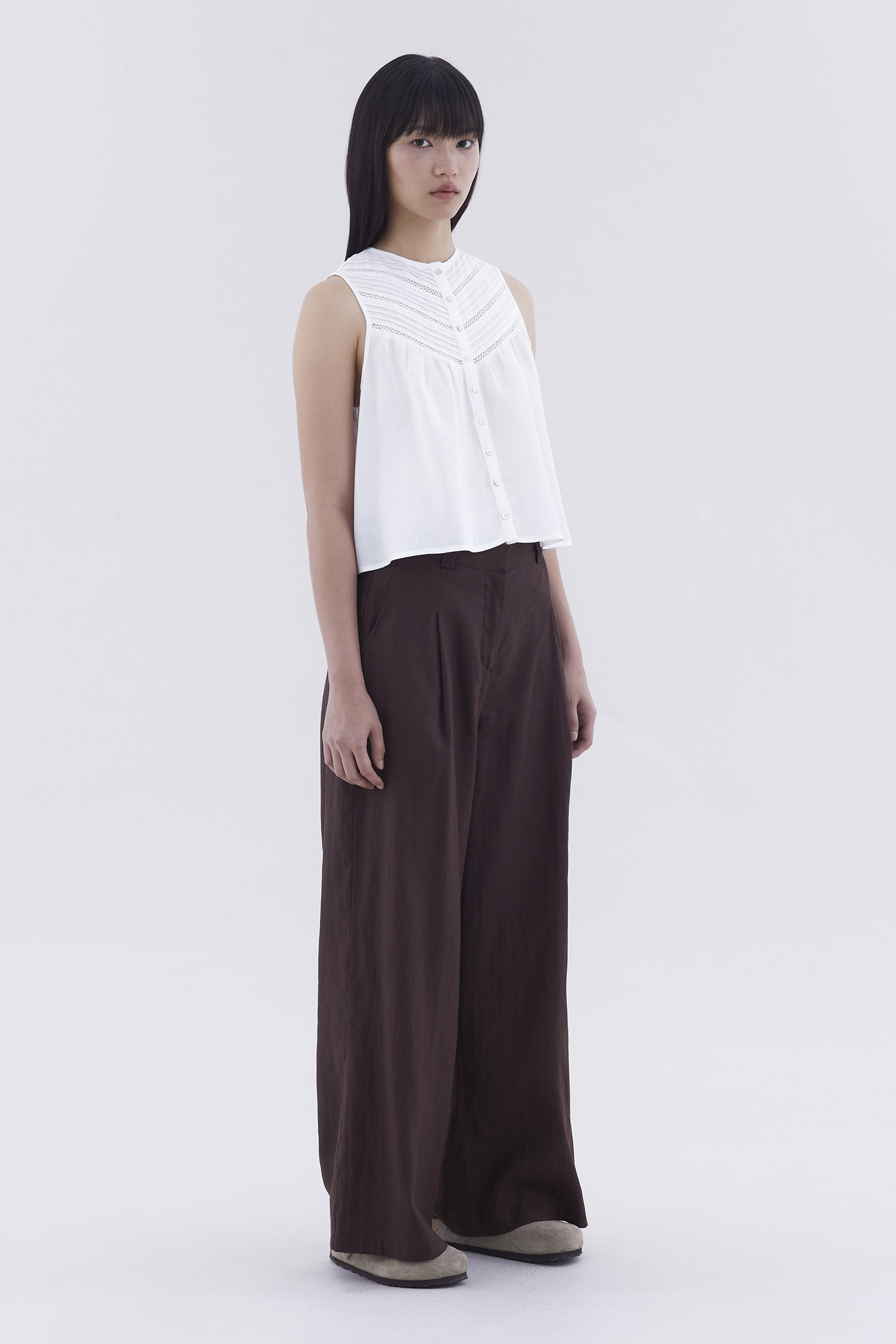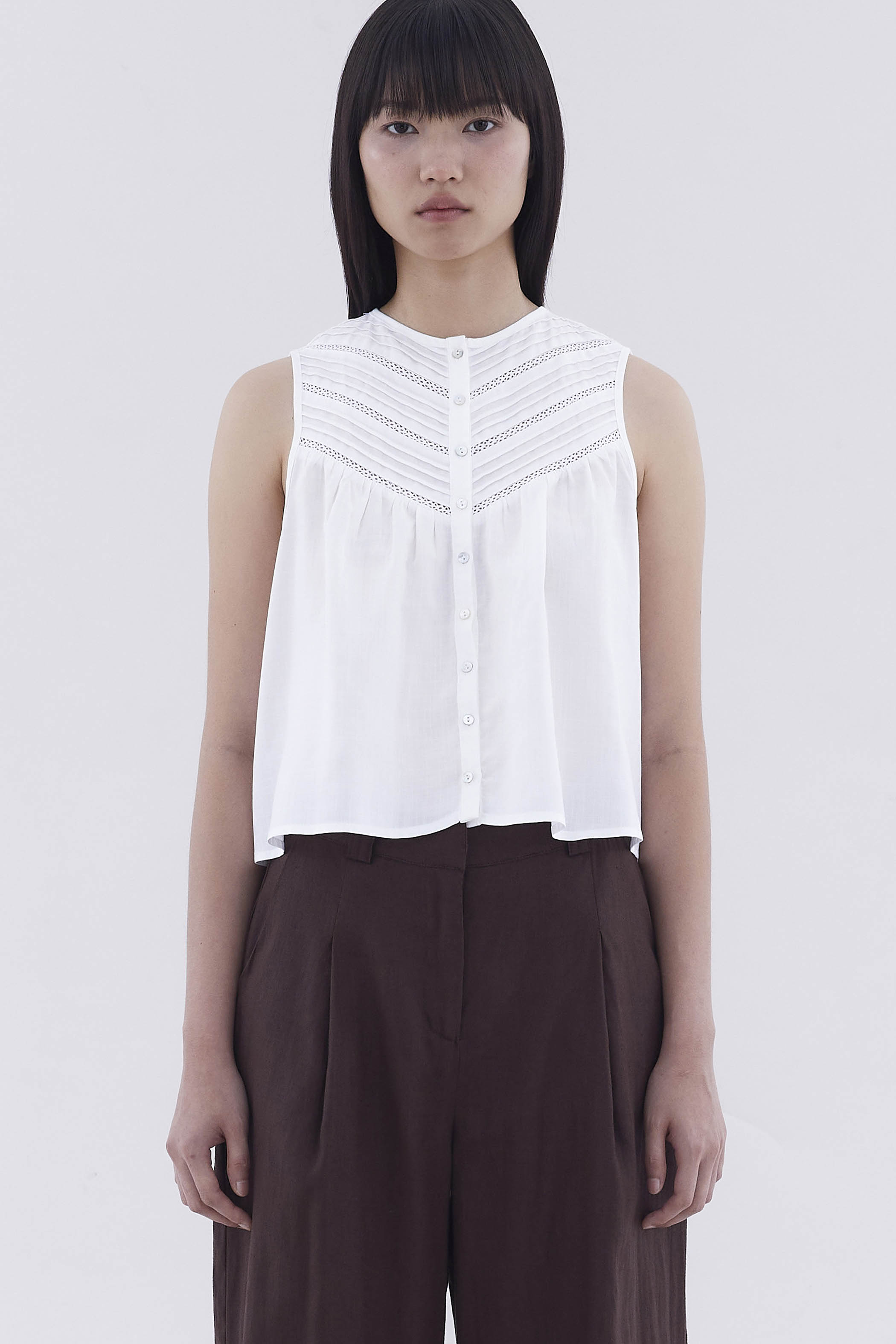 Cool off. Cut from airy and non-stretch Tencel, this sleeveless top features a round neckline, V-shaped pin-tuck pleats and lace panels, as well as a button-down front. Worn in a slim fit.