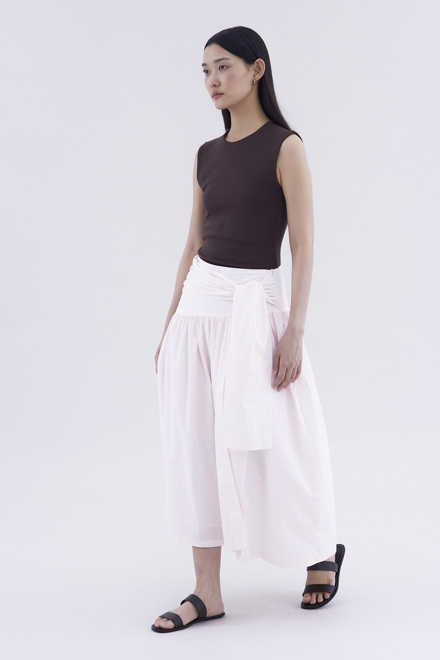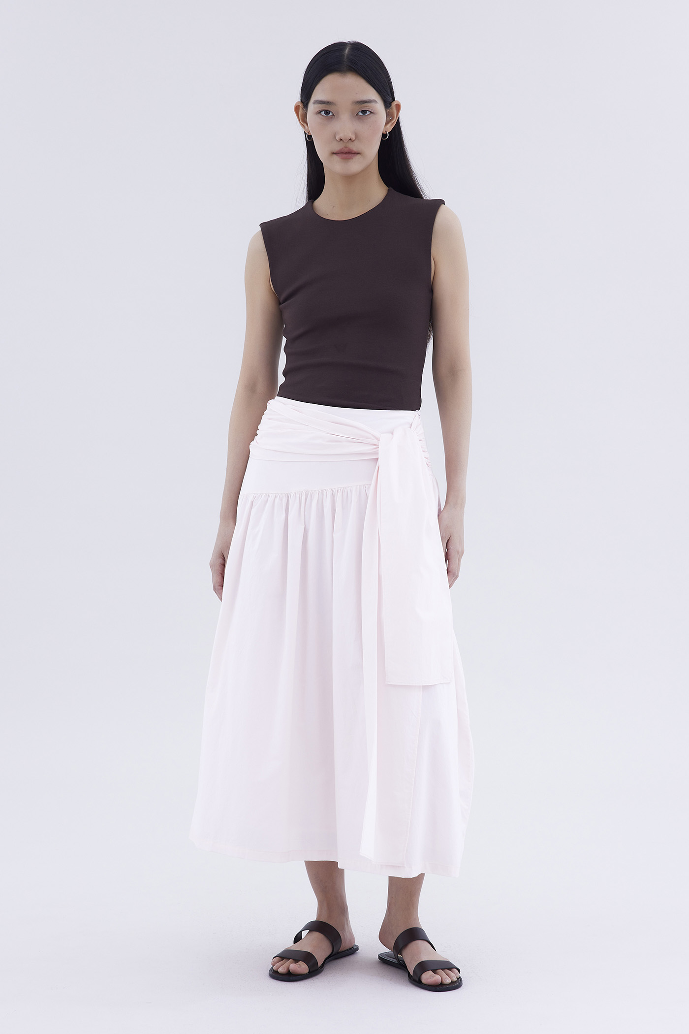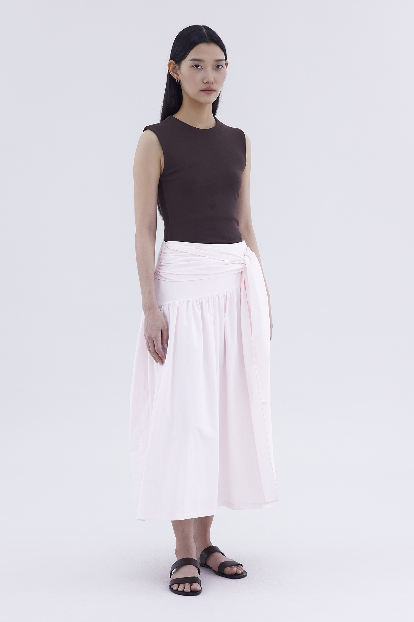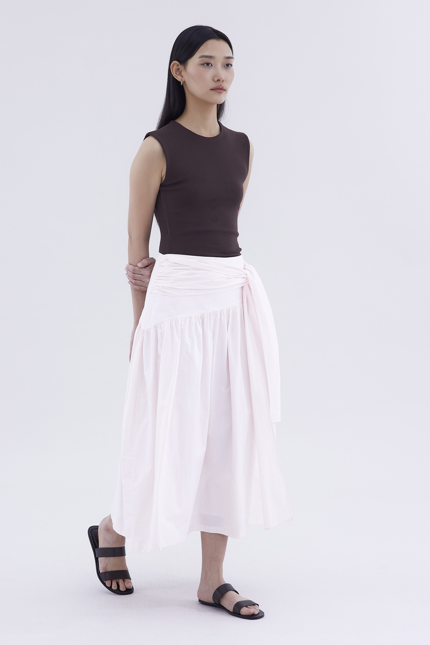 Be layered. Made from crisp and softly structured cotton, this midi skirt features an asymmetrical waist panel with a tie-strap and side zip closure. Fits relaxed in a gathered A-line silhouette.