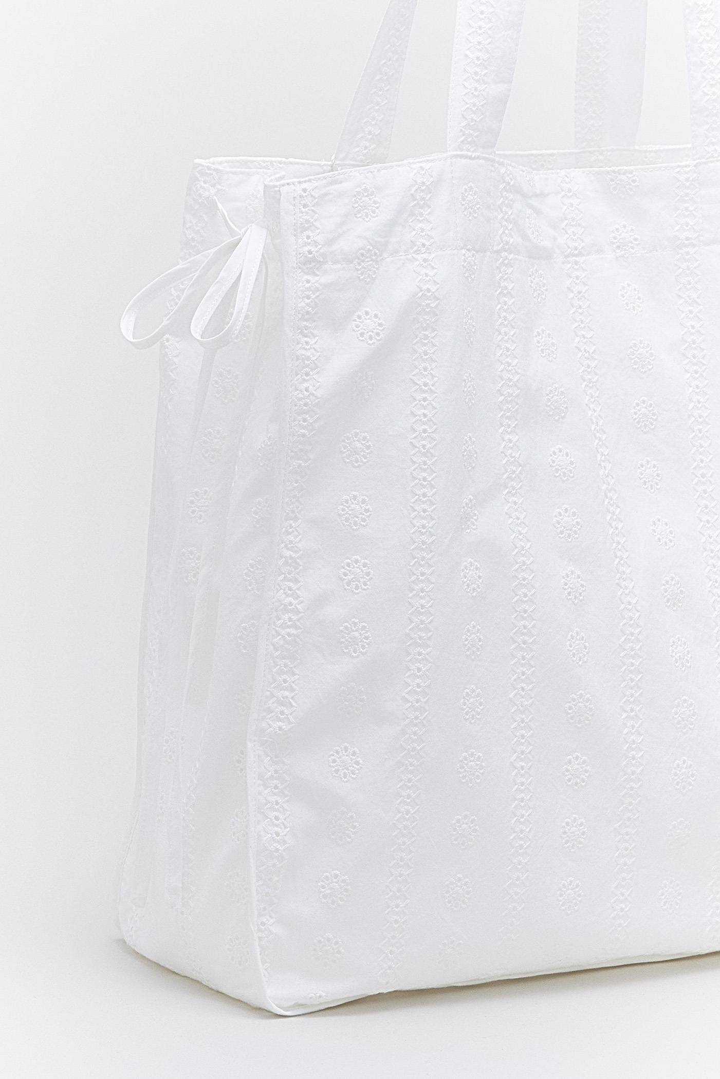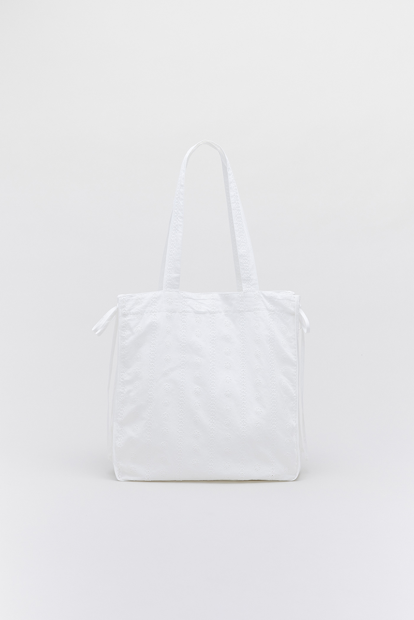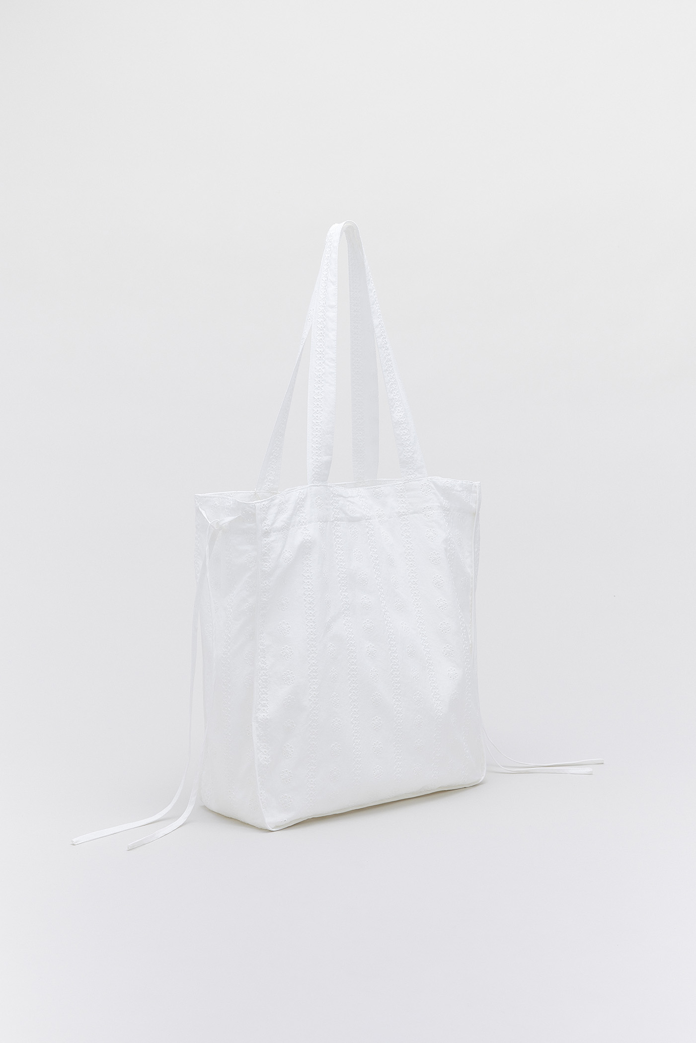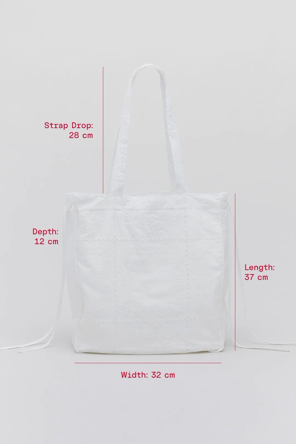 A fabric favourite, now made into a bag. The Broderie Tie Tote is crafted from fully lined cotton broderie and boasts a spacious interior that accommodates larger items, including most 16” laptops, books, an umbrella and so on. It also features a piped construction for added structure, an inner pocket with a concealed zip and double shoulder straps. Additional side tie straps add playful detail and can be used to cinch in the bag’s opening.