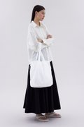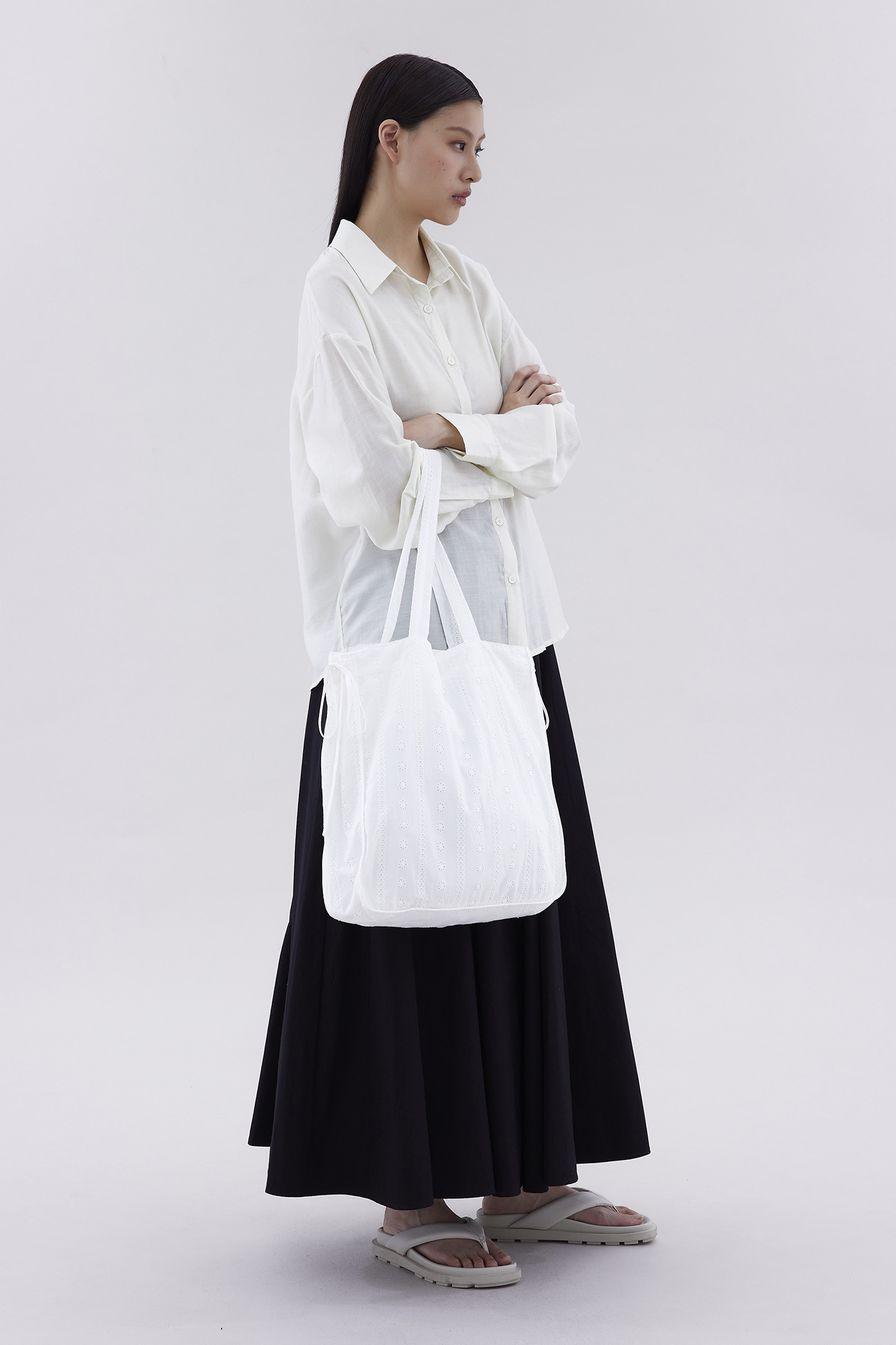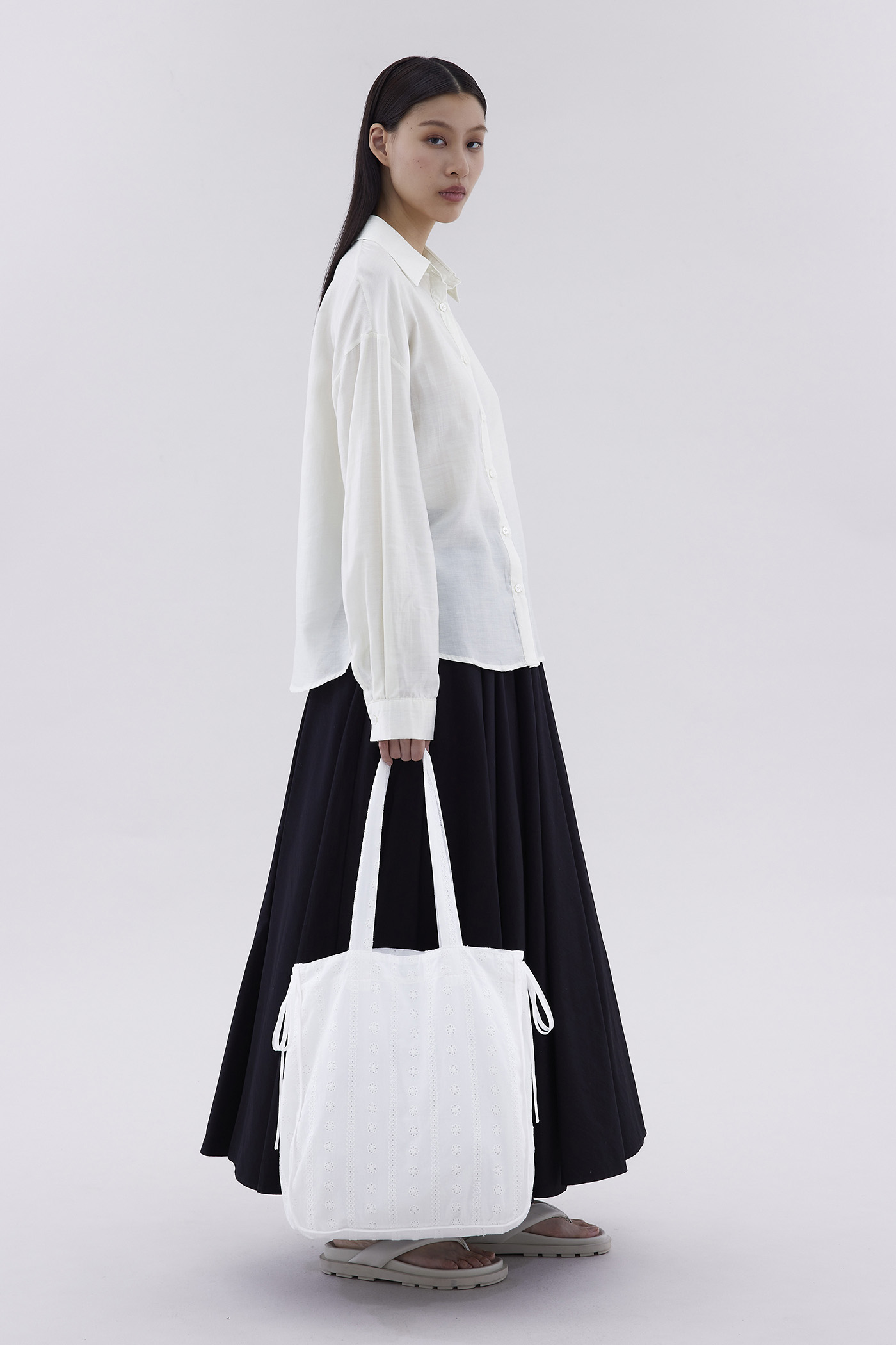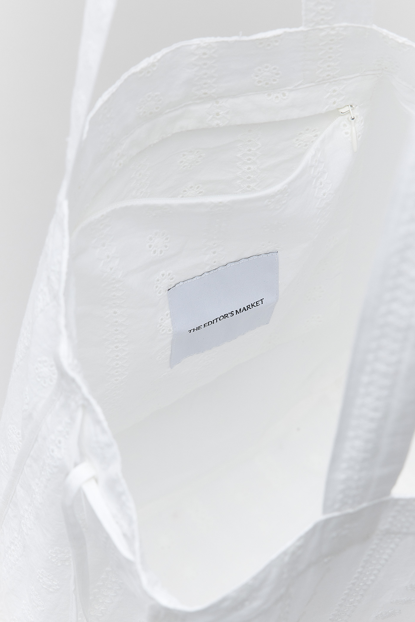 A fabric favourite, now made into a bag. The Broderie Tie Tote is crafted from fully lined cotton broderie and boasts a spacious interior that accommodates larger items, including most 16” laptops, books, an umbrella and so on. It also features a piped construction for added structure, an inner pocket with a concealed zip and double shoulder straps. Additional side tie straps add playful detail and can be used to cinch in the bag’s opening.