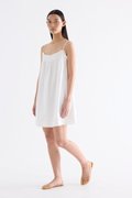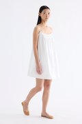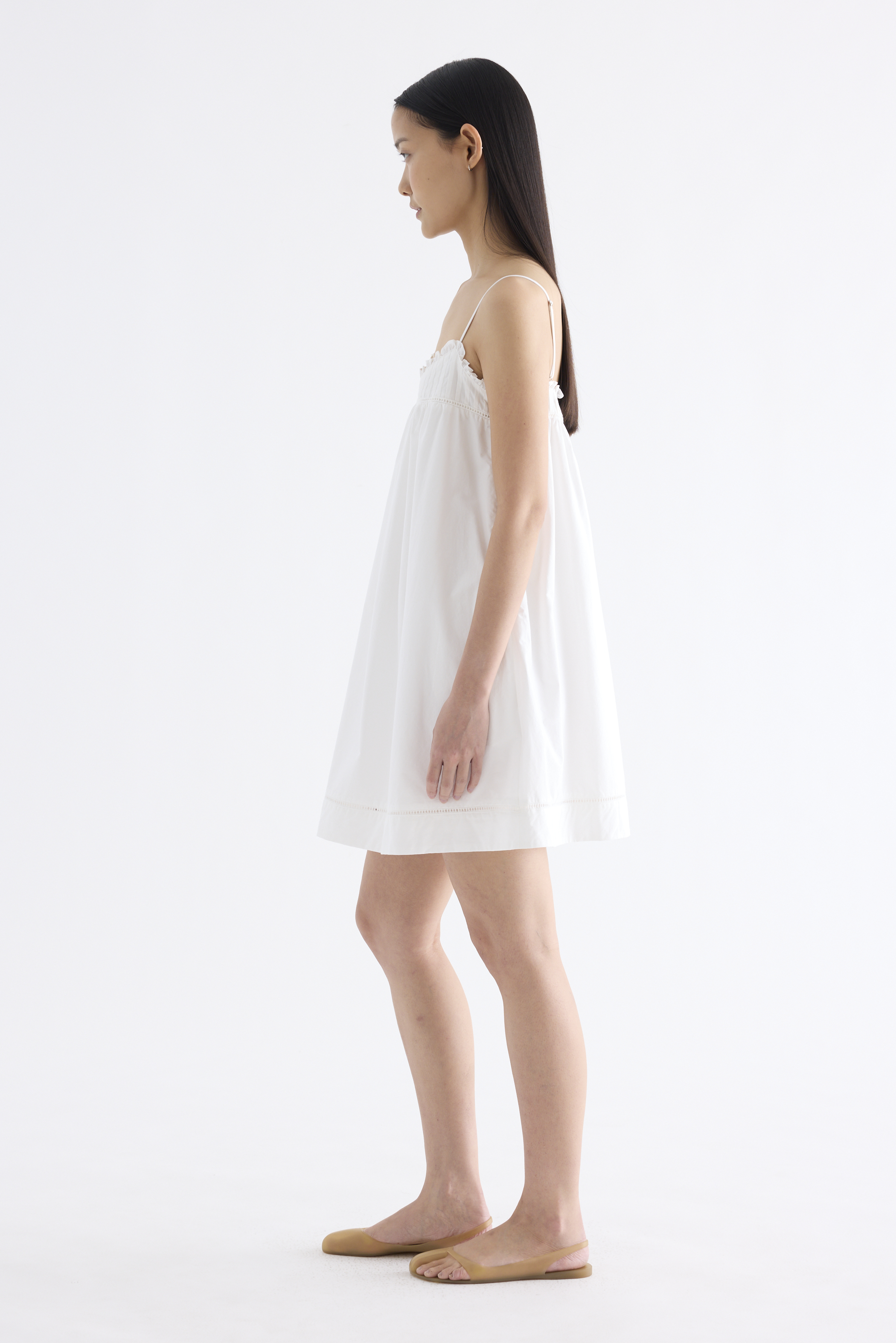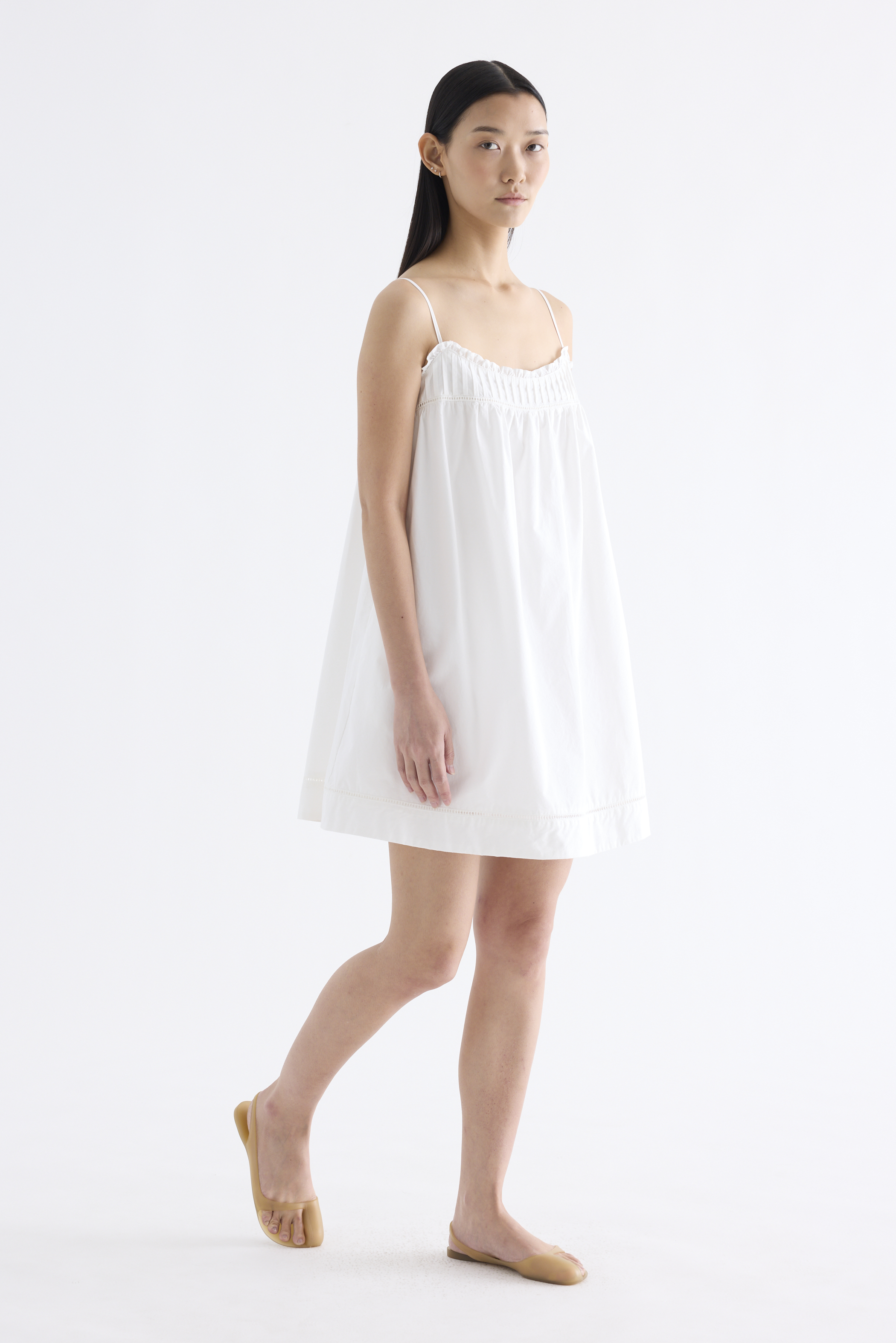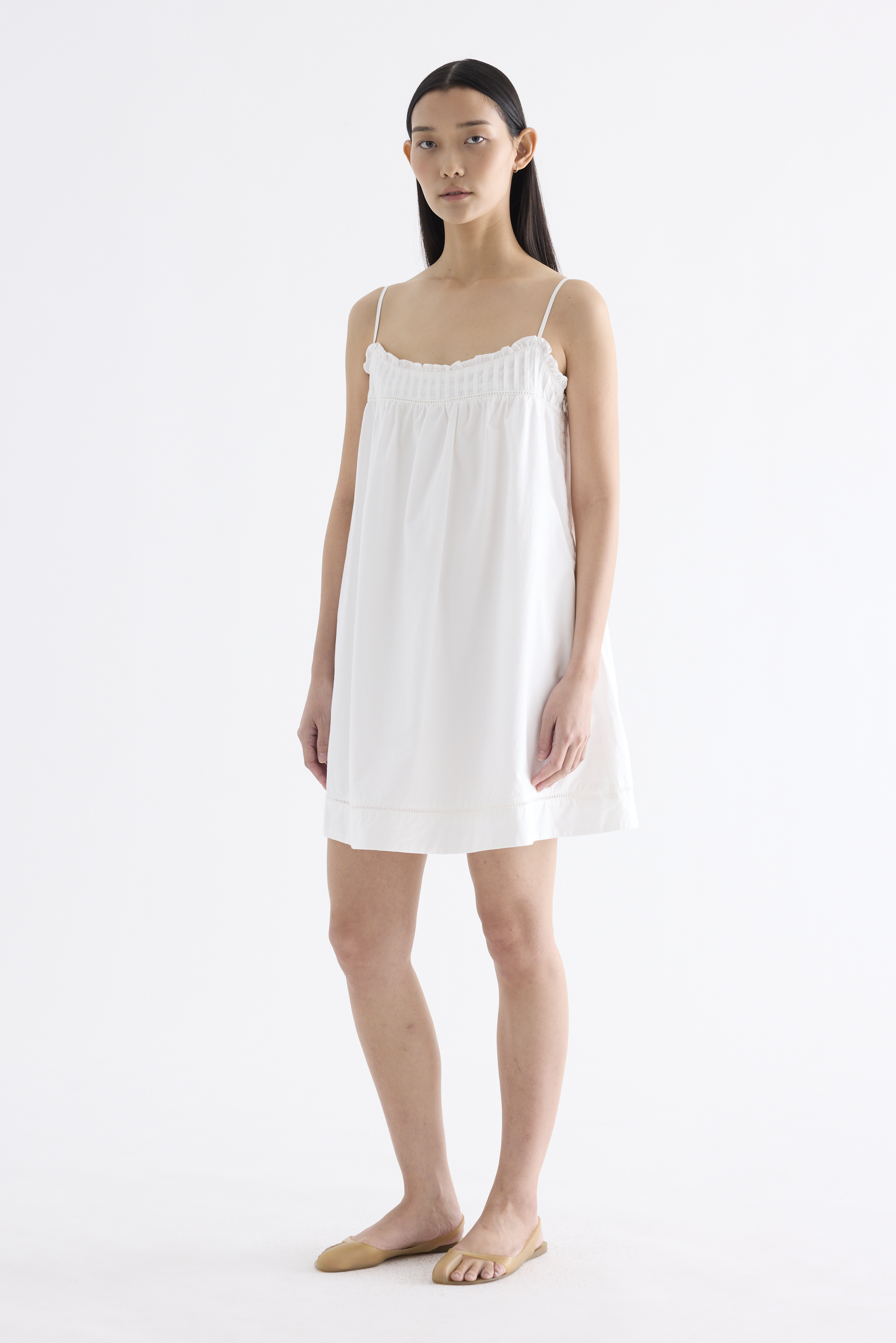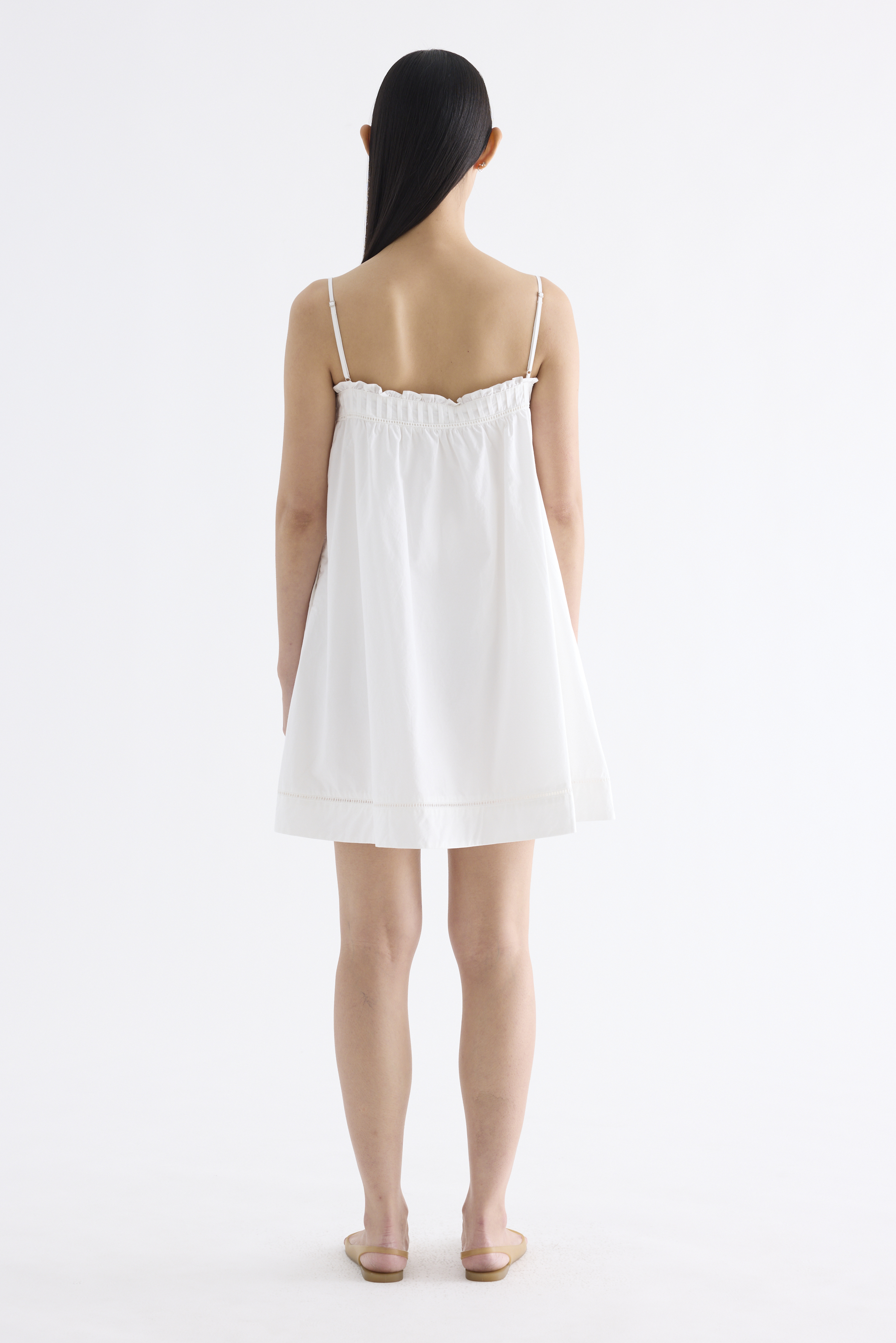 Cooler picks. Made from crisp and softly structured cotton, this sleeveless dress features an empire silhouette with slim adjustable shoulder straps, a frill-trimmed neckline, a pleated bust and lace detailing. Fits above the knee with a side zip closure.