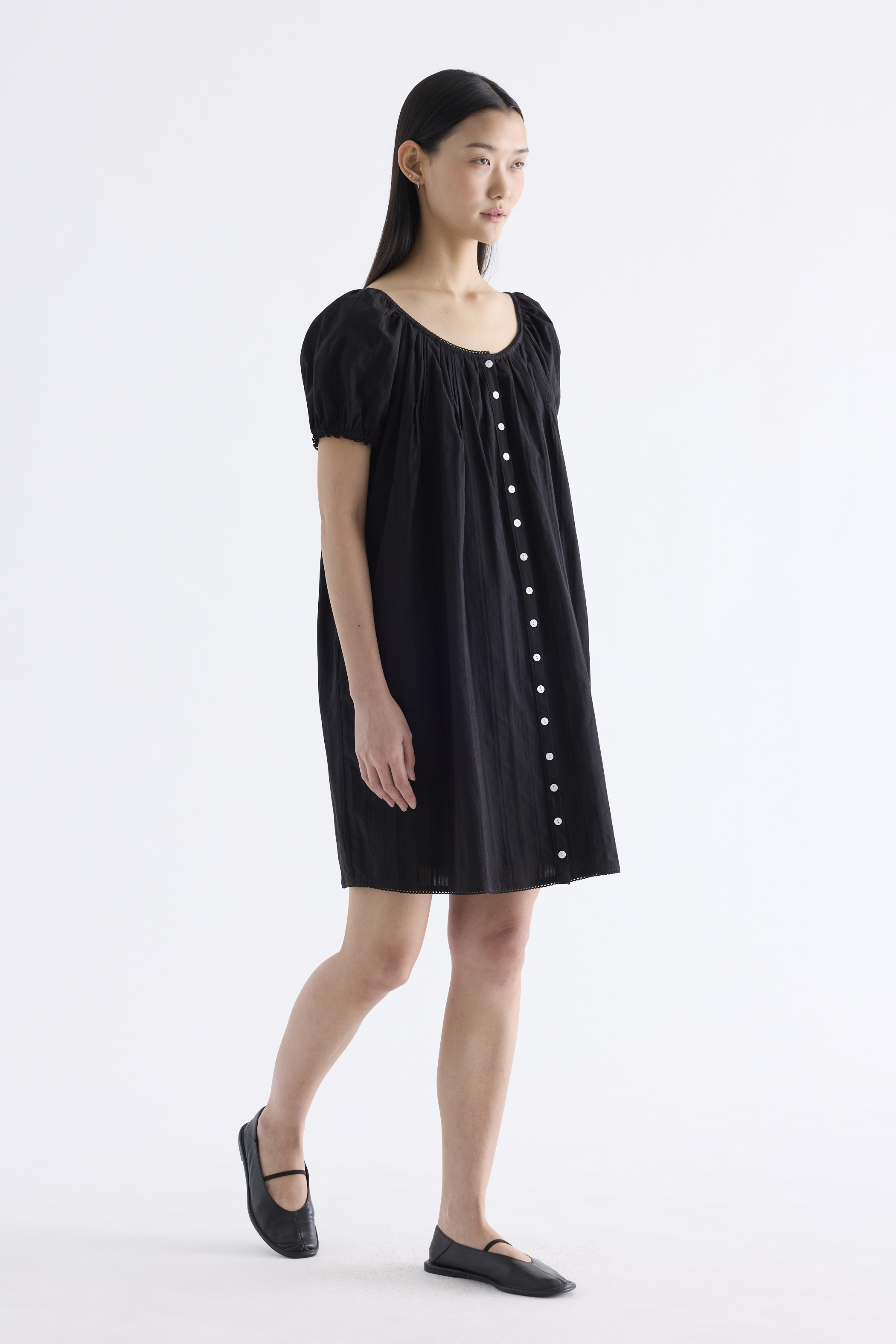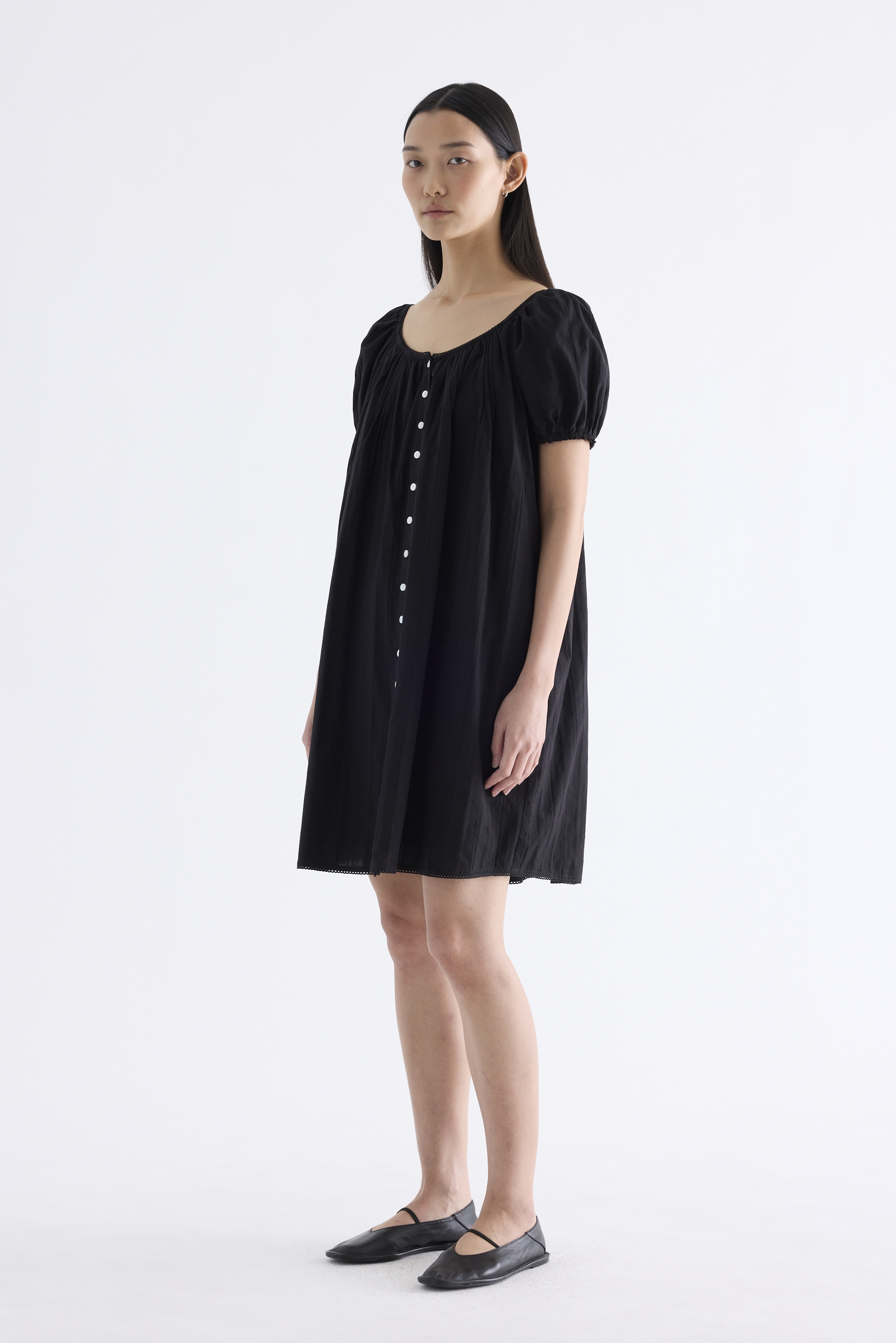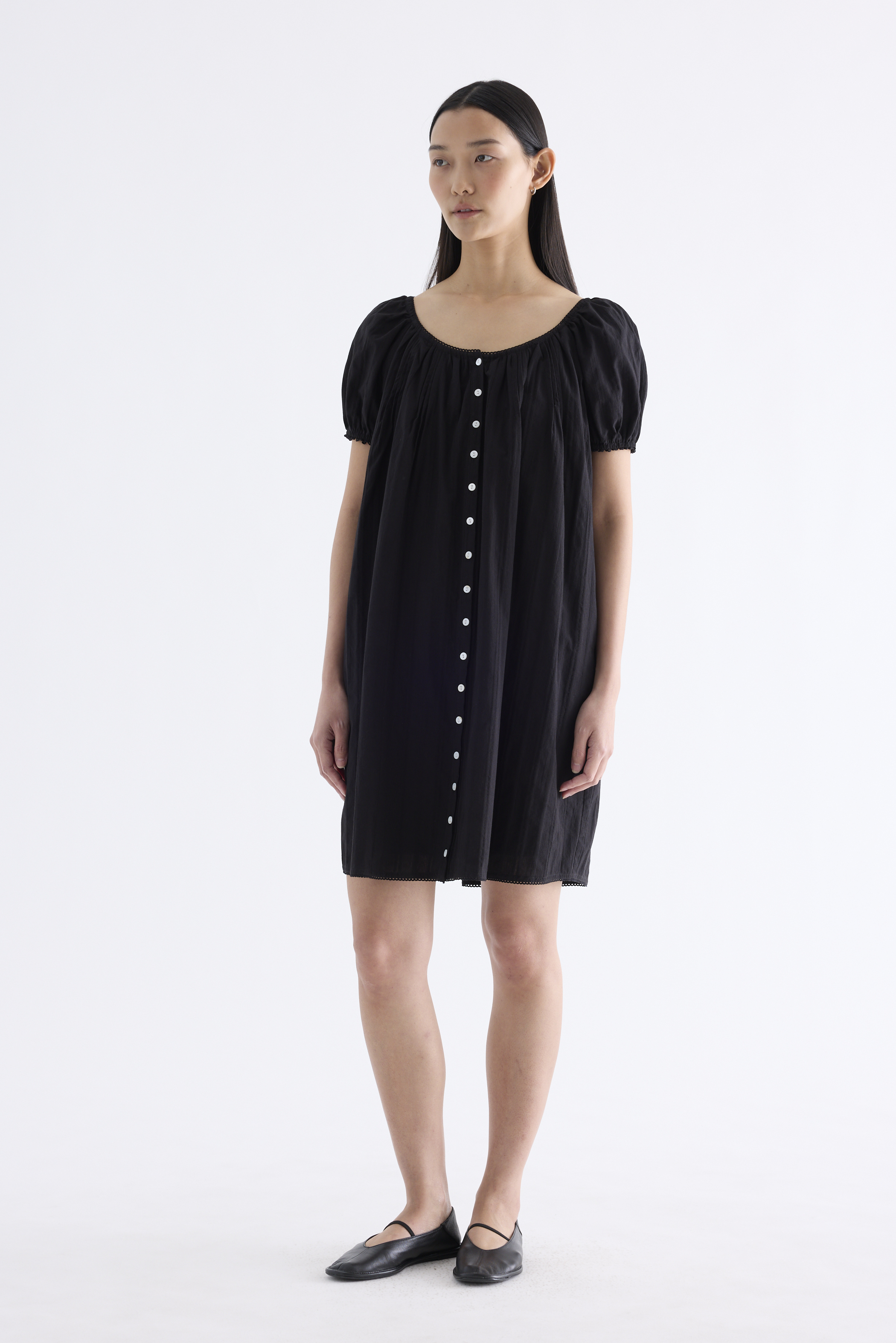 Free and easy. Made from airy and softly structured cotton, this dress features a wide lace-trimmed neckline, short puffy sleeves with elasticated lace-trimmed cuffs and a button-down front. Fits relaxed and above the knee.