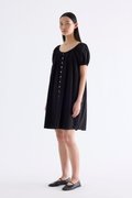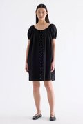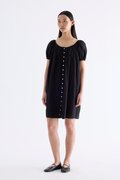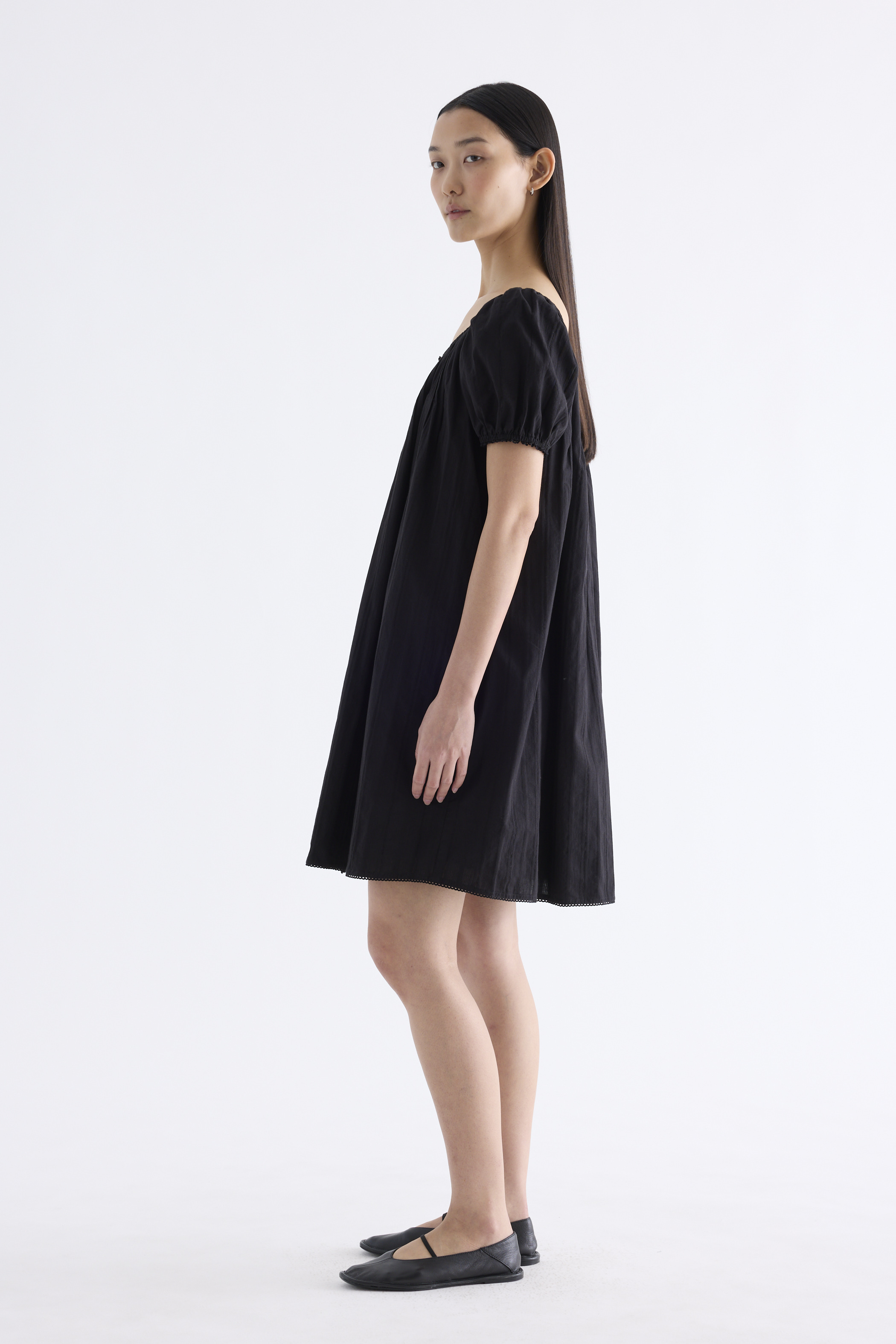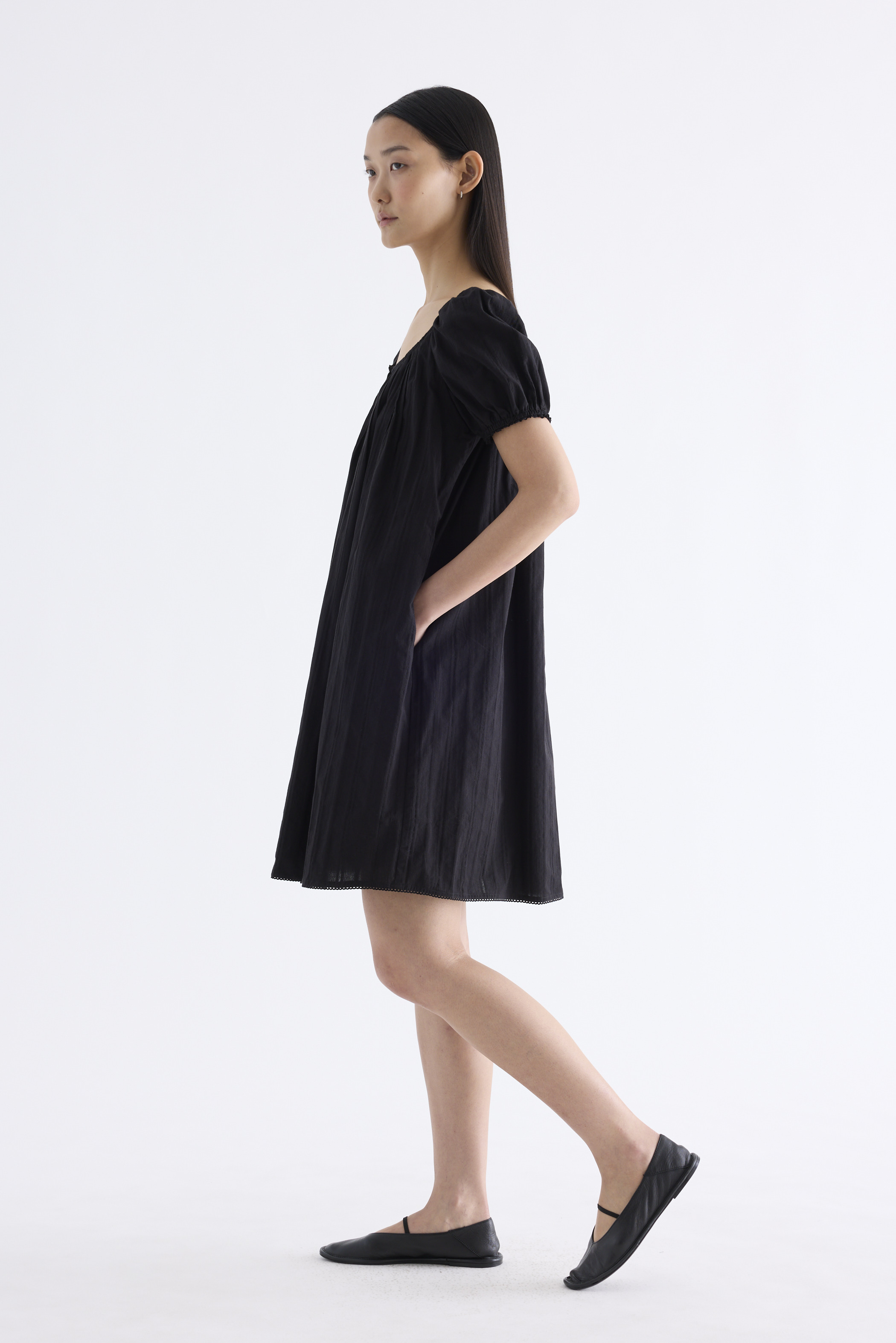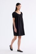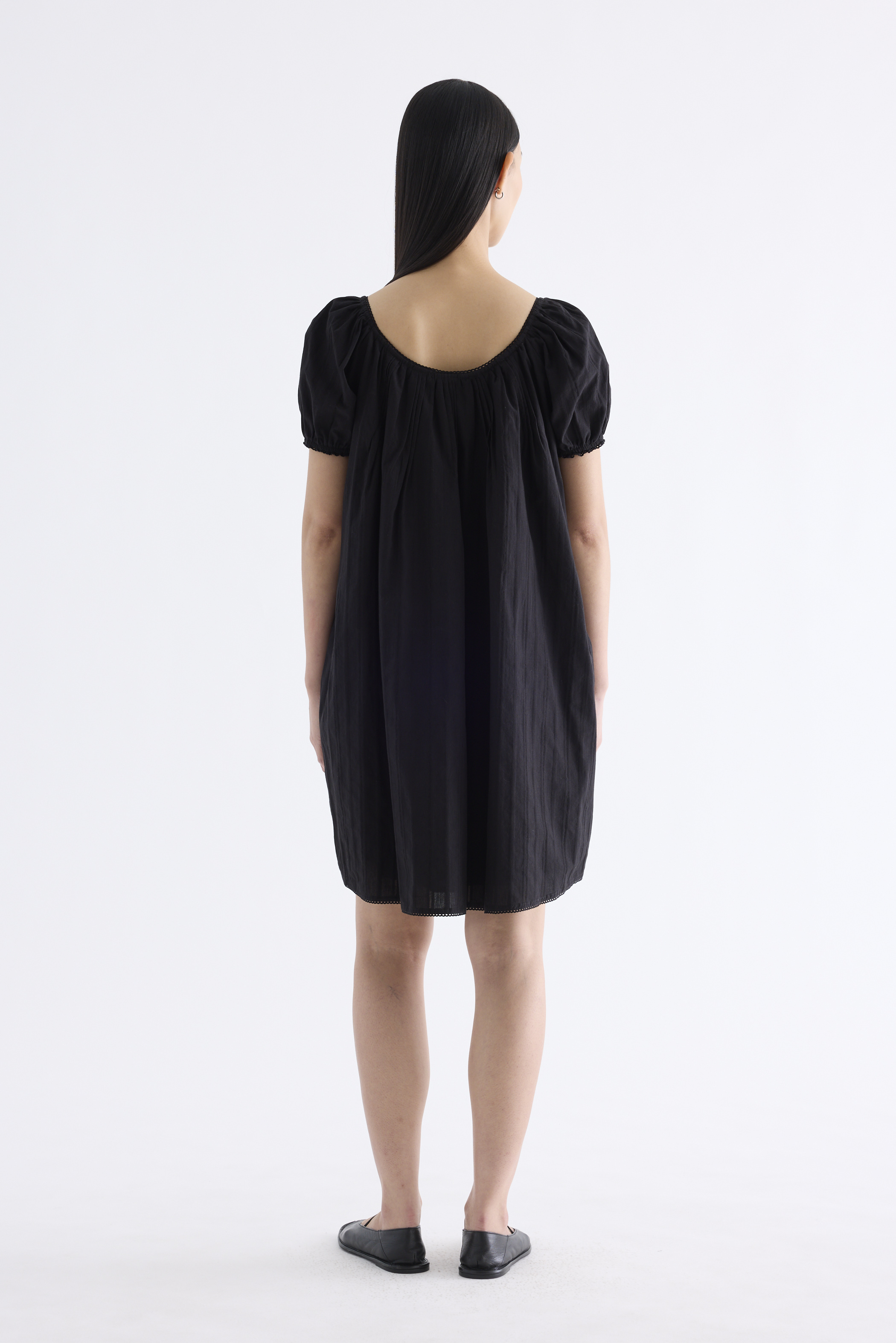 Free and easy. Made from airy and softly structured cotton, this dress features a wide lace-trimmed neckline, short puffy sleeves with elasticated lace-trimmed cuffs and a button-down front. Fits relaxed and above the knee.