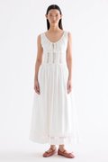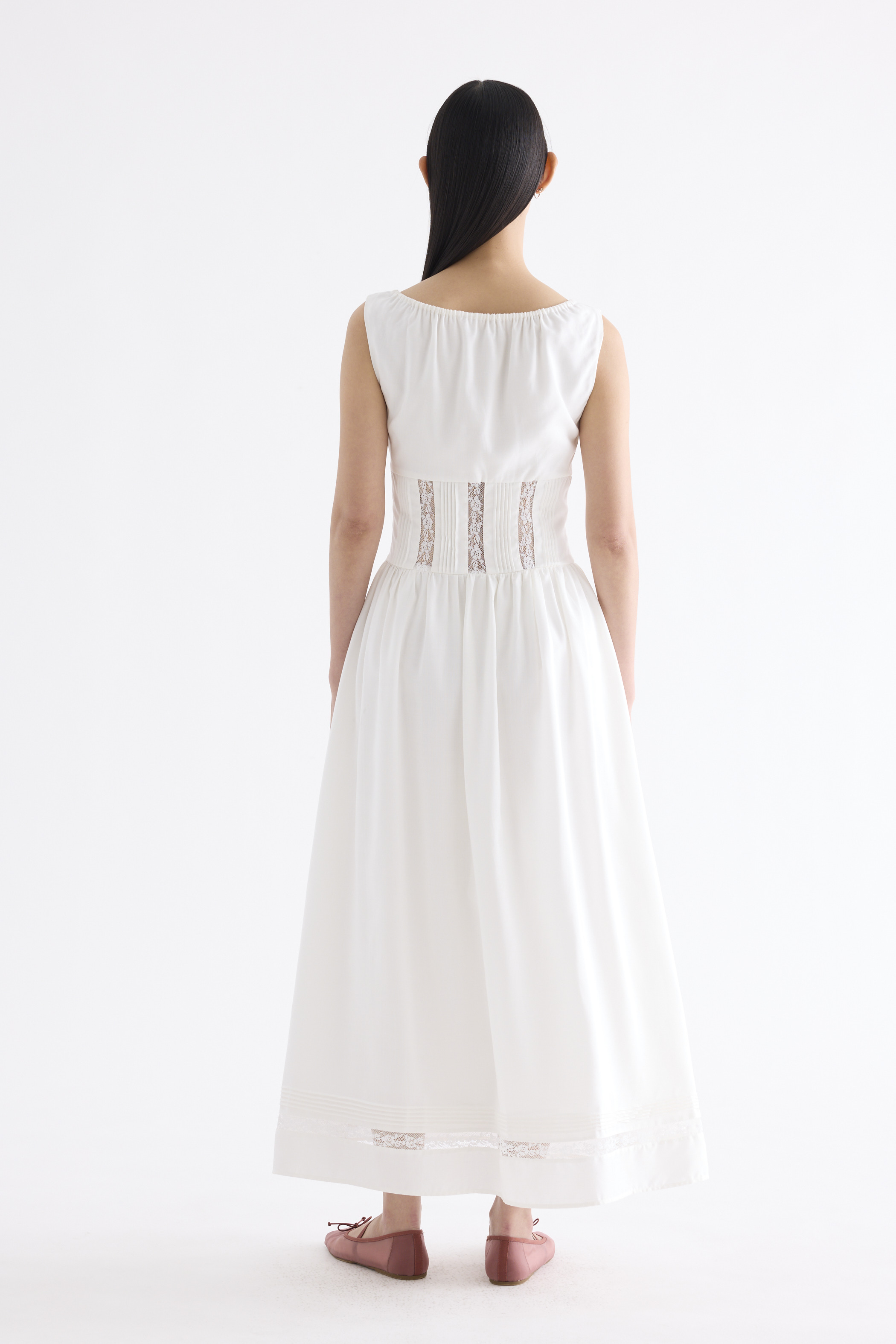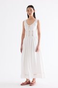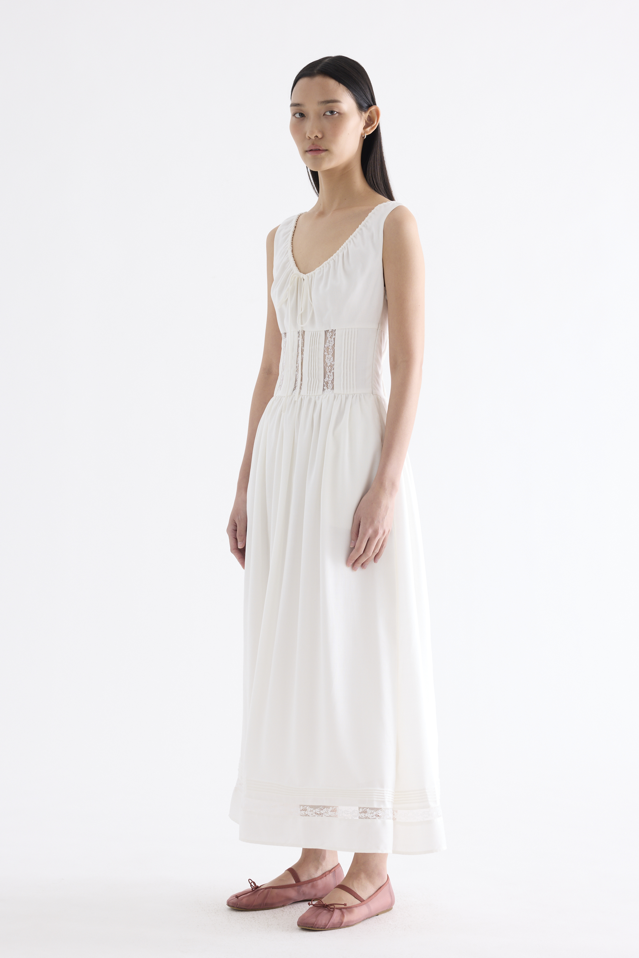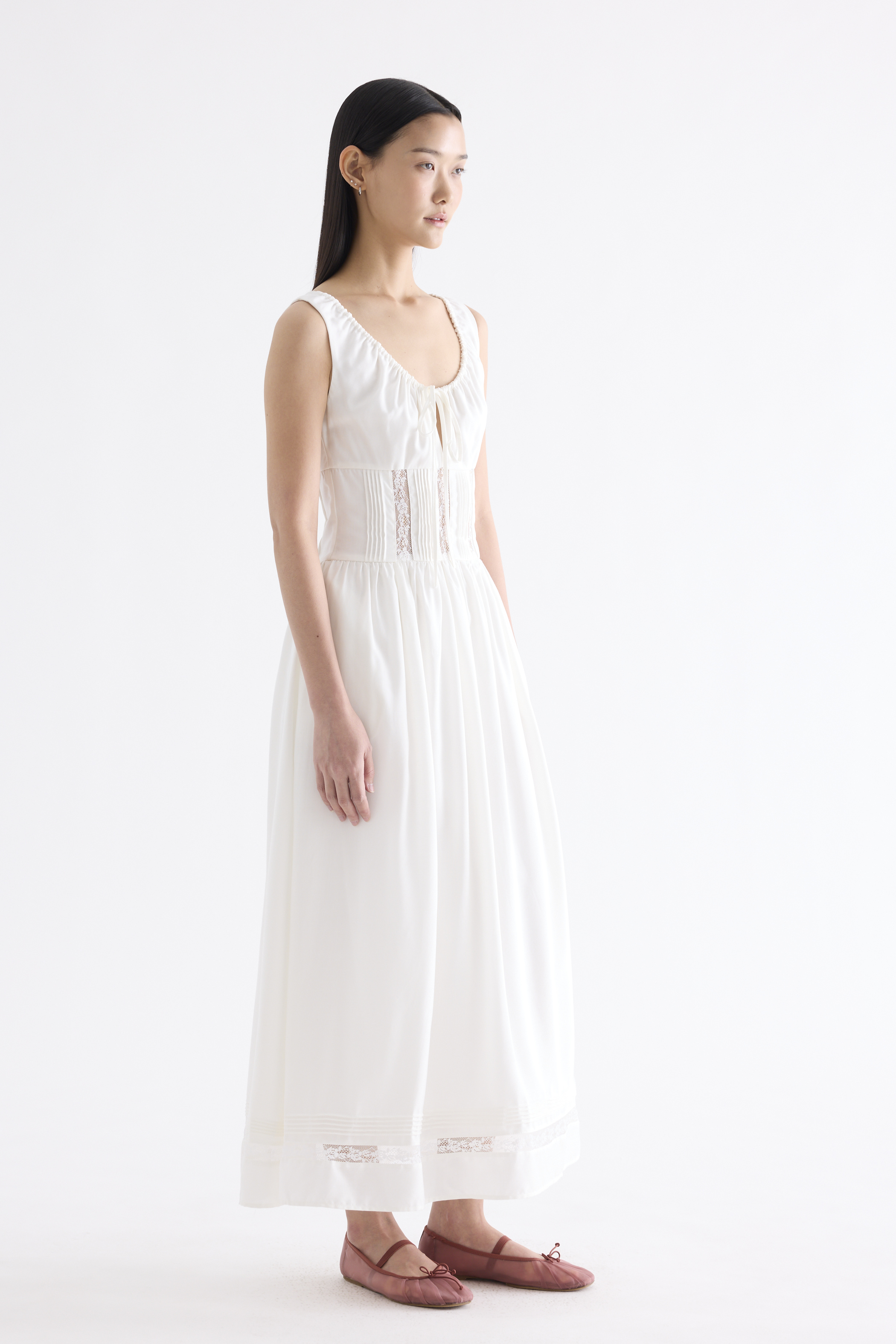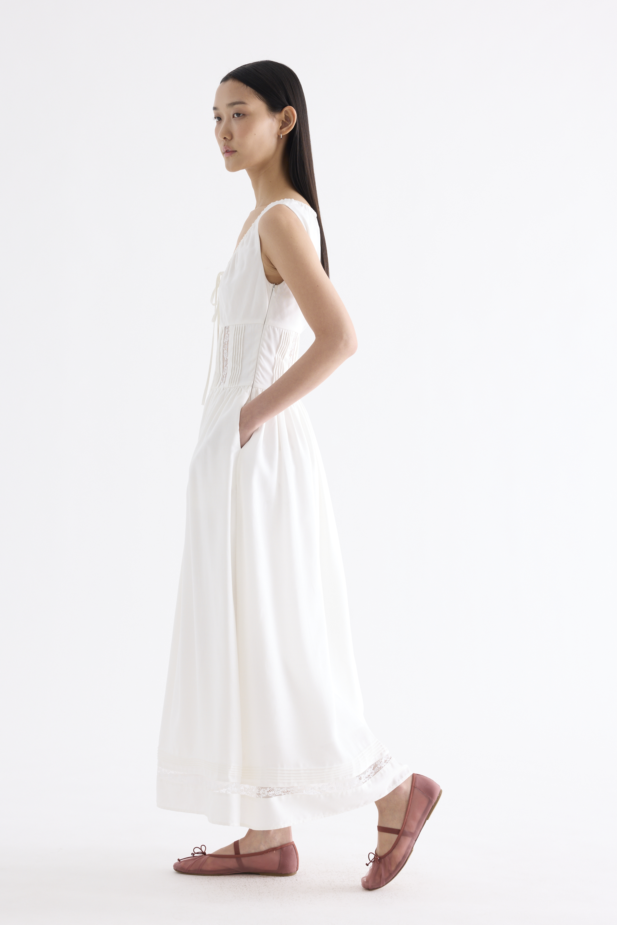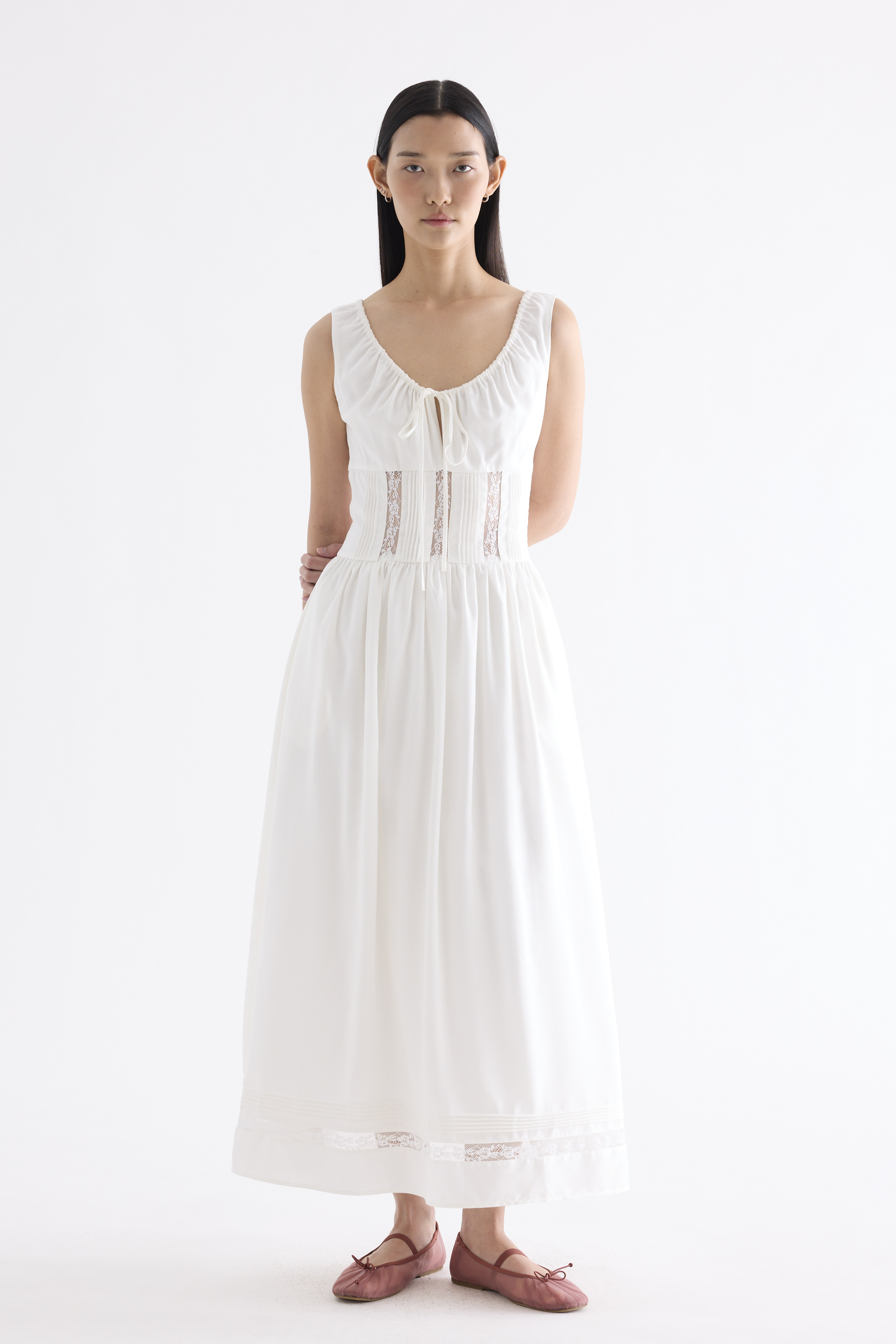 Occasion worthy. Made from smooth and non-stretch Tencel, this sleeveless maxi dress features a round drawstring neckline, front slit with a tie-strap closure, waist panel with lace panels and pin-tuck pleats, as well as a side zip closure. Worn in an A-line silhouette that flows out at the waist into a relaxed skirt.