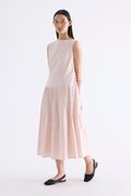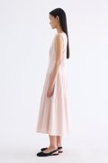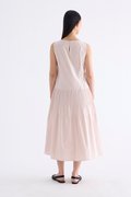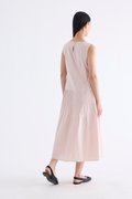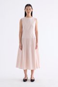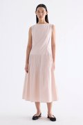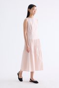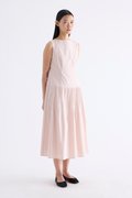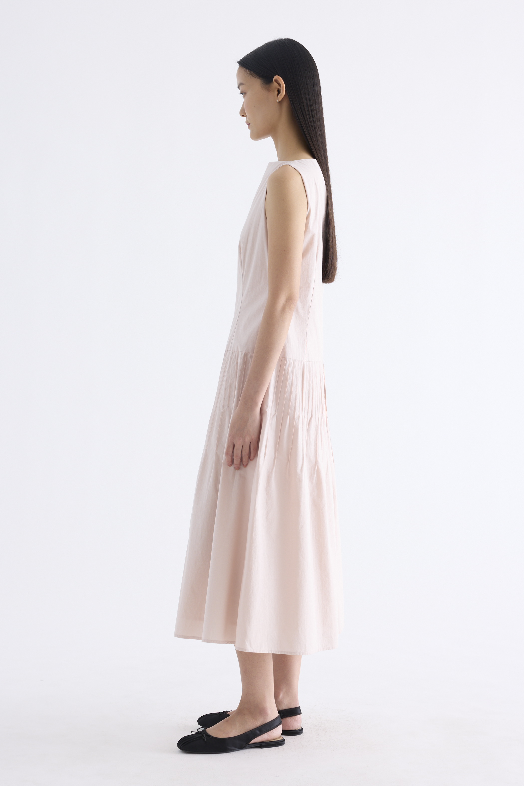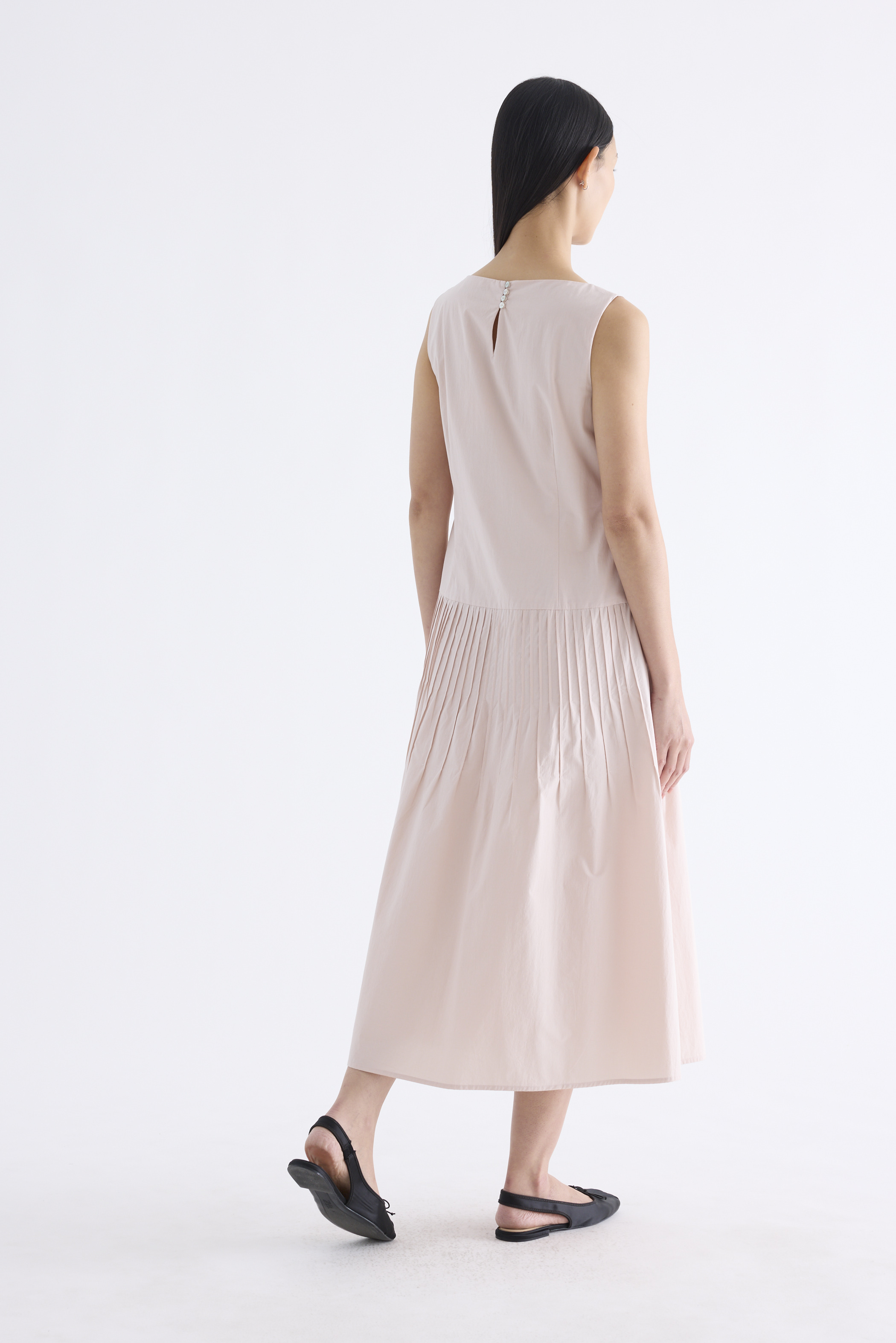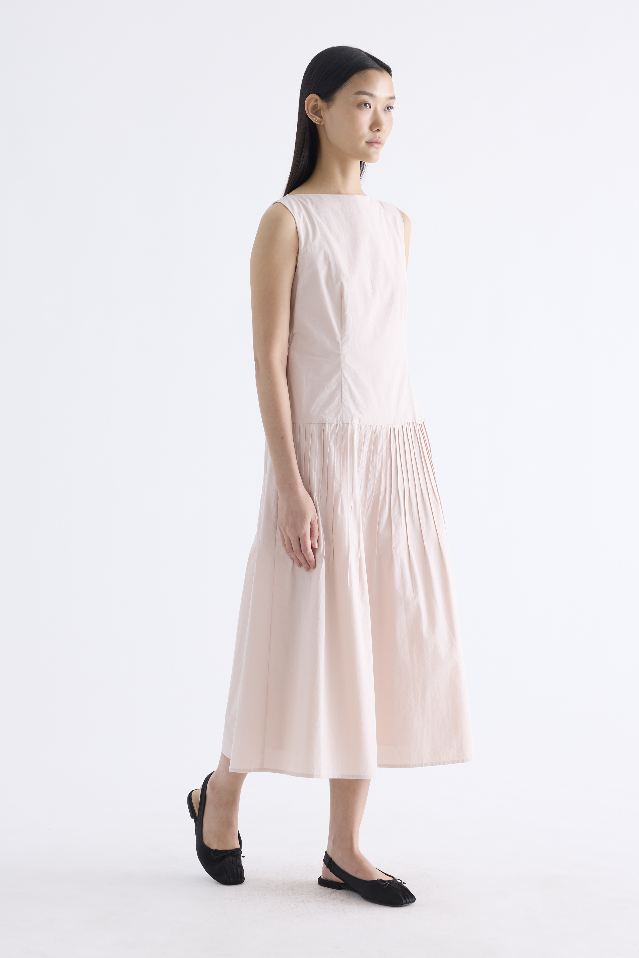 Textured. Made from crisp and softly structured cotton, this sleeveless maxi dress features a boat neckline, pleated waist, side zip and buttoned keyhole opening at the back. Worn in an A-line silhouette that fits slimmer at the waist.