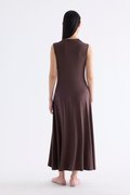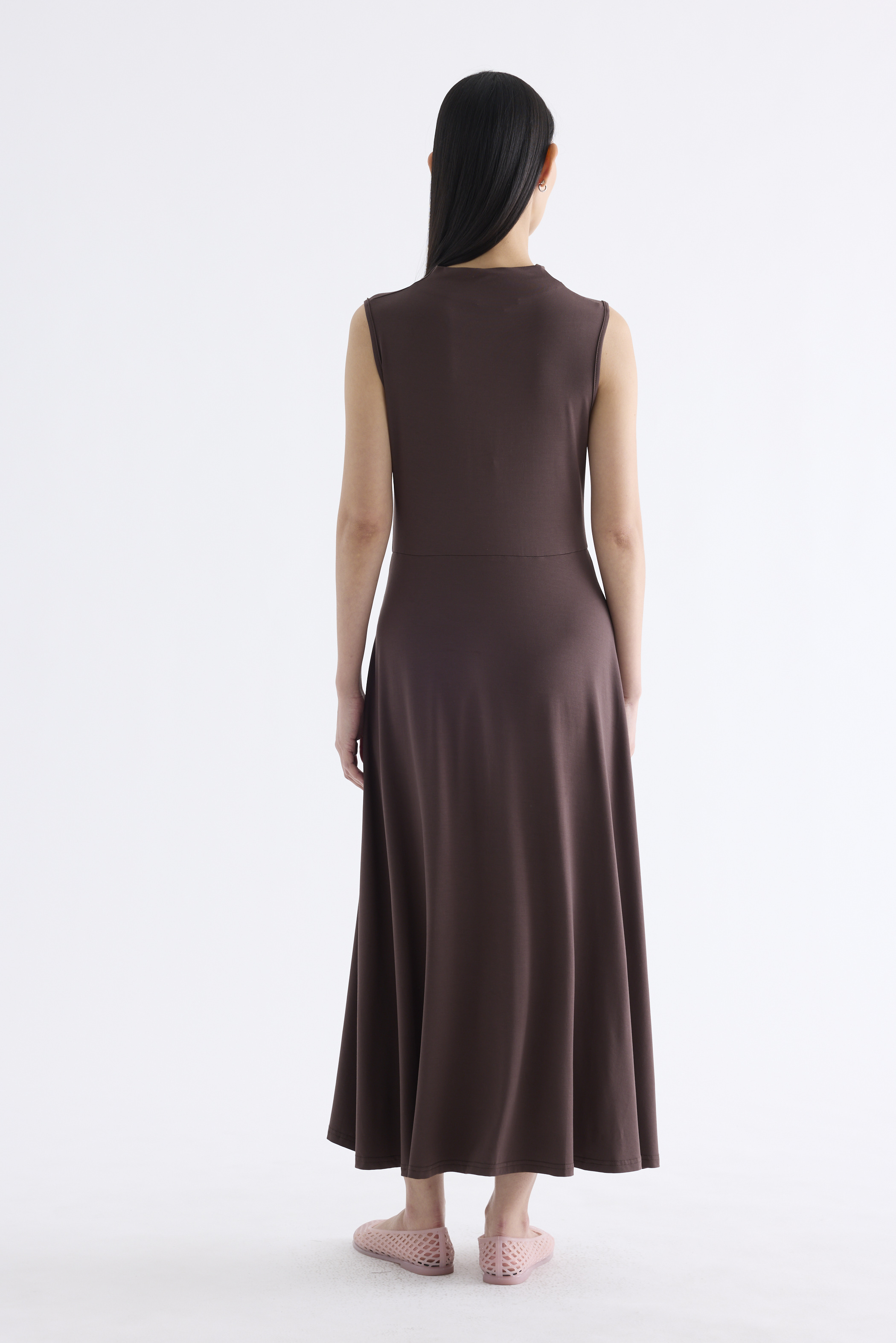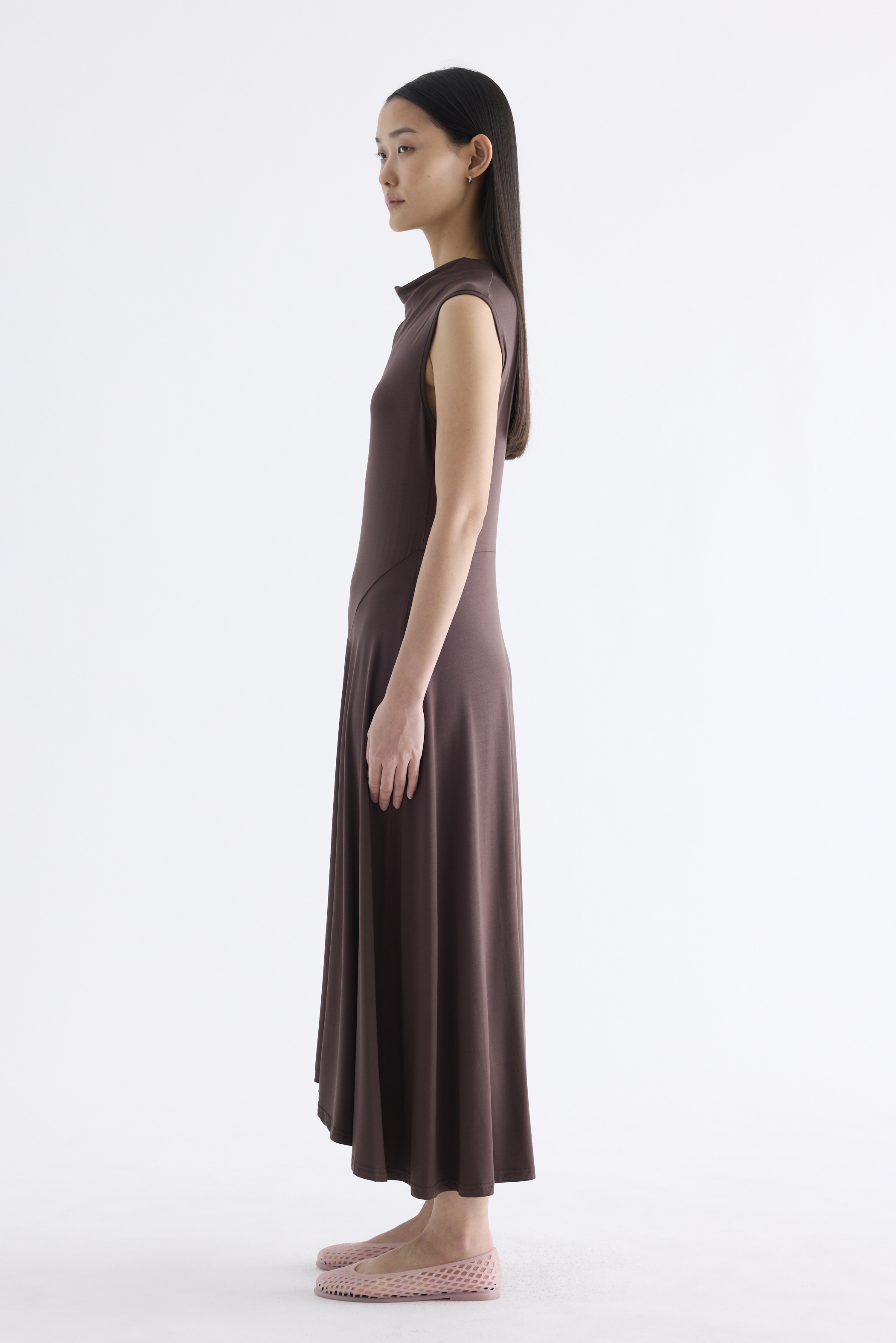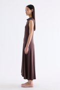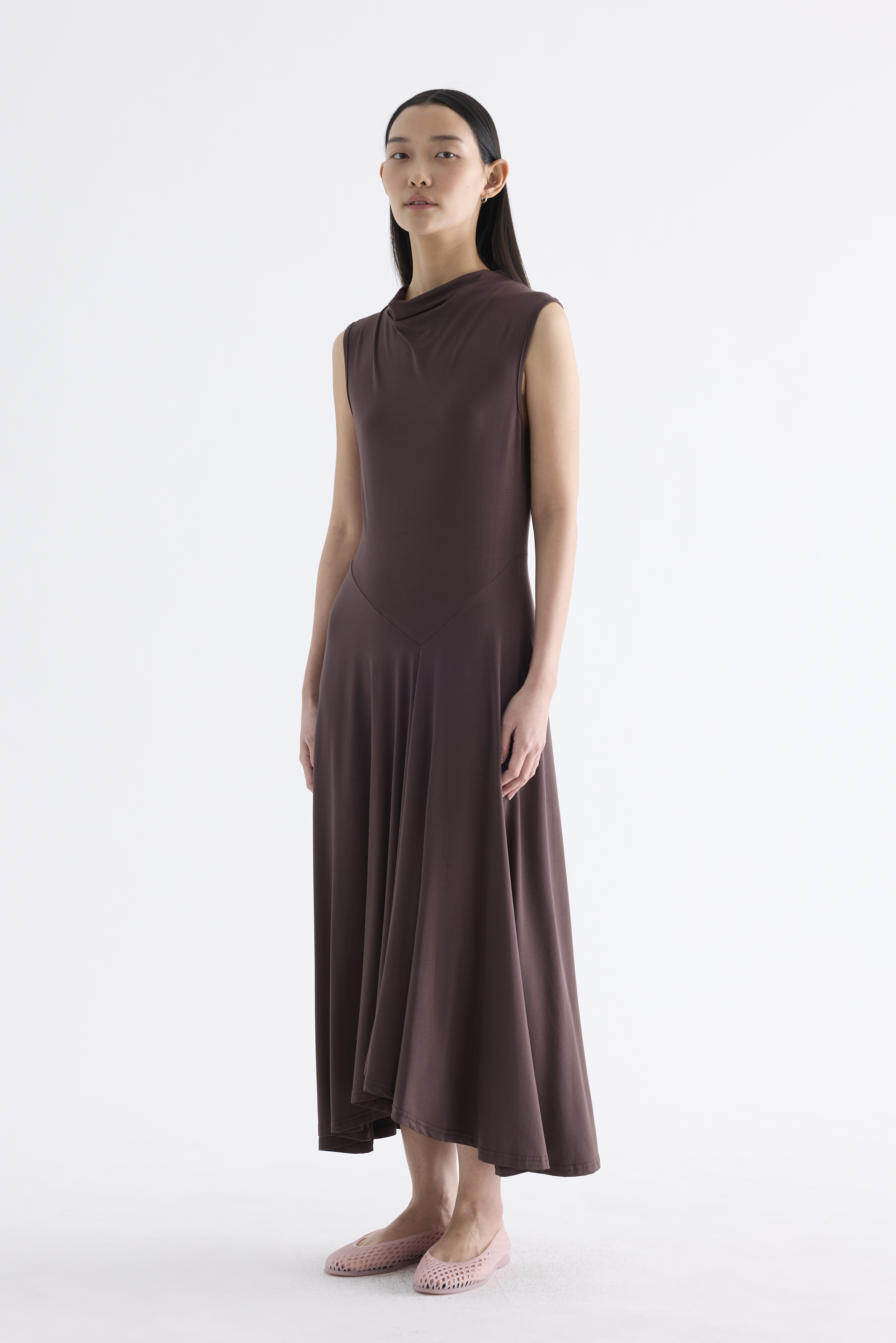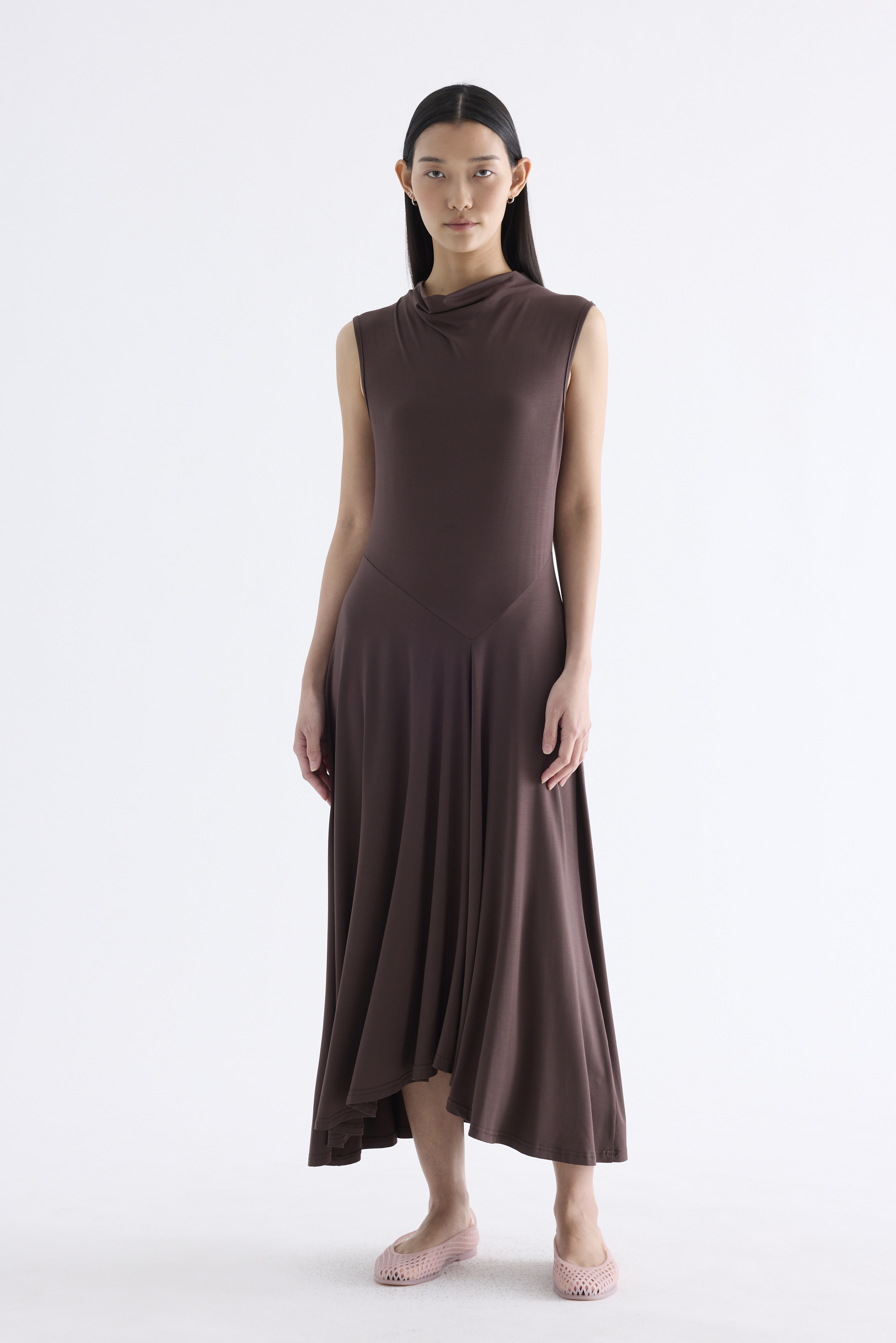 Go with the flow. Made from smooth and stretchy fabric, this sleeveless maxi dress features a draped neckline, an asymmetrical waist panel and a waterfall hem. Worn in a relaxed, body-skimming fit.