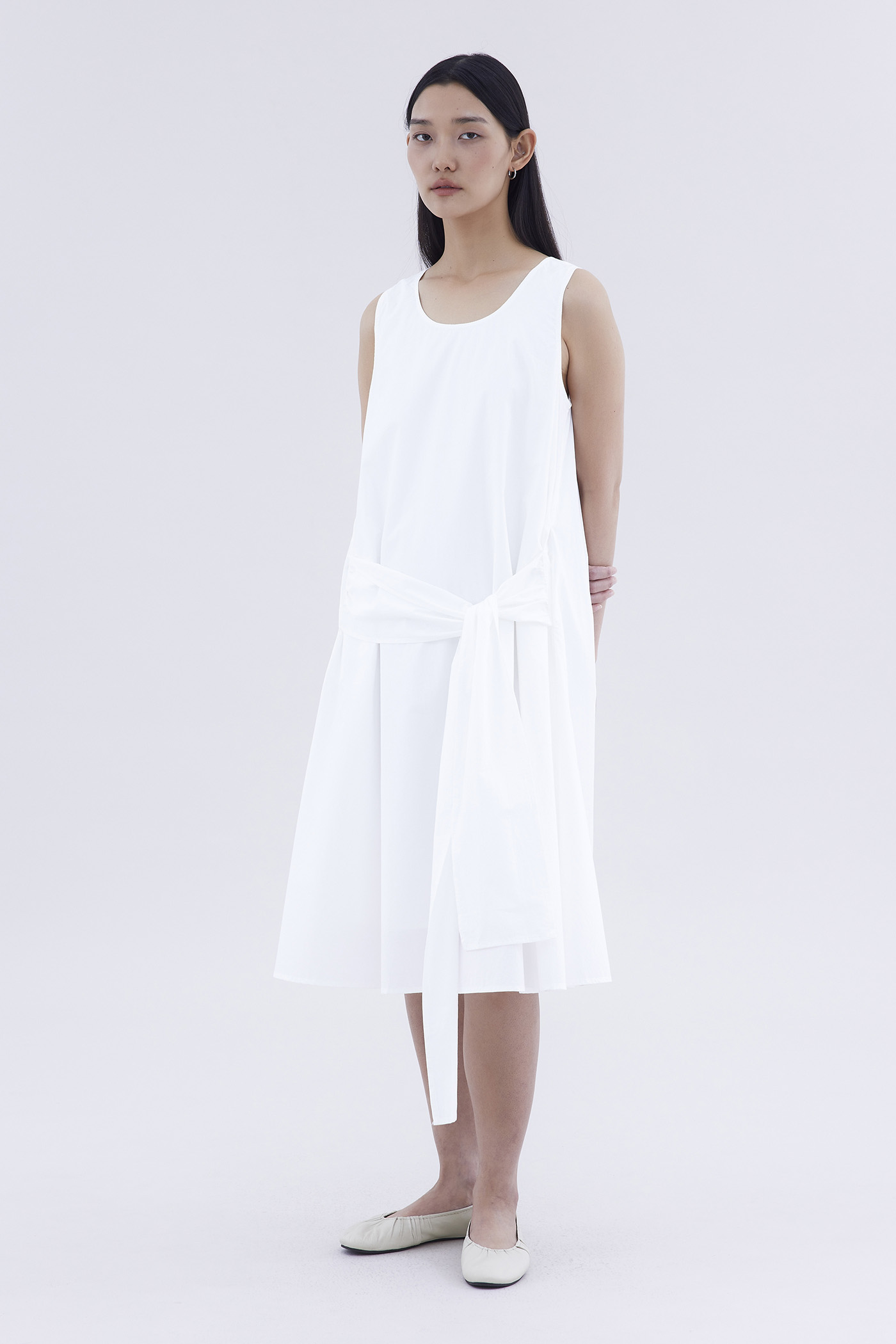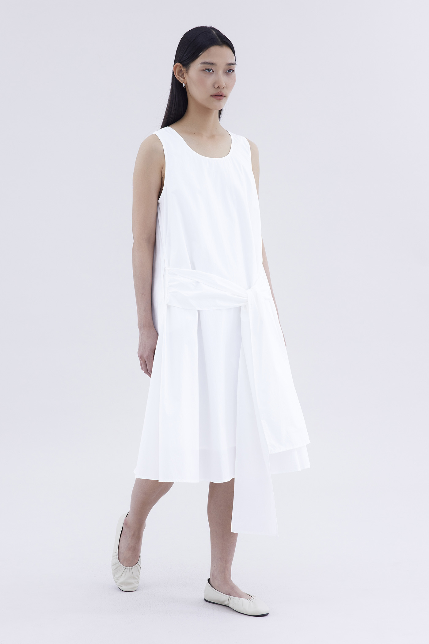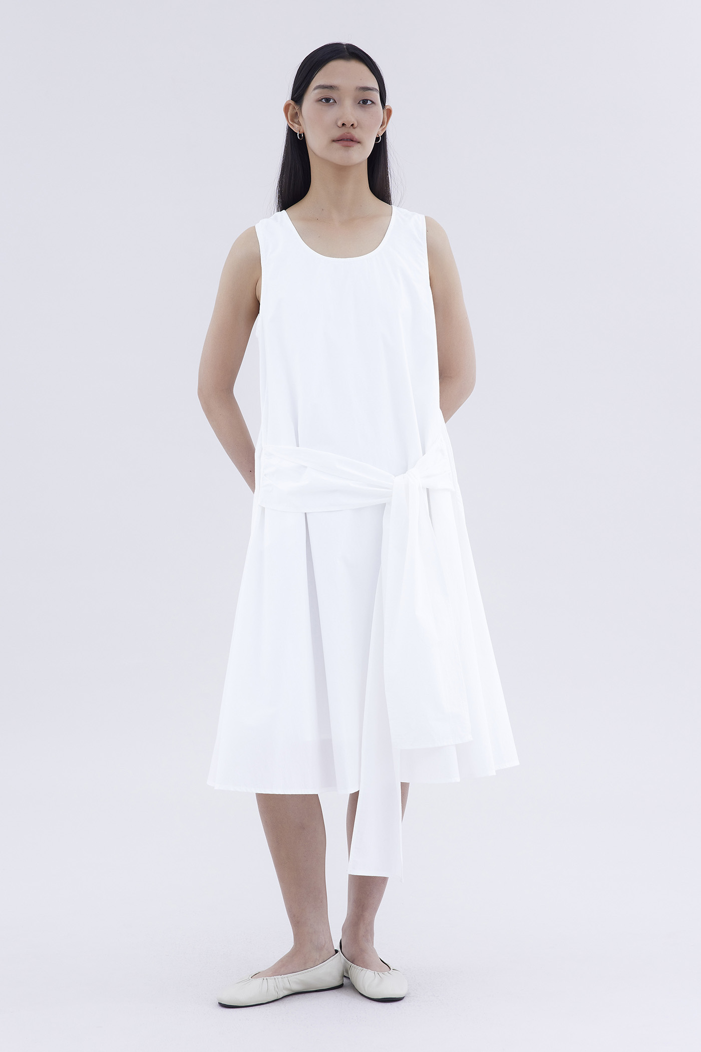 One-piece wonder. Made from crisp and softly structured cotton, this sleeveless maxi dress features a round neckline, waist tie-strap and draped front. Worn in a relaxed fit.