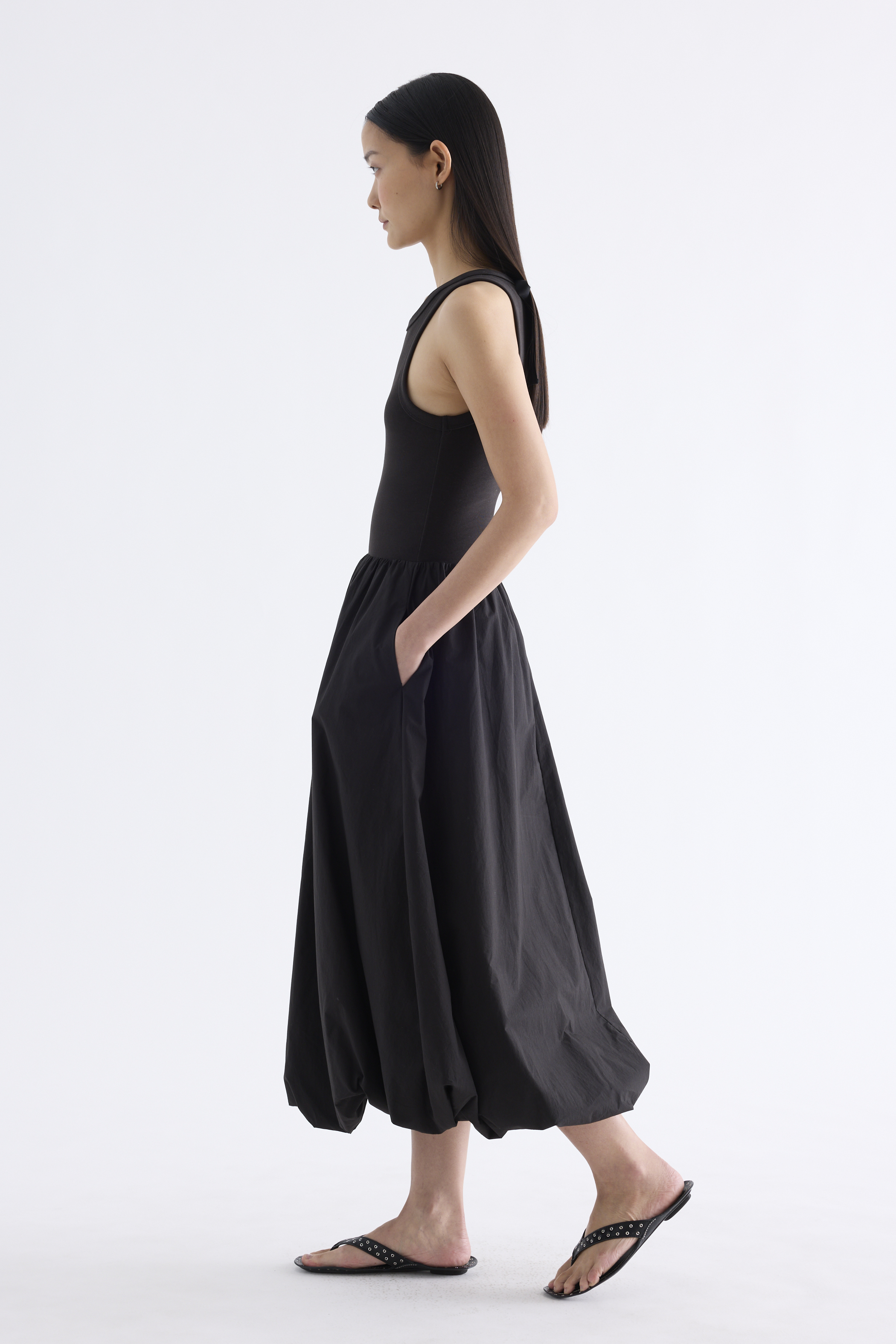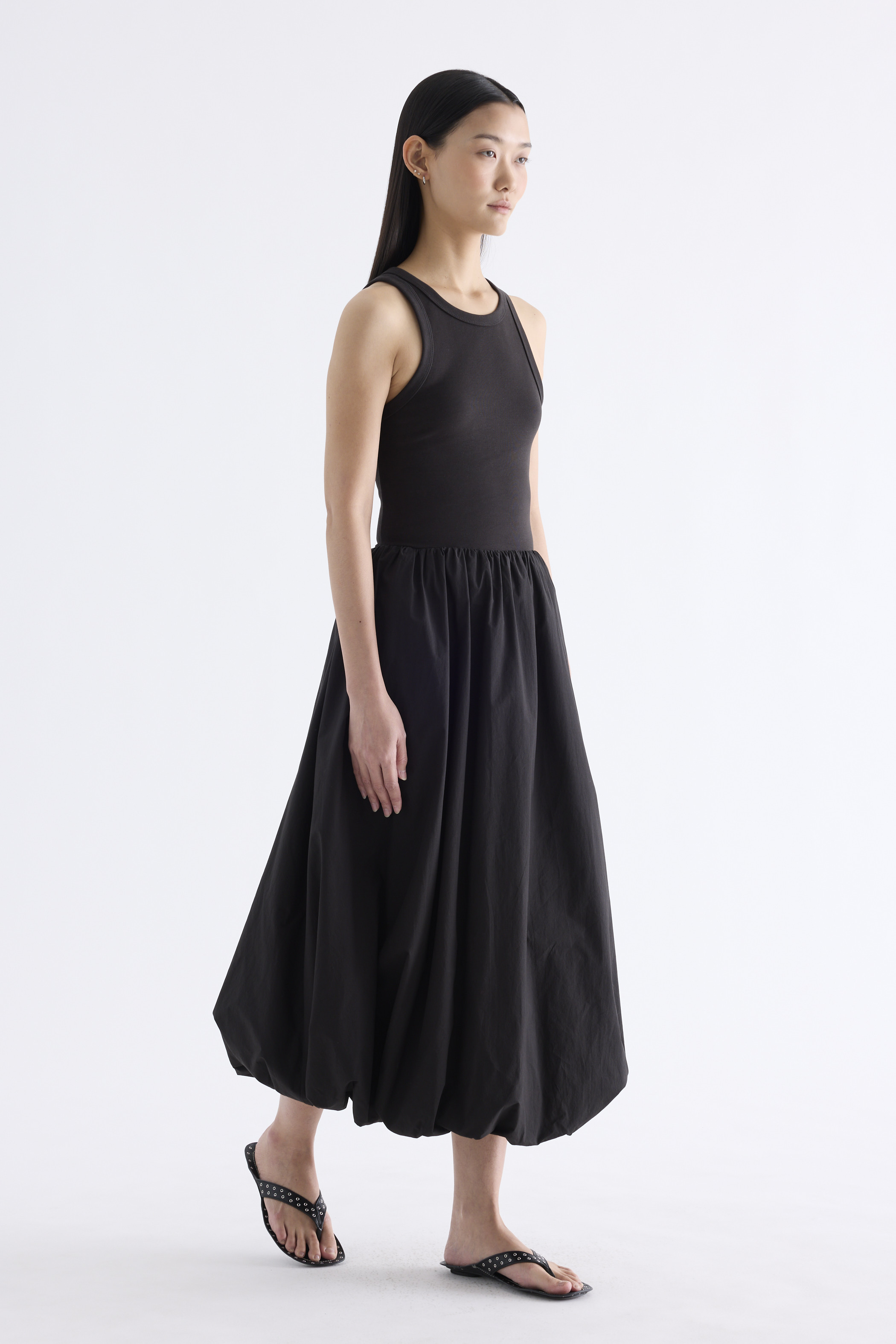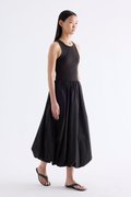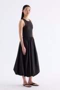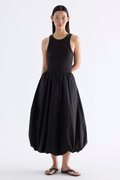 Occasion ready. This maxi dress features a stretchy tank top with a round neckline, a back opening with ribbon tie-strap closures and a bubble skirt cut from crisp, softly structured cotton. Worn in an A-line silhouette that fits slimmer through the bodice before flaring out at the waist.