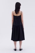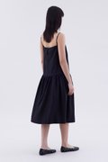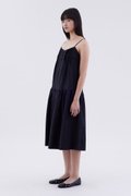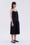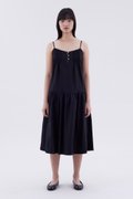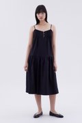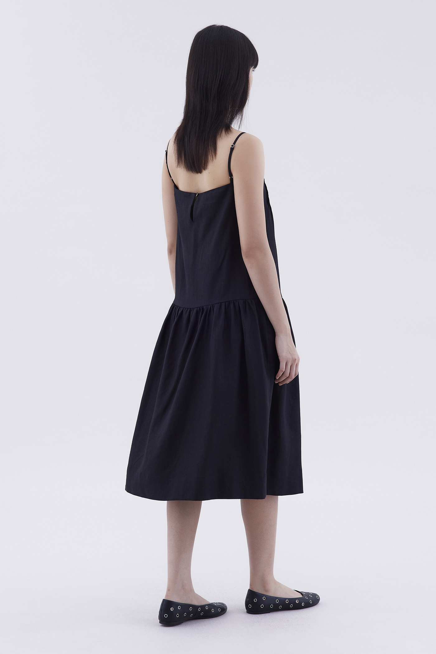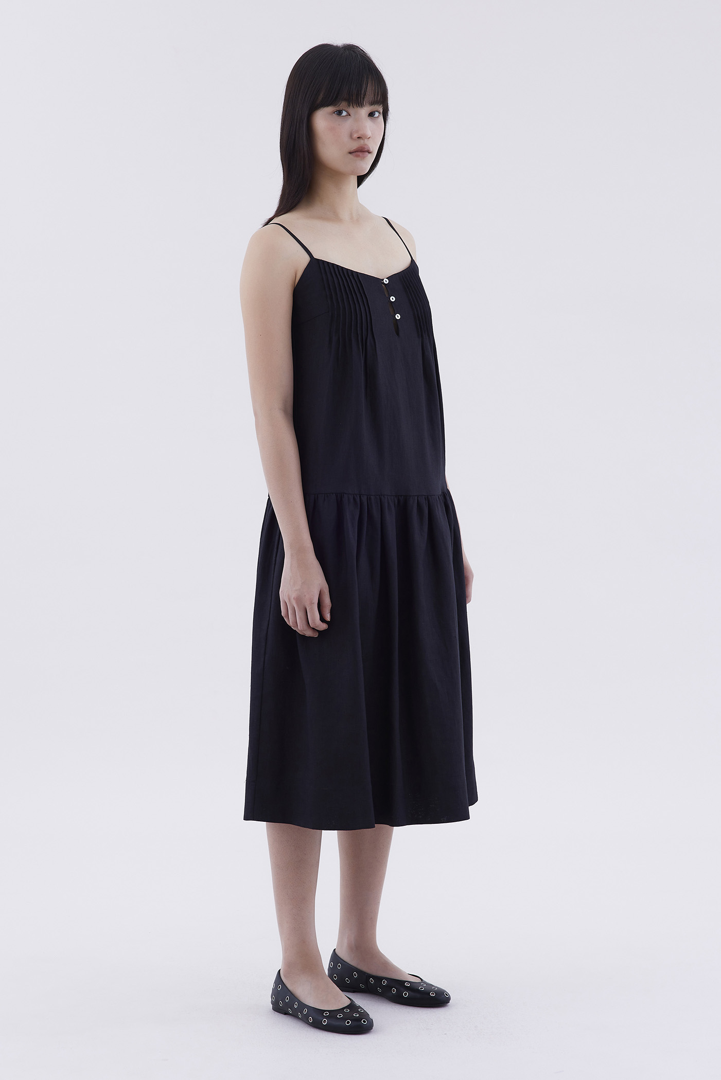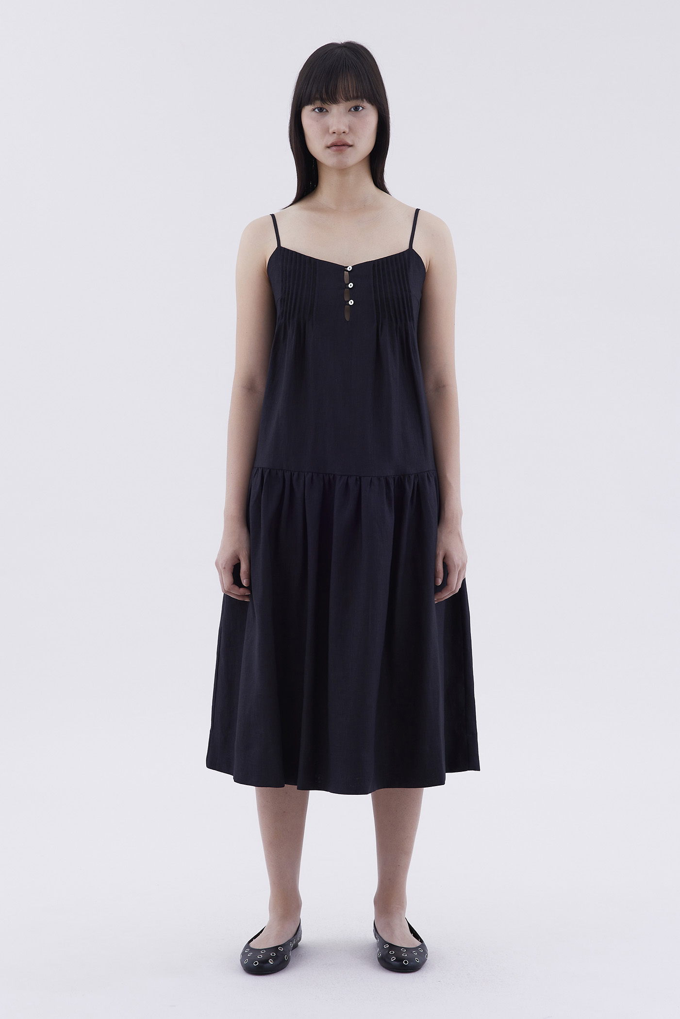 Keep it low. Cut from airy and gently tailored 100% linen, this sleeveless midi dress features a dropped waist, slim adjustable shoulder straps, front buttons, pin-tuck pleats and a buttoned keyhole opening at the back. Worn in a relaxed fit.
