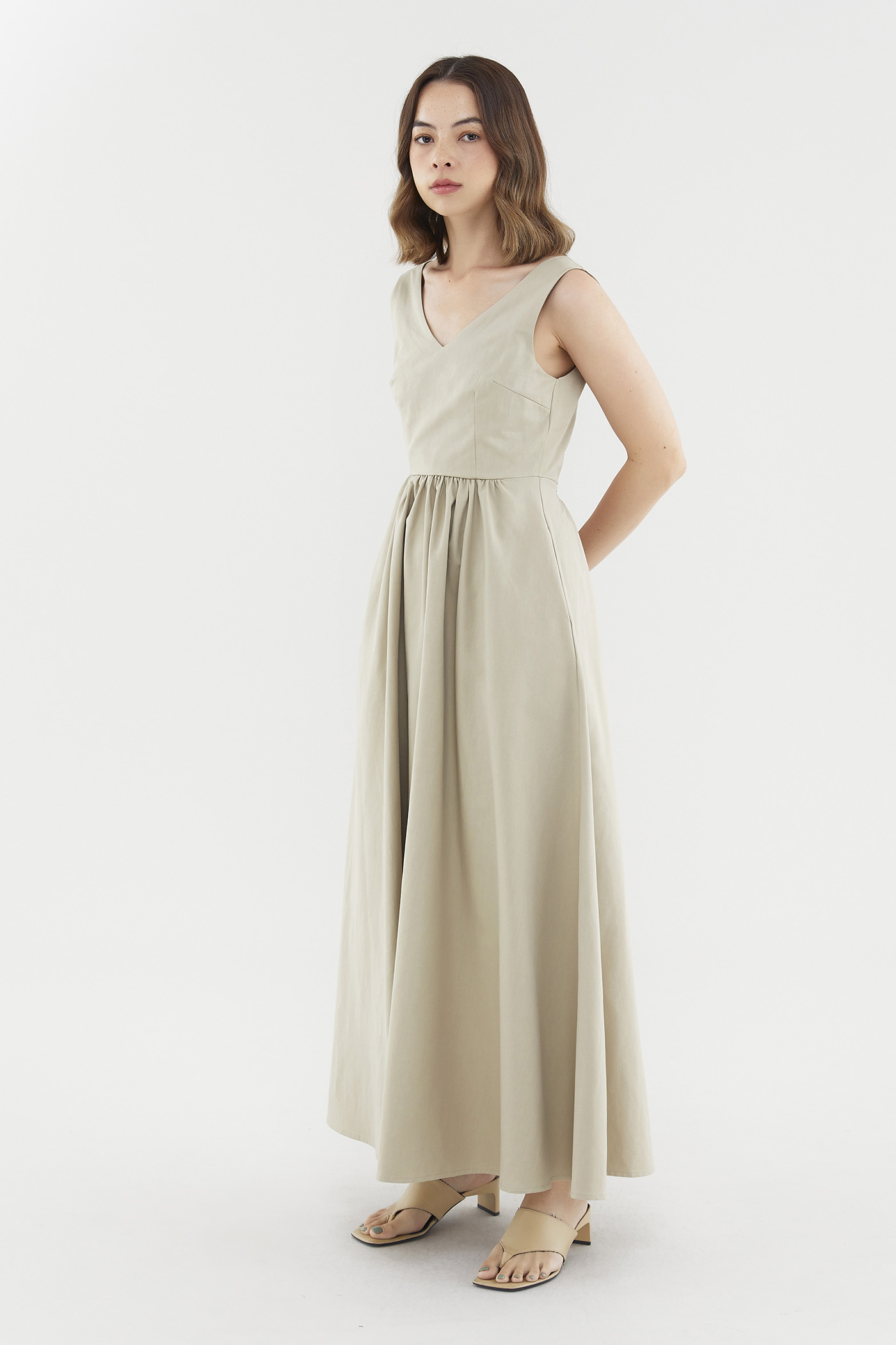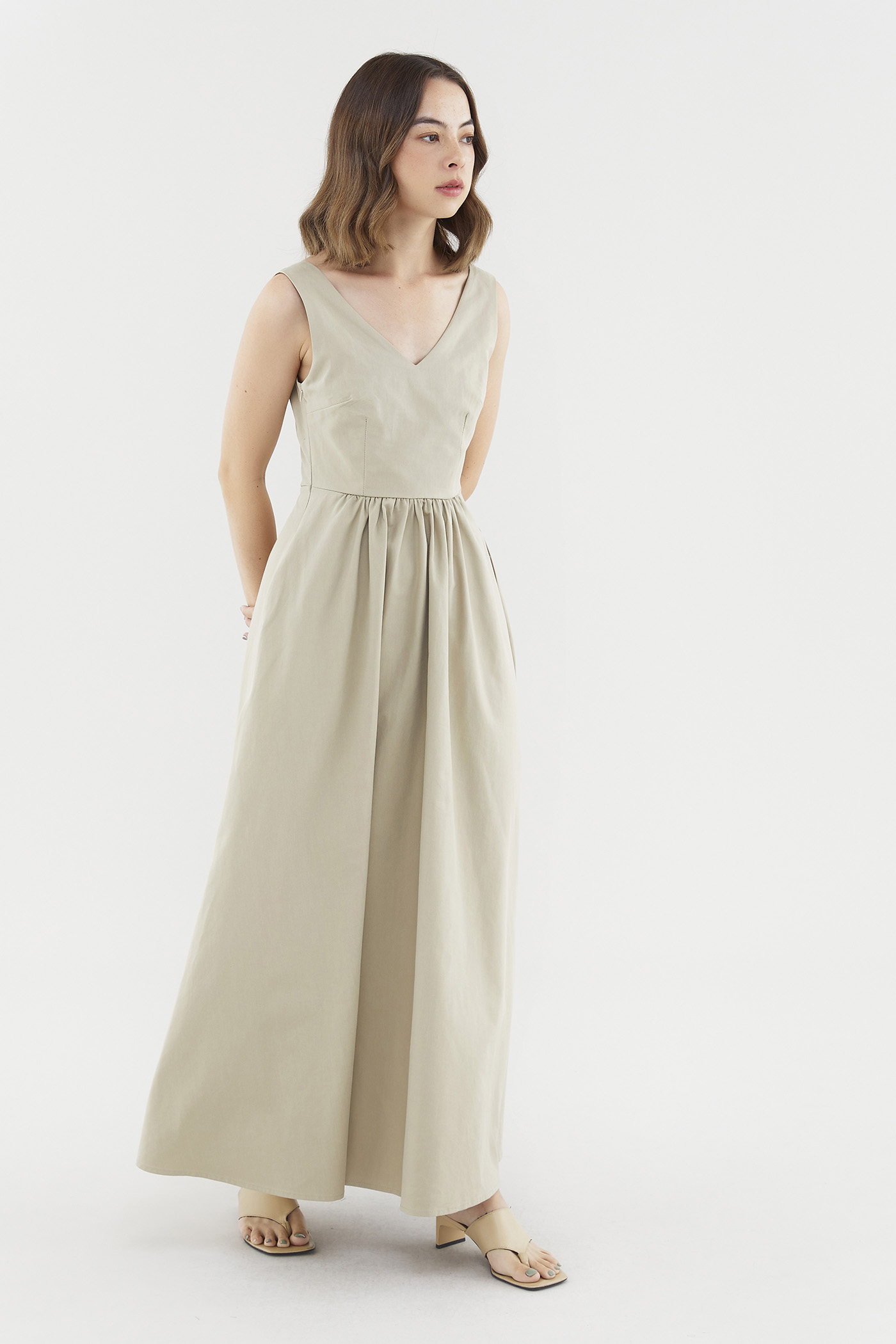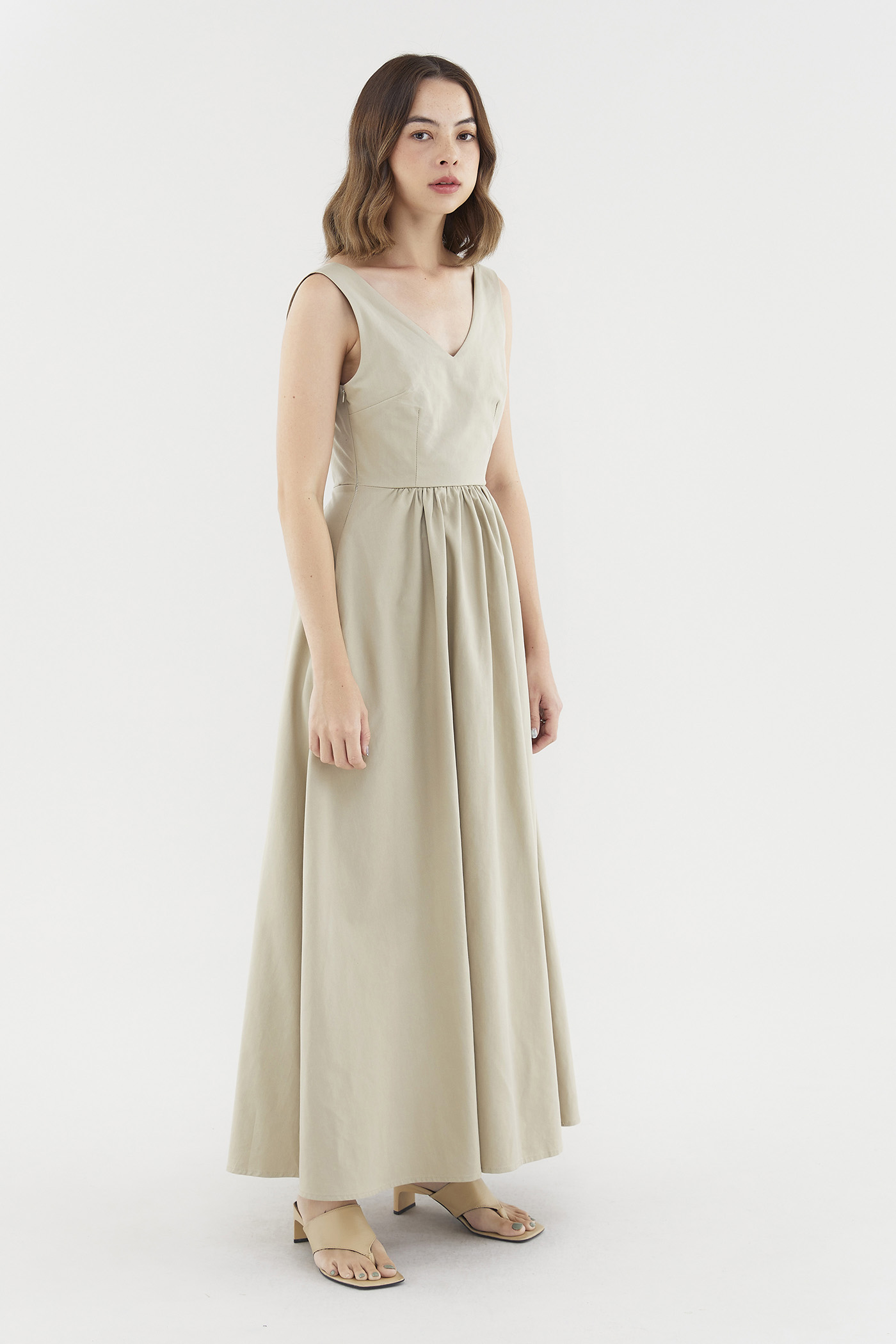 Occasion ready. Cut from non-stretch, softly tailored fabric, this sleeveless maxi dress features a deep V-neckline, wide non-adjustable shoulder straps, a back cutout with a centre strap, a fitted, partially elasticated waist and a side zip closure. Worn in a flattering A-line silhouette that fits slimmer through the bodice before flaring out in a relaxed skirt.