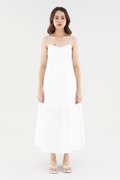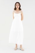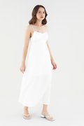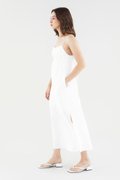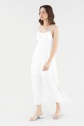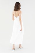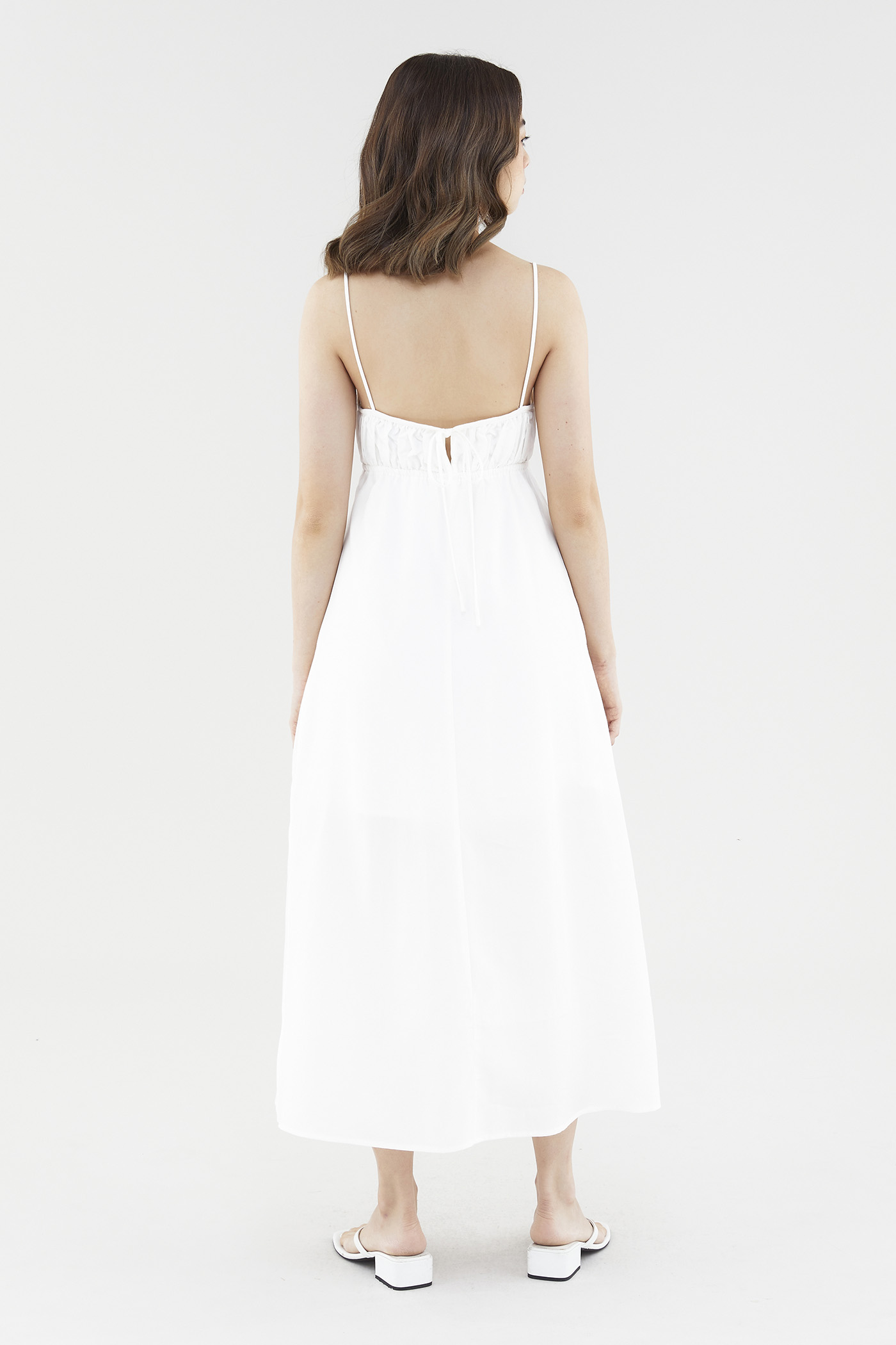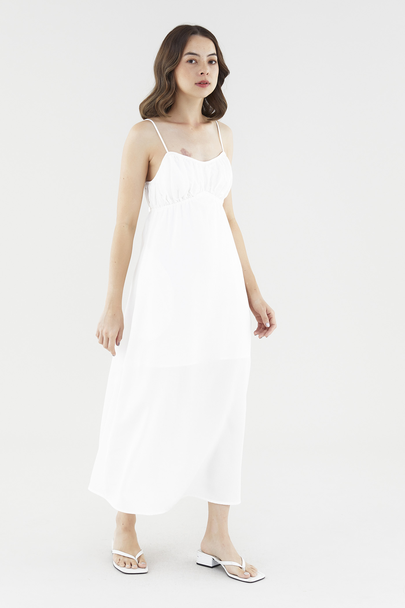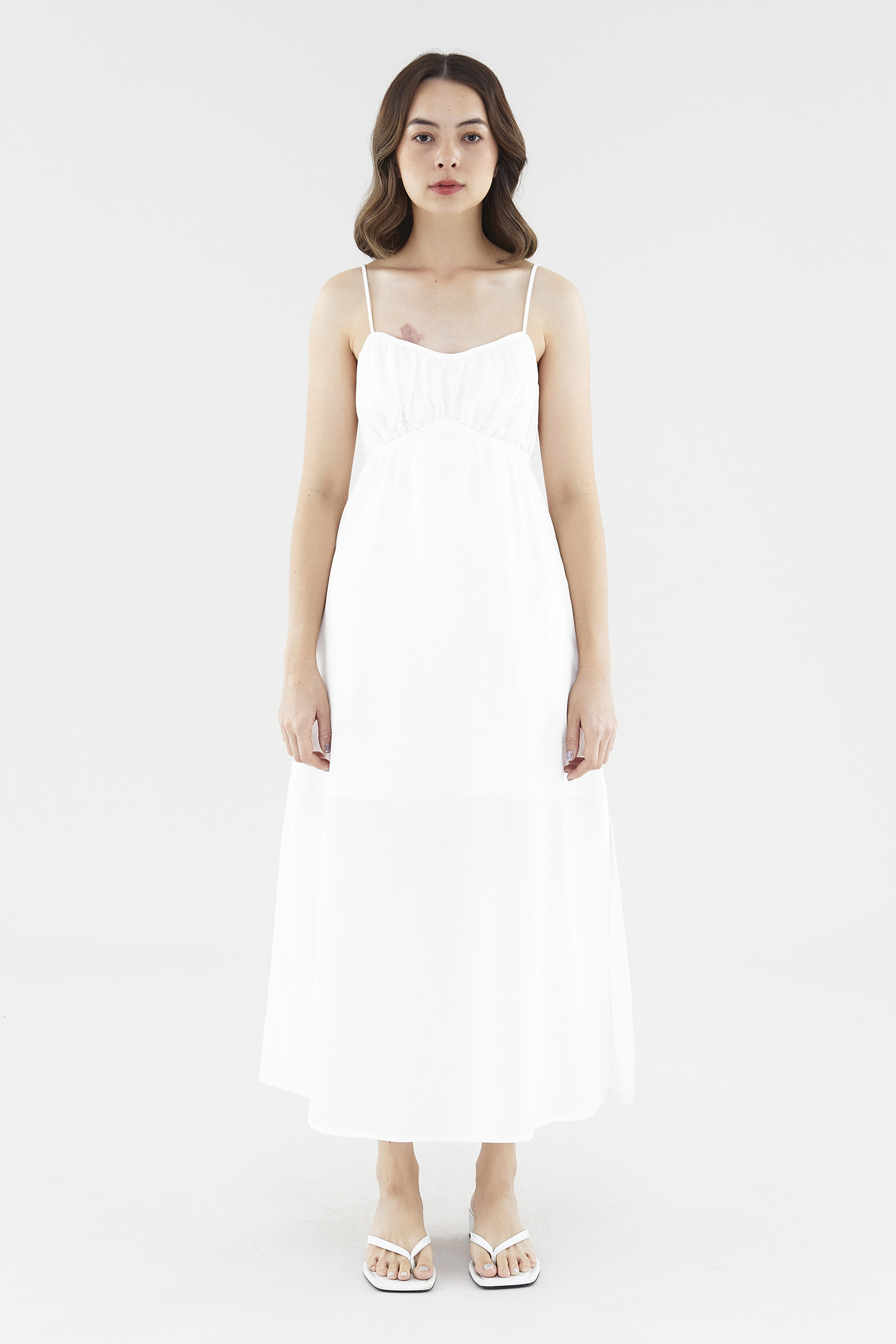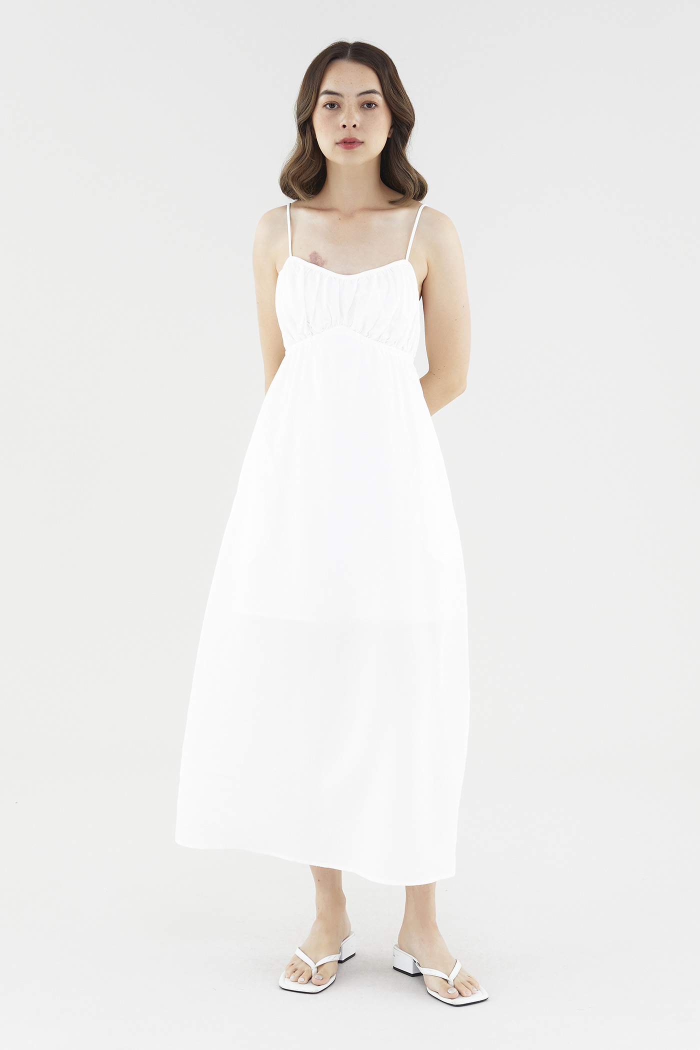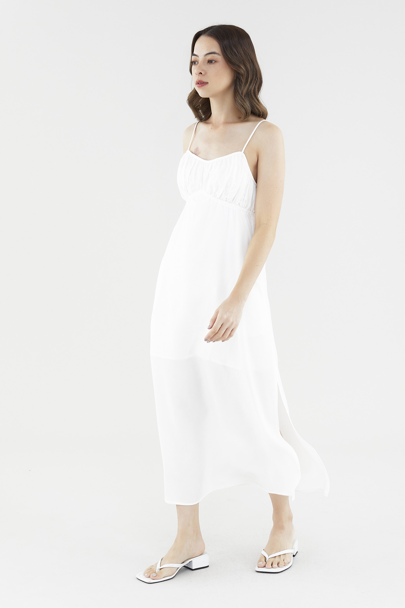 Timelessly flattering. Made from non-stretch fabric with a structured drape, this sleeveless maxi dress features a dipped neckline, slim non-adjustable straps, a ruched bust and a tie-strap on the back. Fits slimmer at the bust before flowing out in a relaxed skirt with a side split.