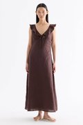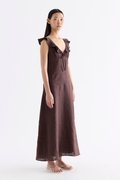 Statement collars. Cut from airy and gently tailored 100% linen, this sleeveless maxi dress features a V-neckline with ruffled and oversized lace-trimmed collars, a ruched bust with ladder lace details and a front tie-strap. Fits slim with a side zip closure.