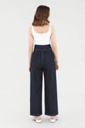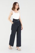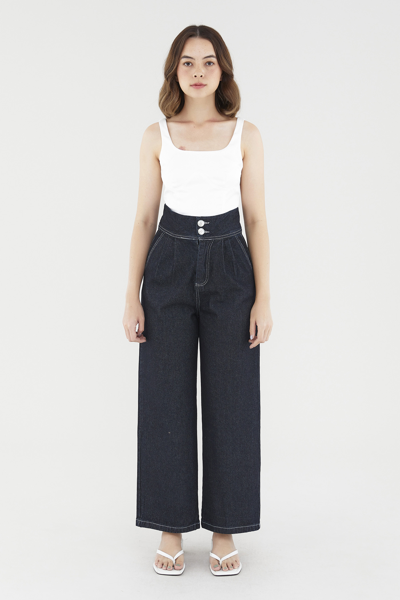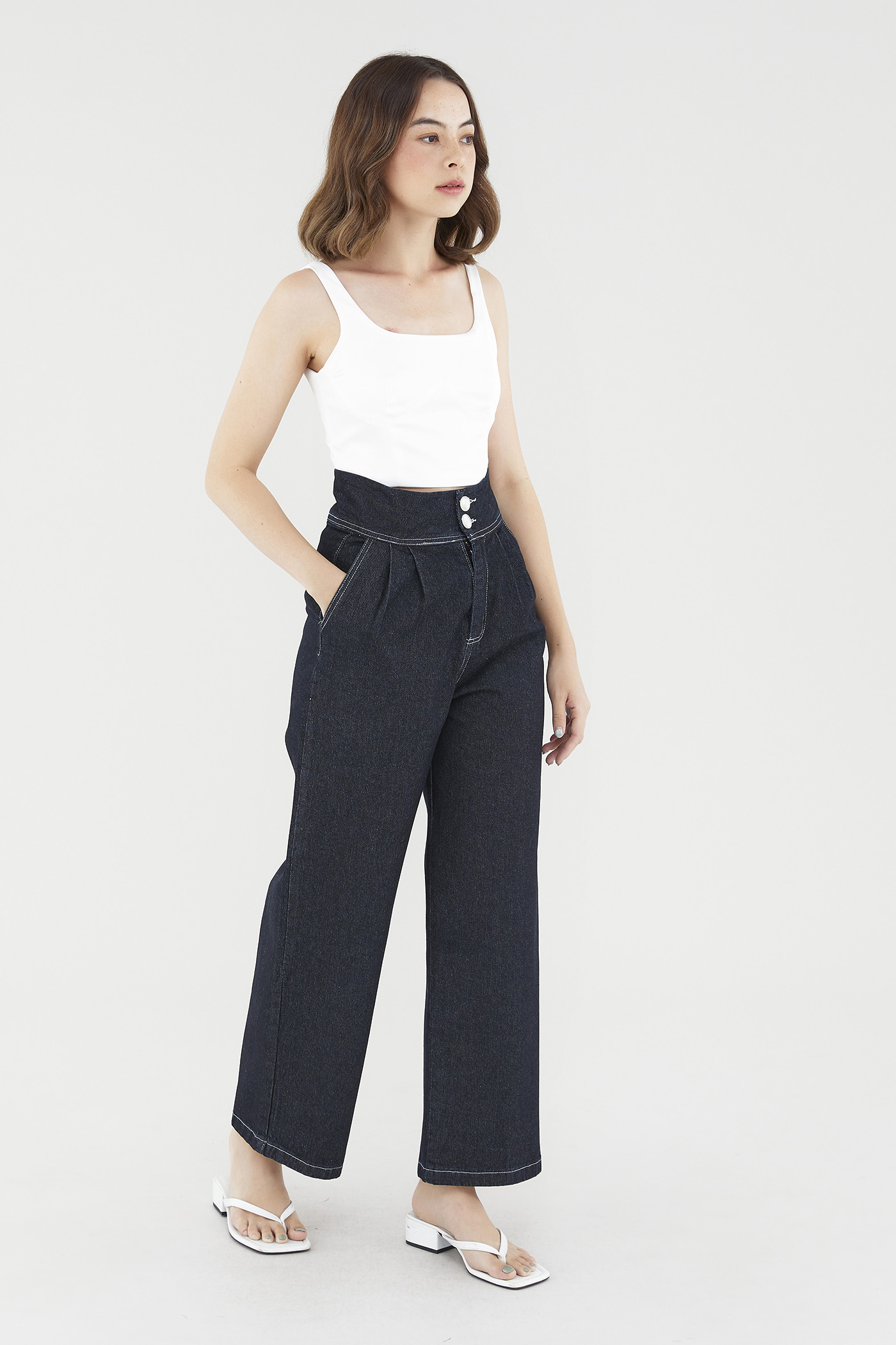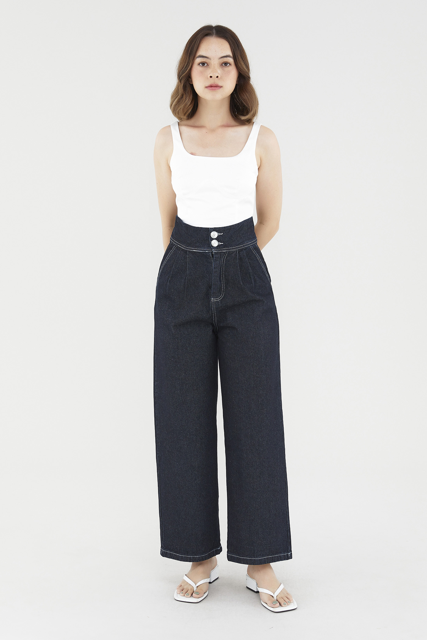 Easy denims. Cut from softly structured cotton, these high-waisted jeans feature a broad waistband, wide straight legs, front pleats and contrast stitching. Fits relaxed with a zip and double button closure on the front.
