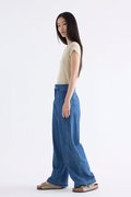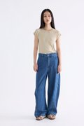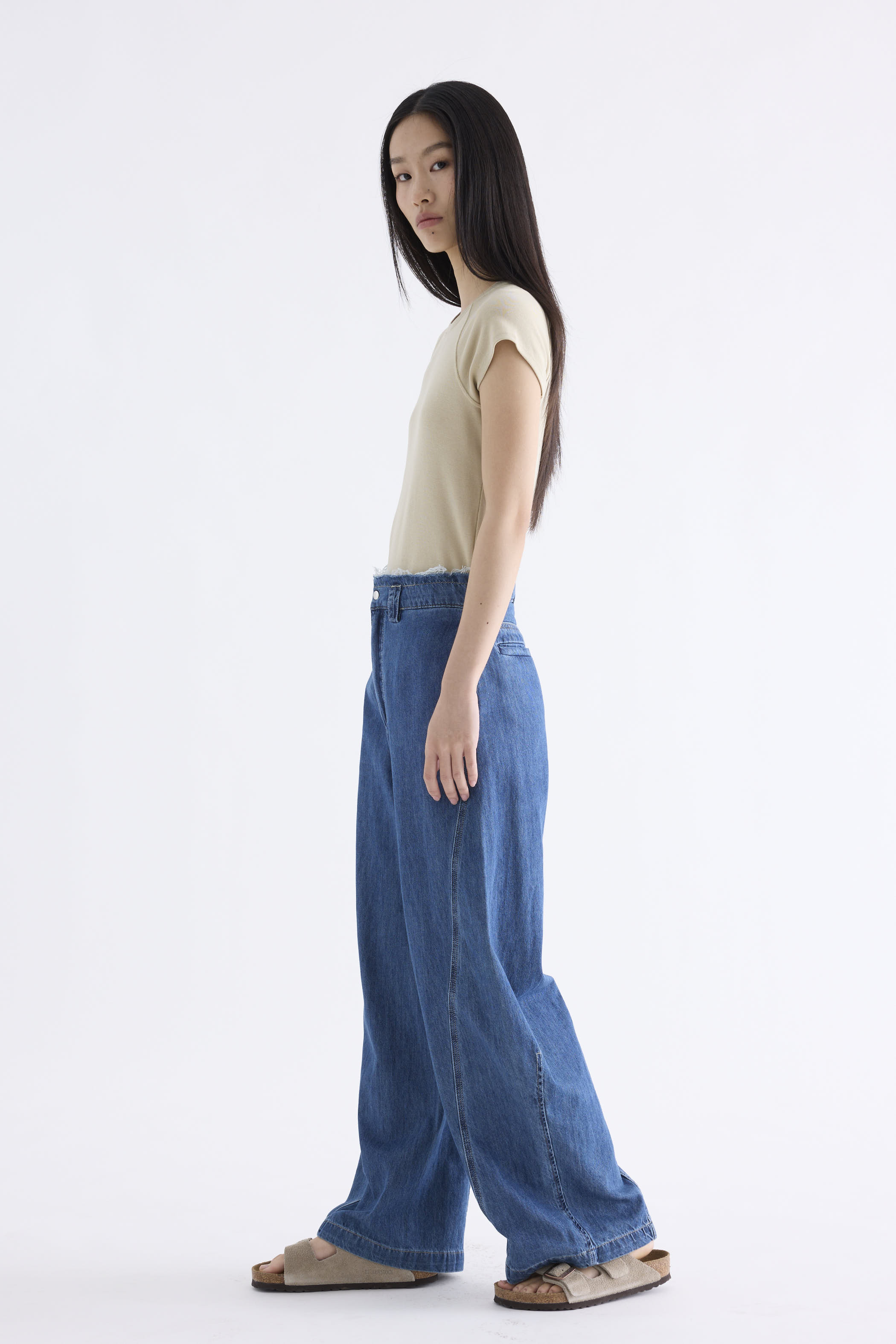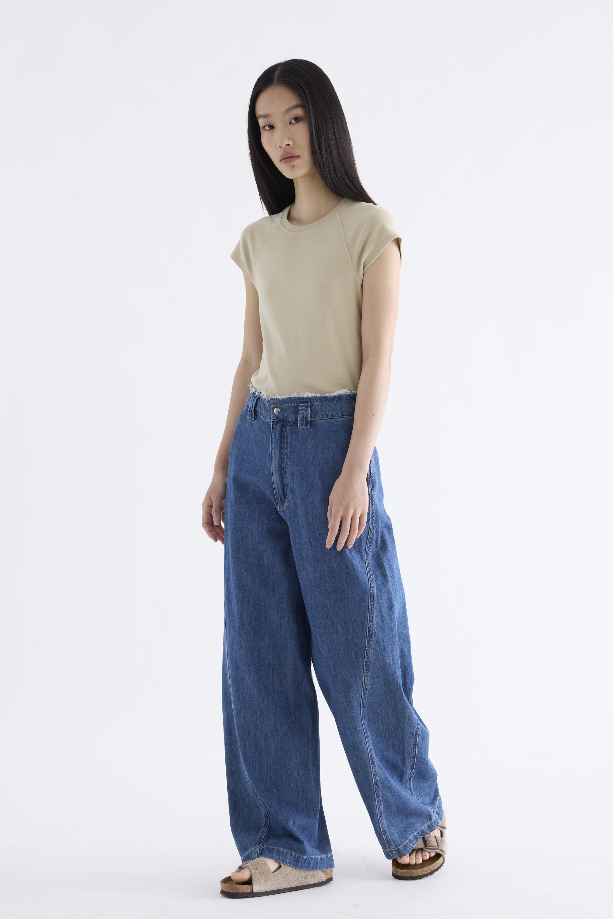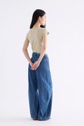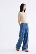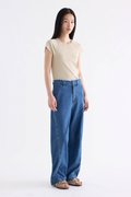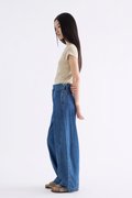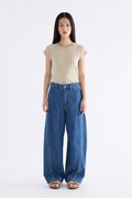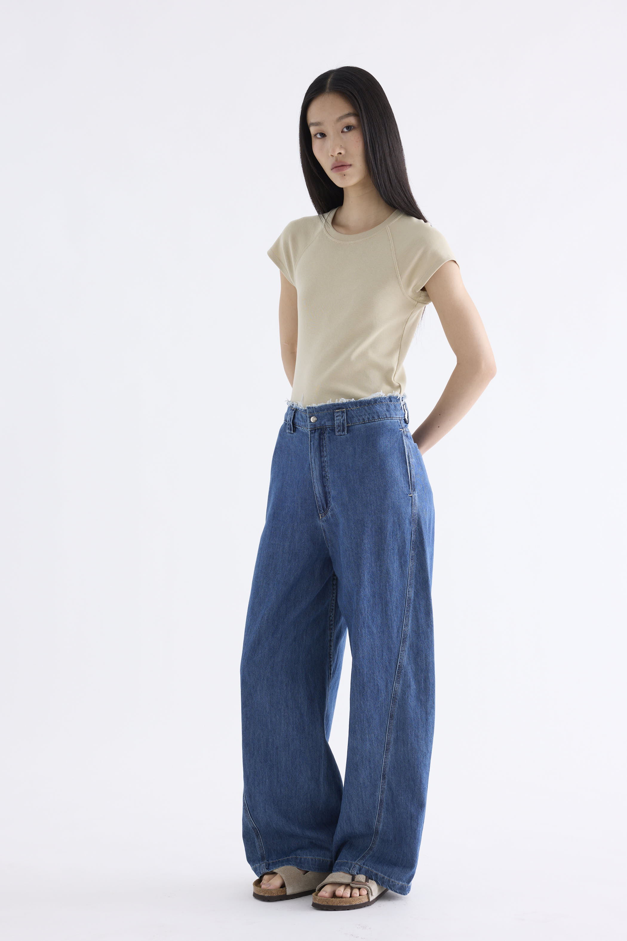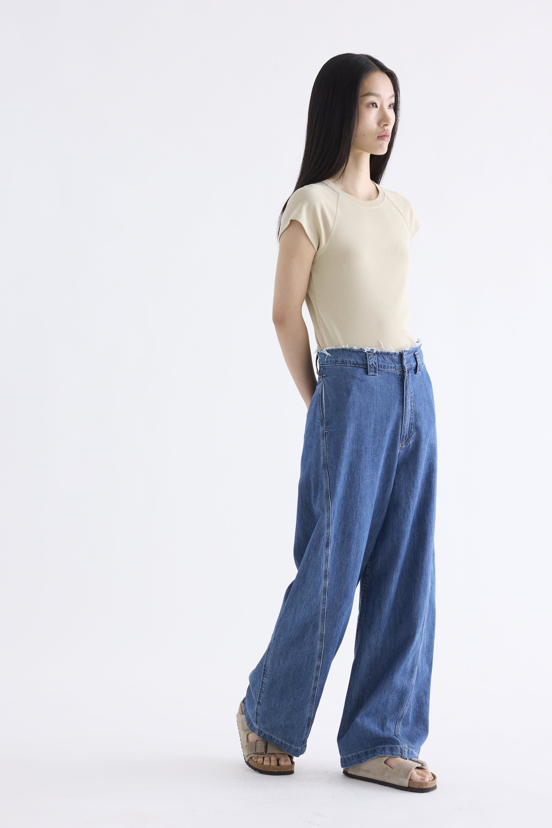 From the Postscript collection. These jeans feature contrast stitching, a raw waistband with broad belt loops and wide legs with an angled seam. Fits relaxed with a front zip and button closure.