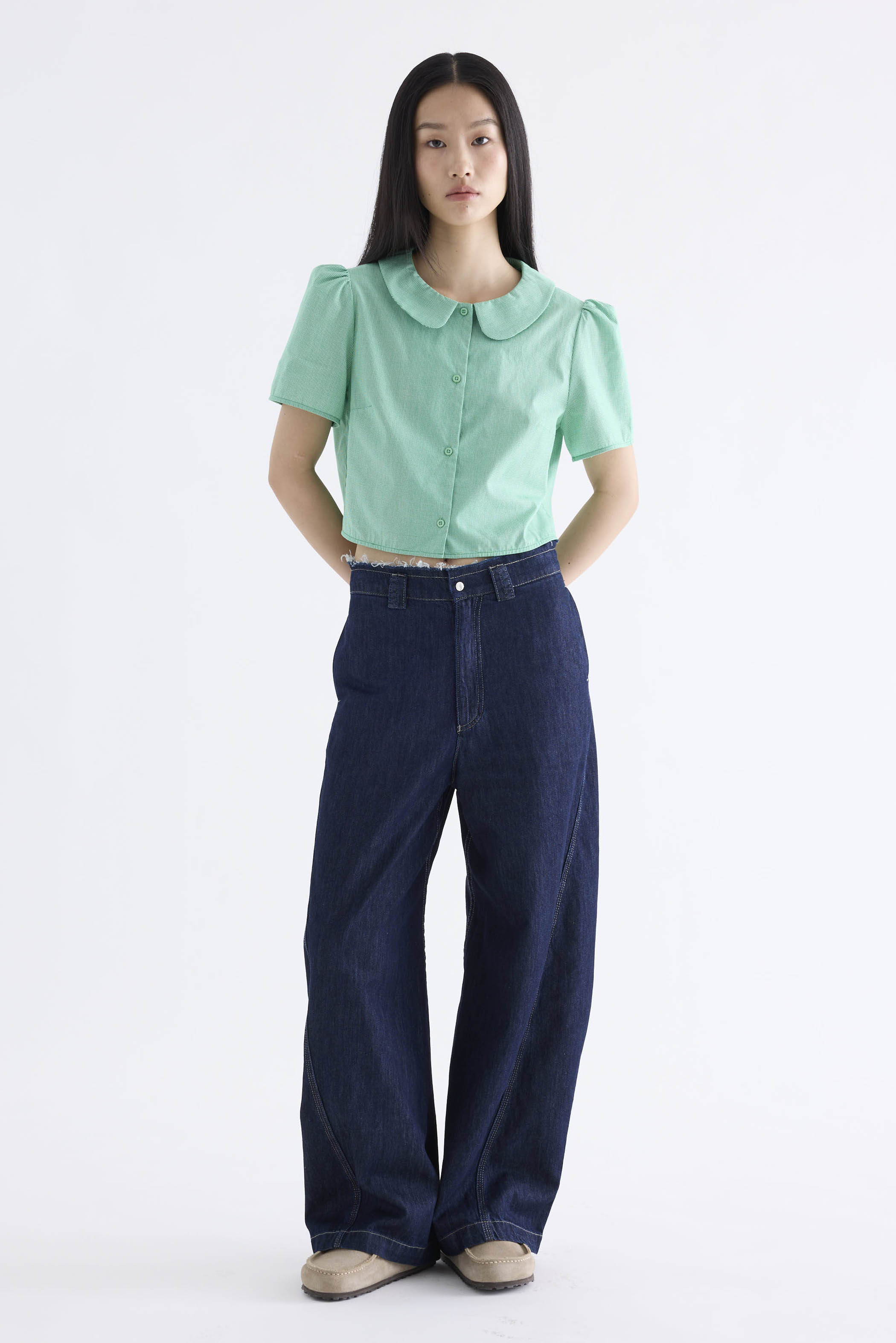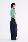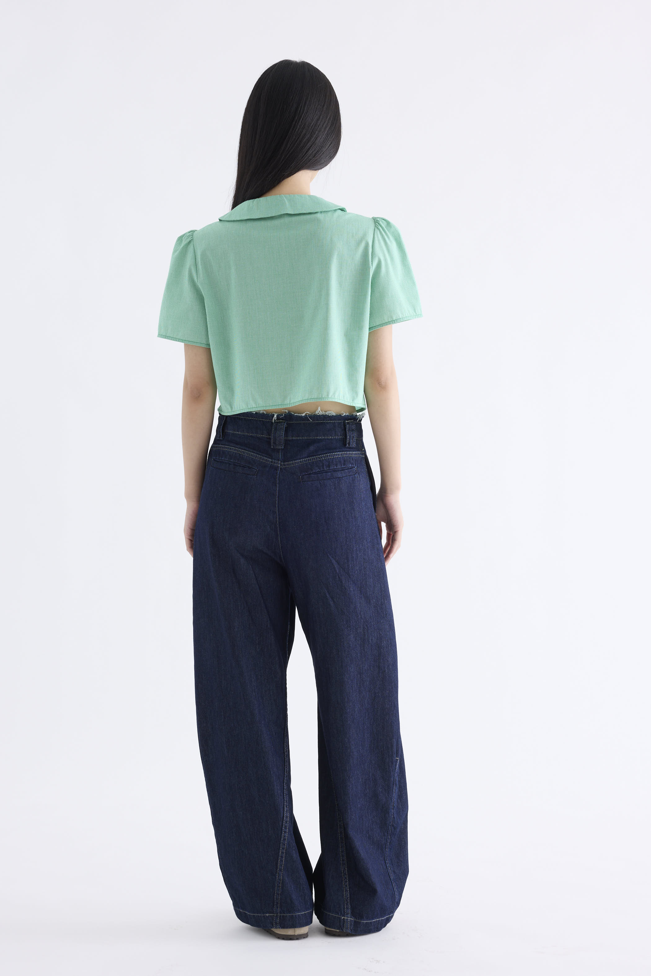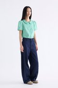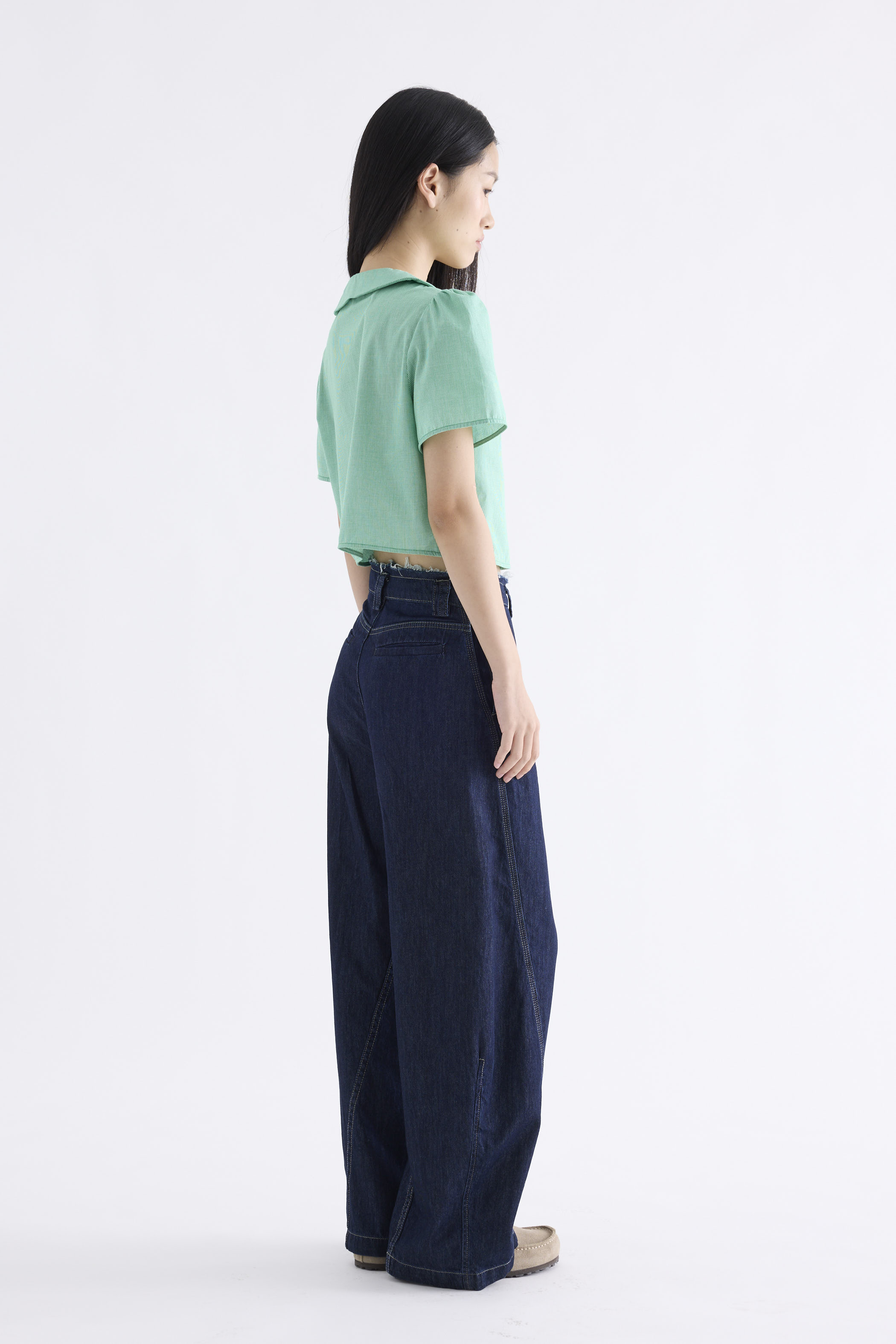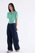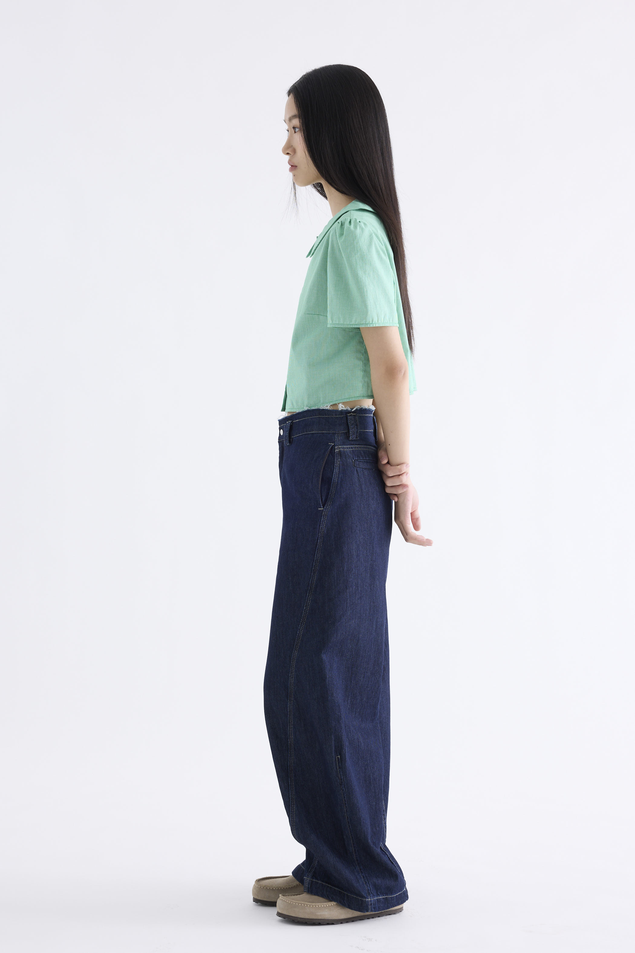 From the Postscript collection. These jeans feature contrast stitching, a raw waistband with broad belt loops and wide legs with an angled seam. Fits relaxed with a front zip and button closure.