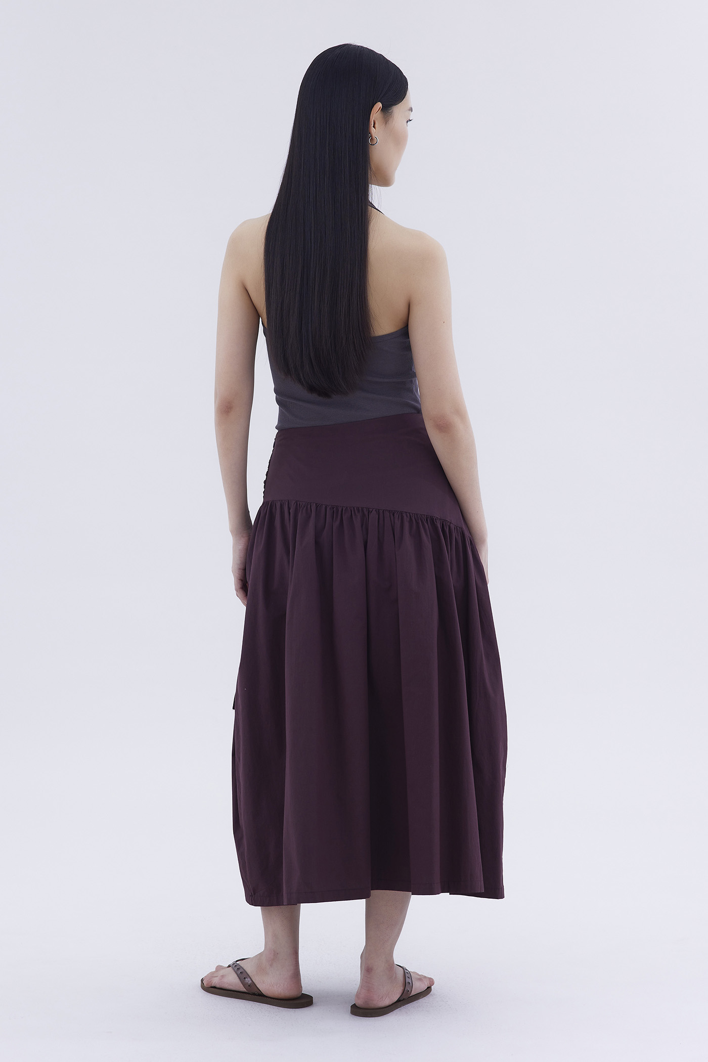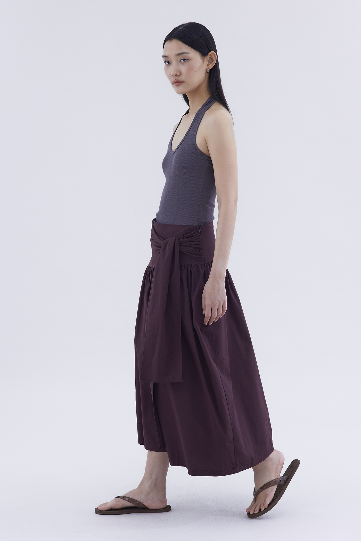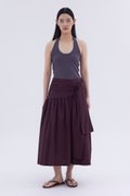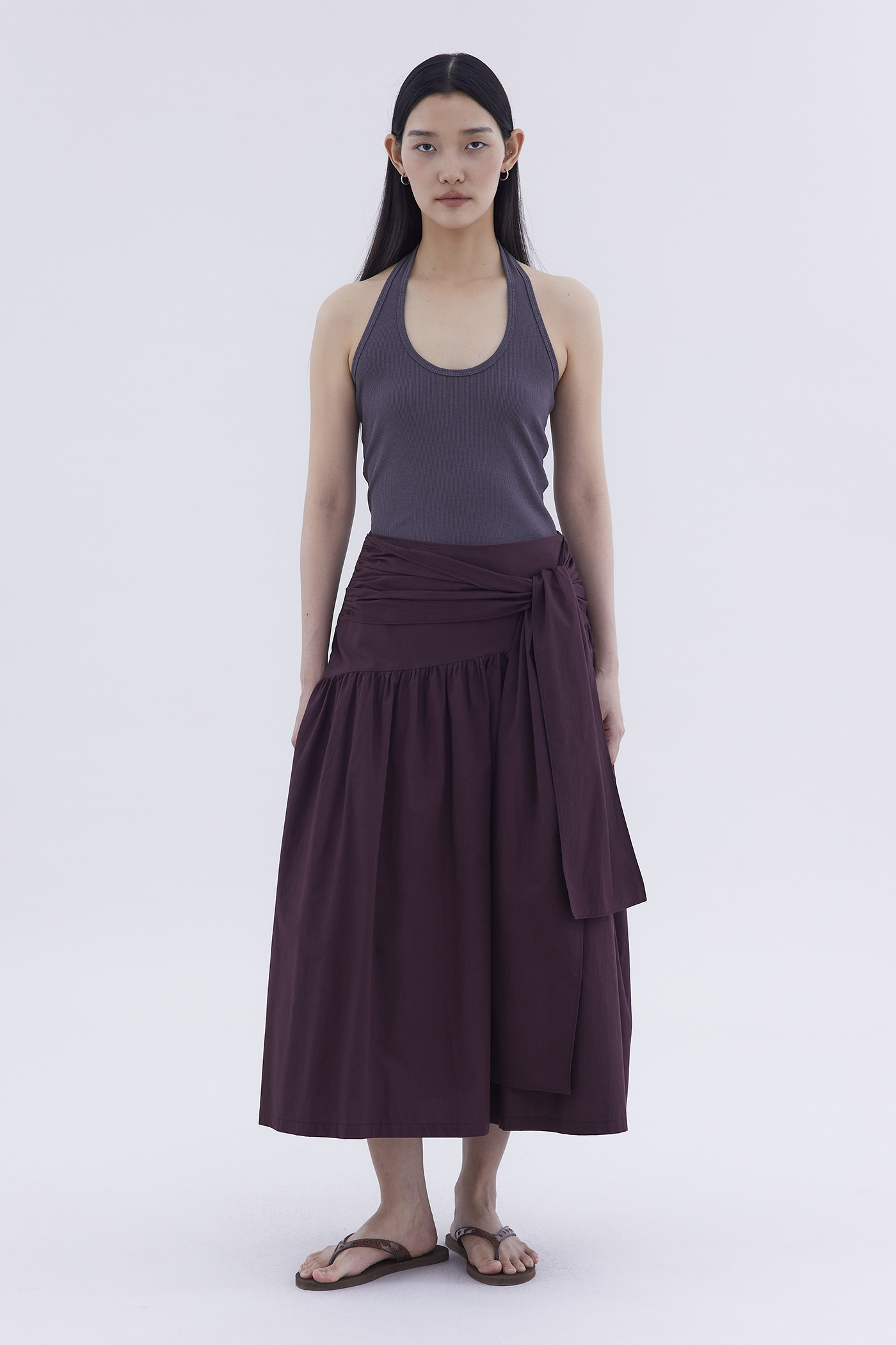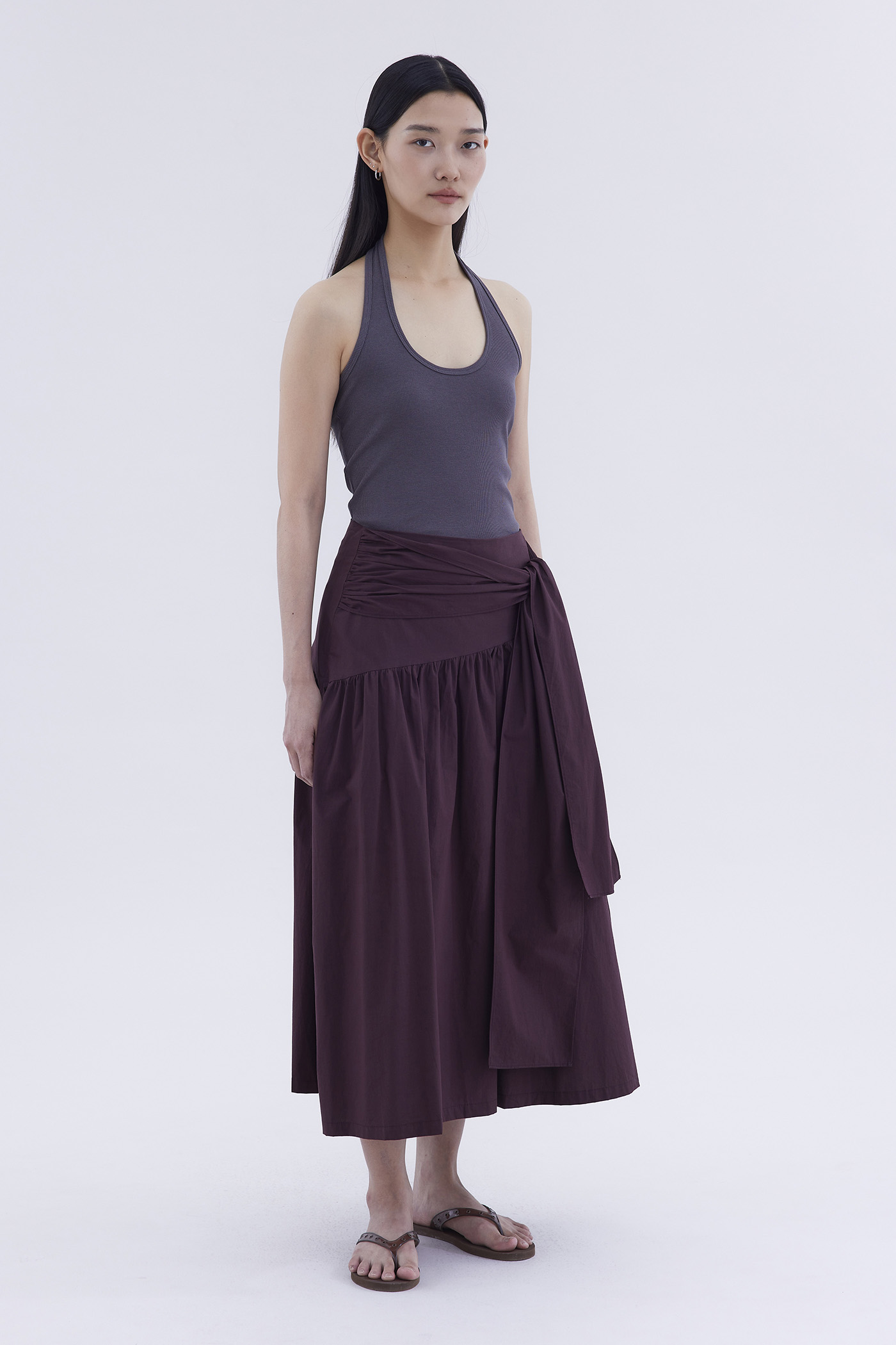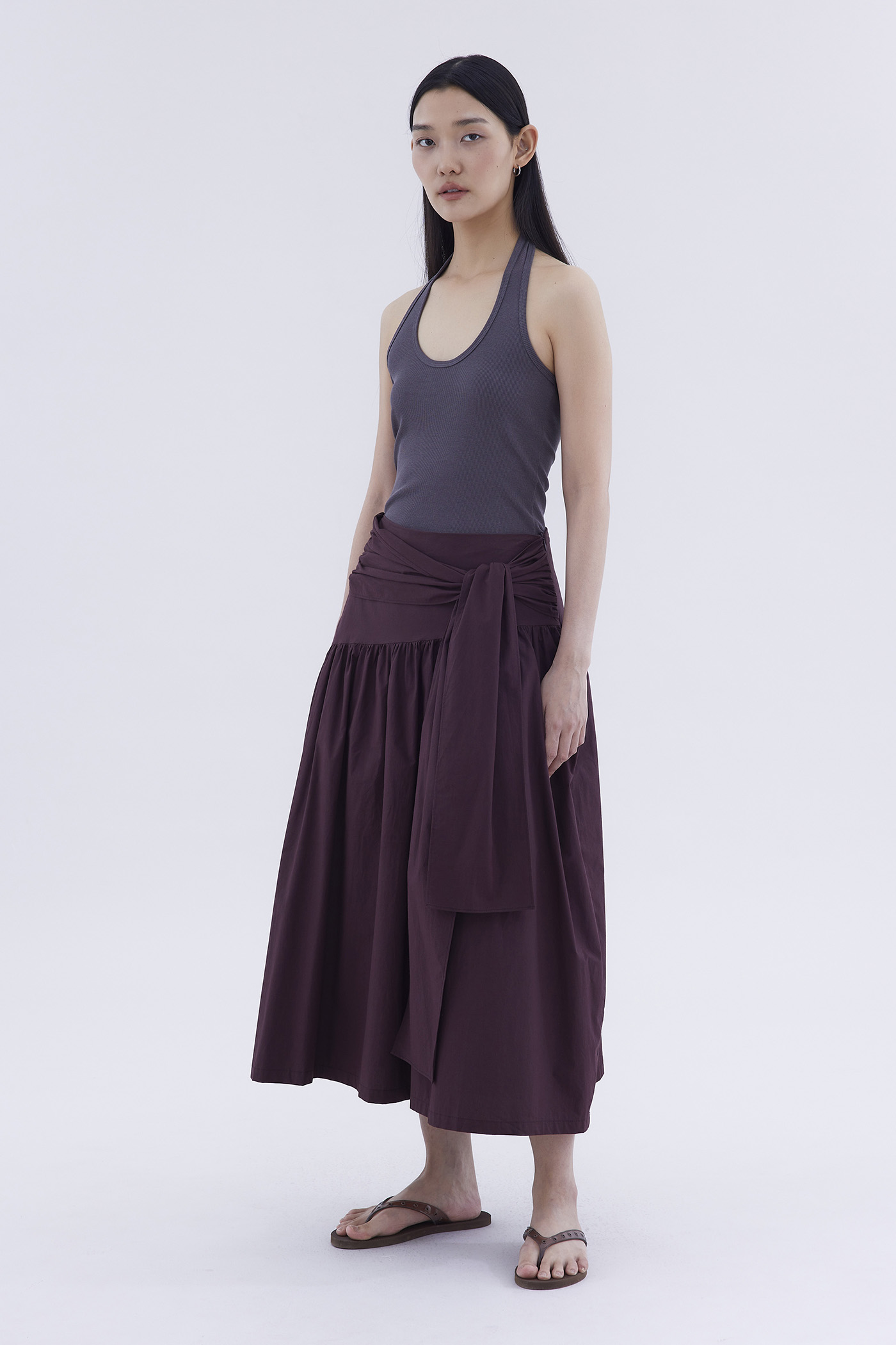 Be layered. Made from crisp and softly structured cotton, this midi skirt features an asymmetrical waist panel with a tie-strap and side zip closure. Fits relaxed in a gathered A-line silhouette.