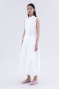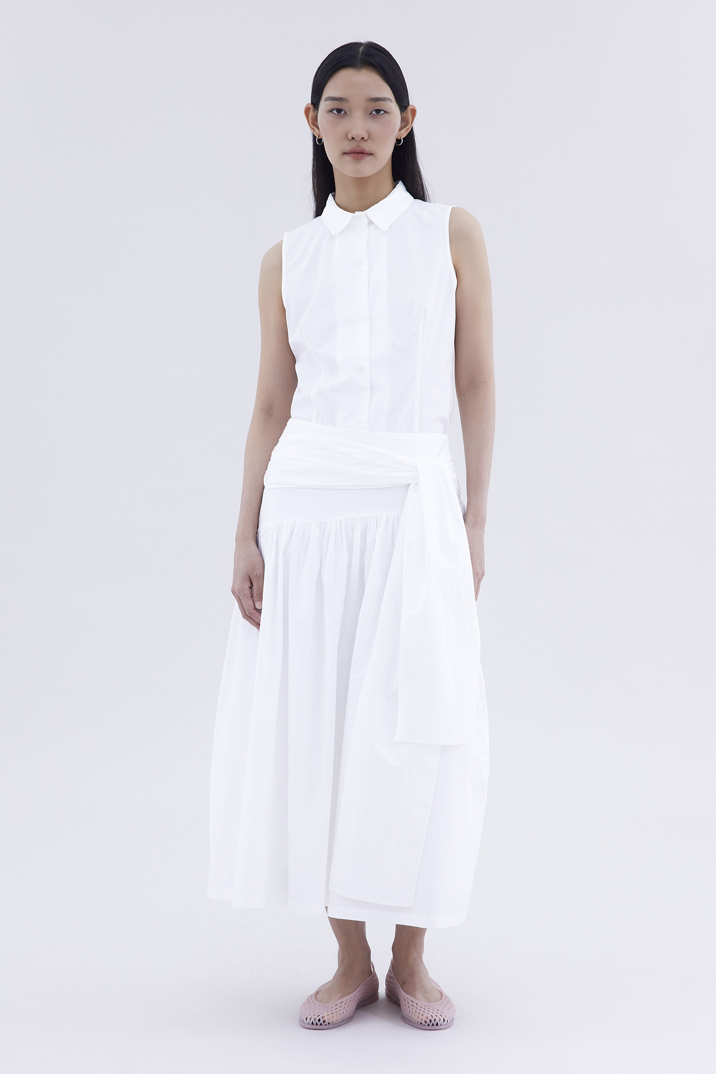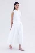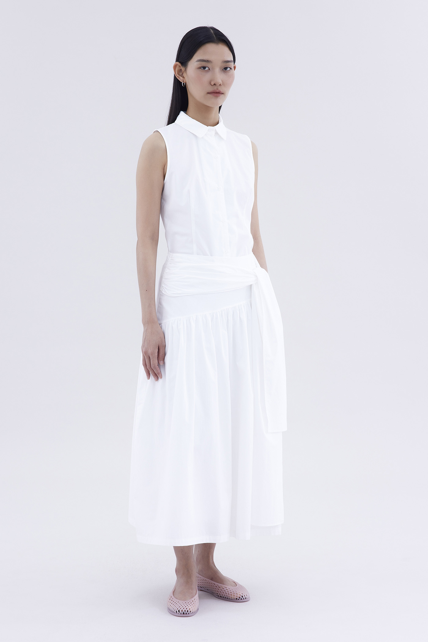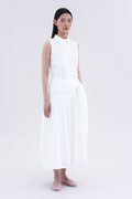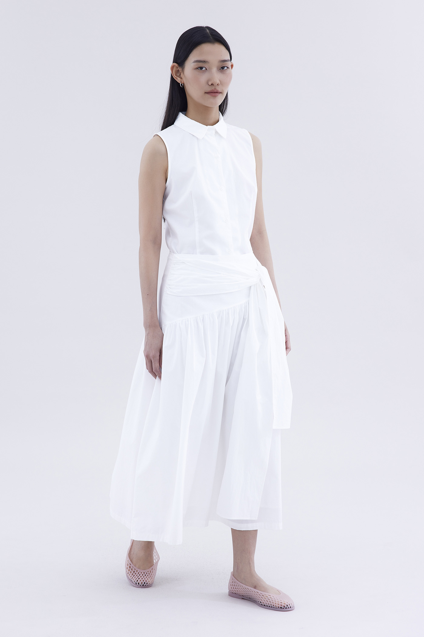 Be layered. Made from crisp and softly structured cotton, this midi skirt features an asymmetrical waist panel with a tie-strap and side zip closure. Fits relaxed in a gathered A-line silhouette.