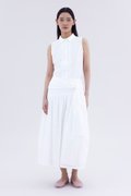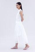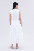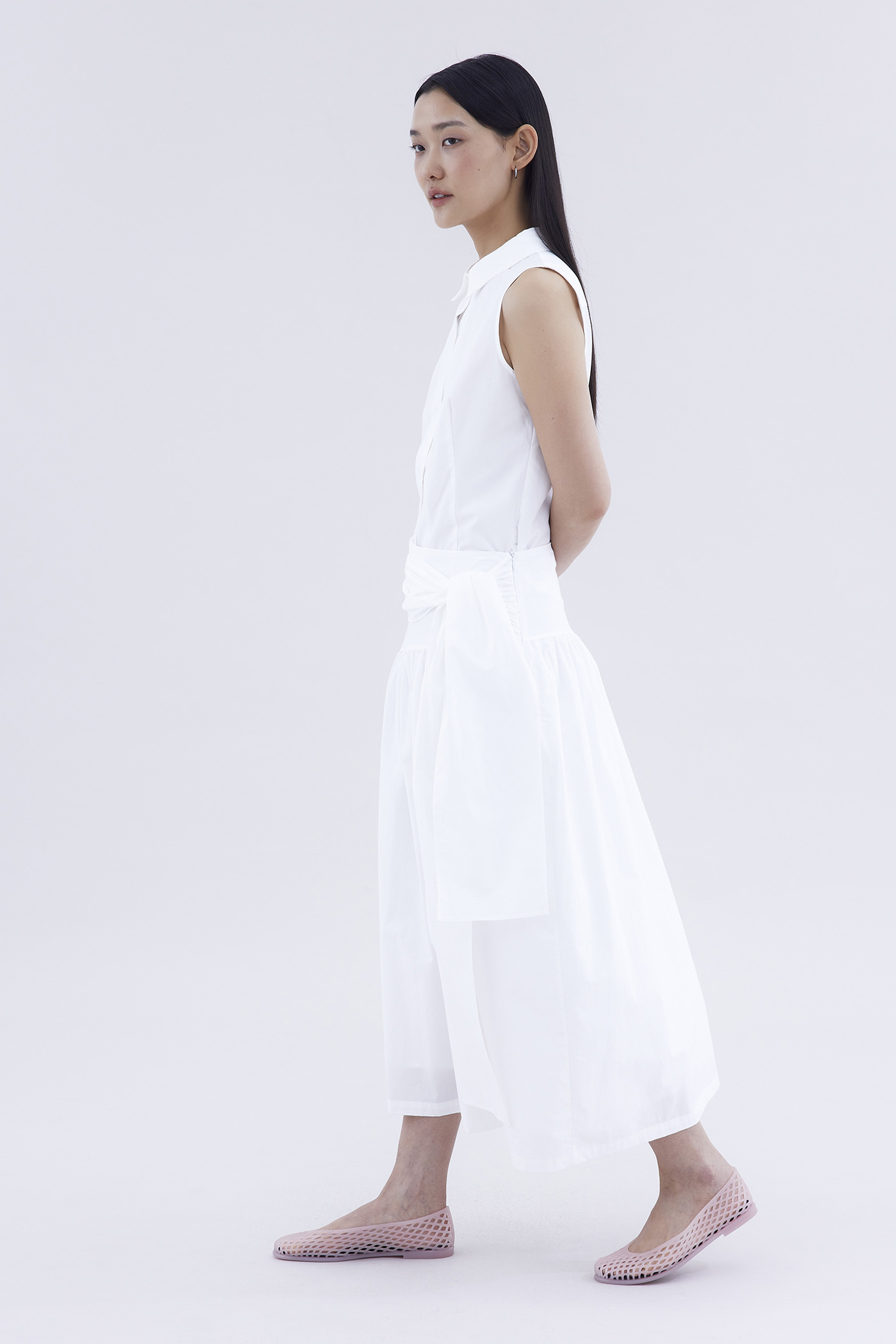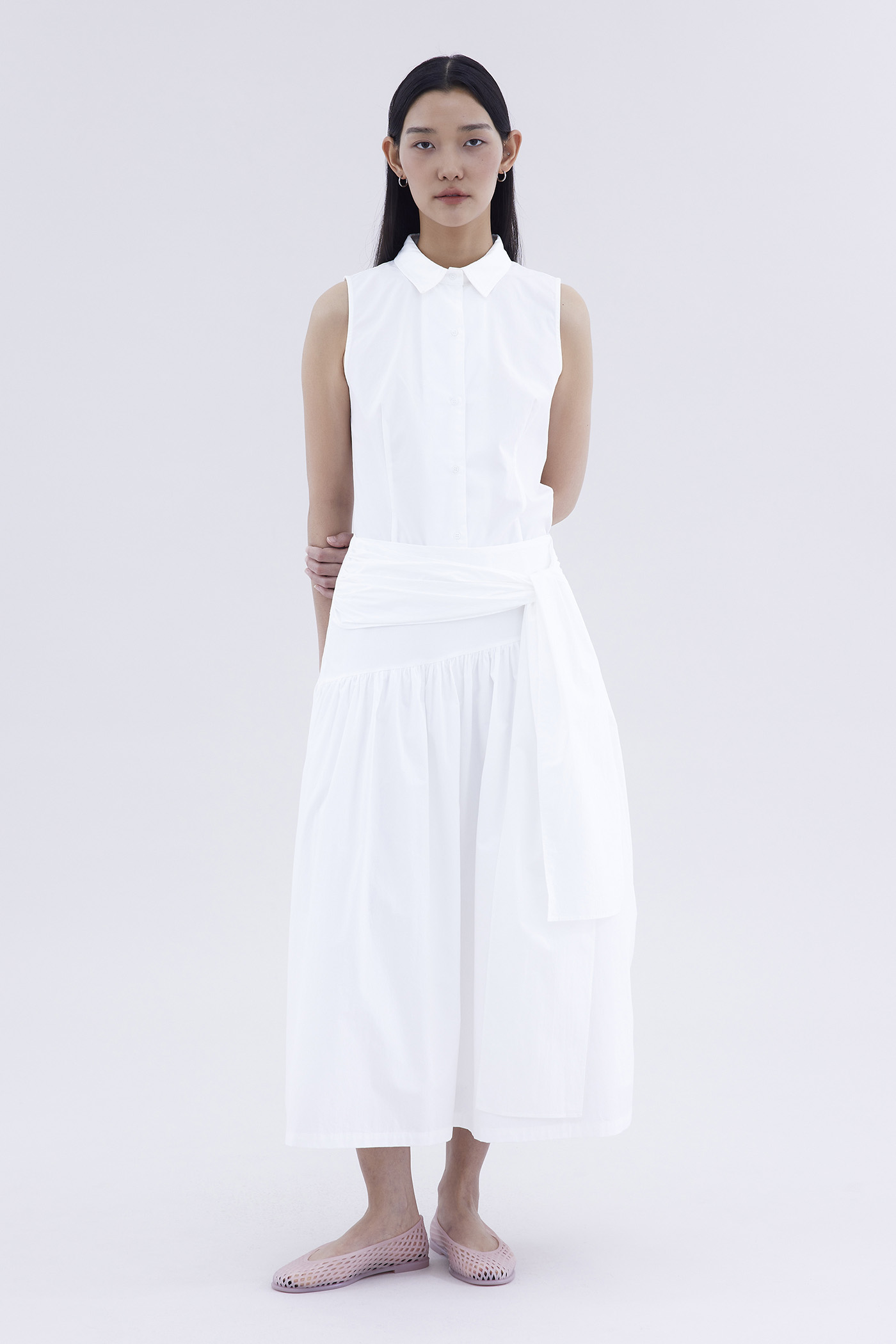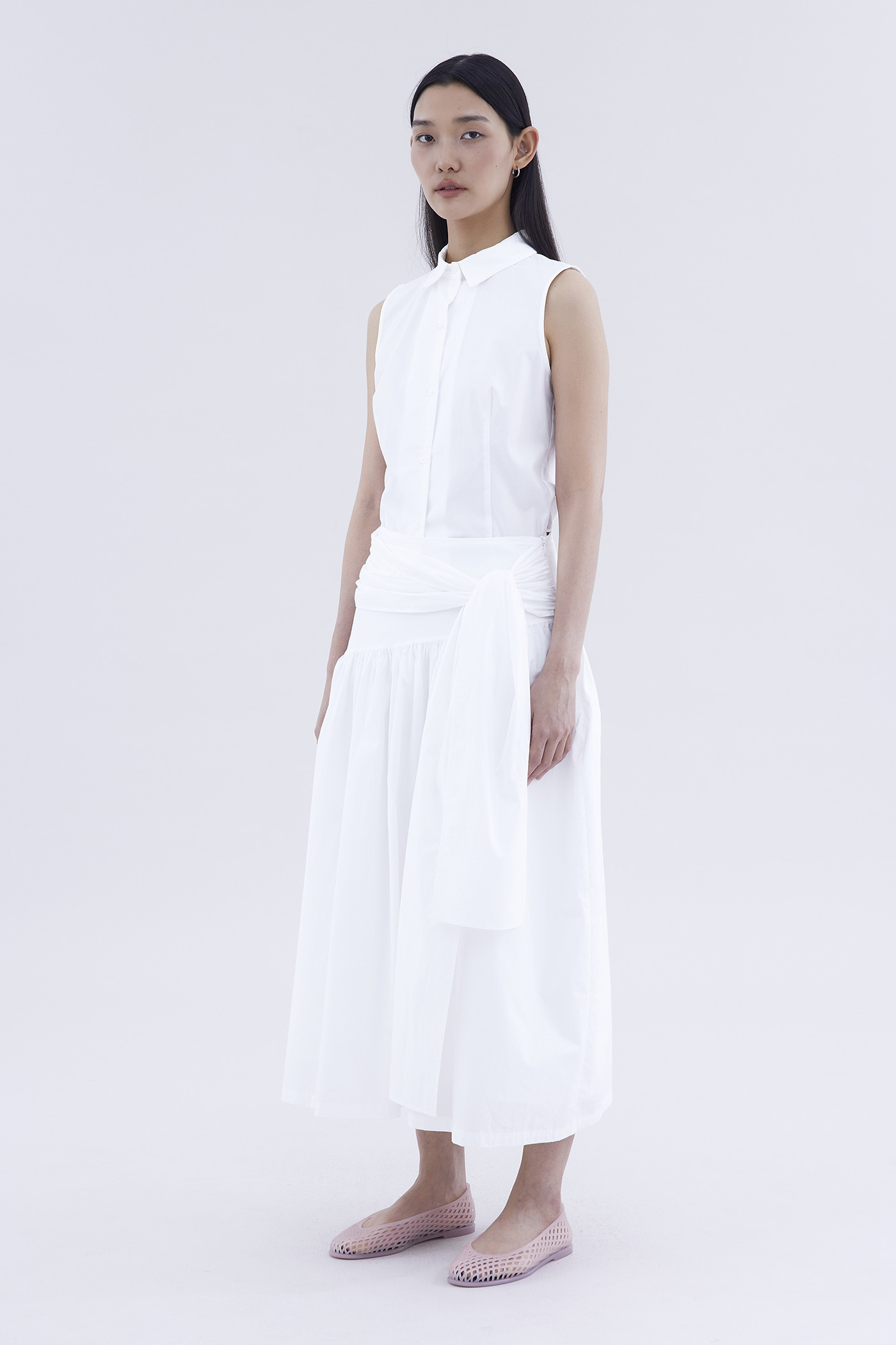 Be layered. Made from crisp and softly structured cotton, this midi skirt features an asymmetrical waist panel with a tie-strap and side zip closure. Fits relaxed in a gathered A-line silhouette.