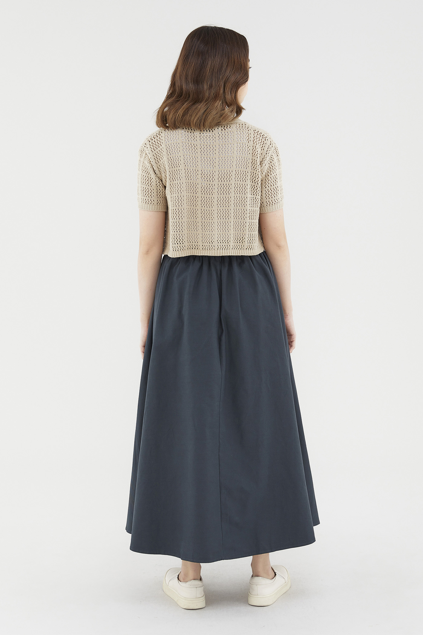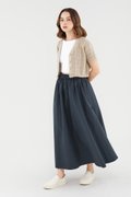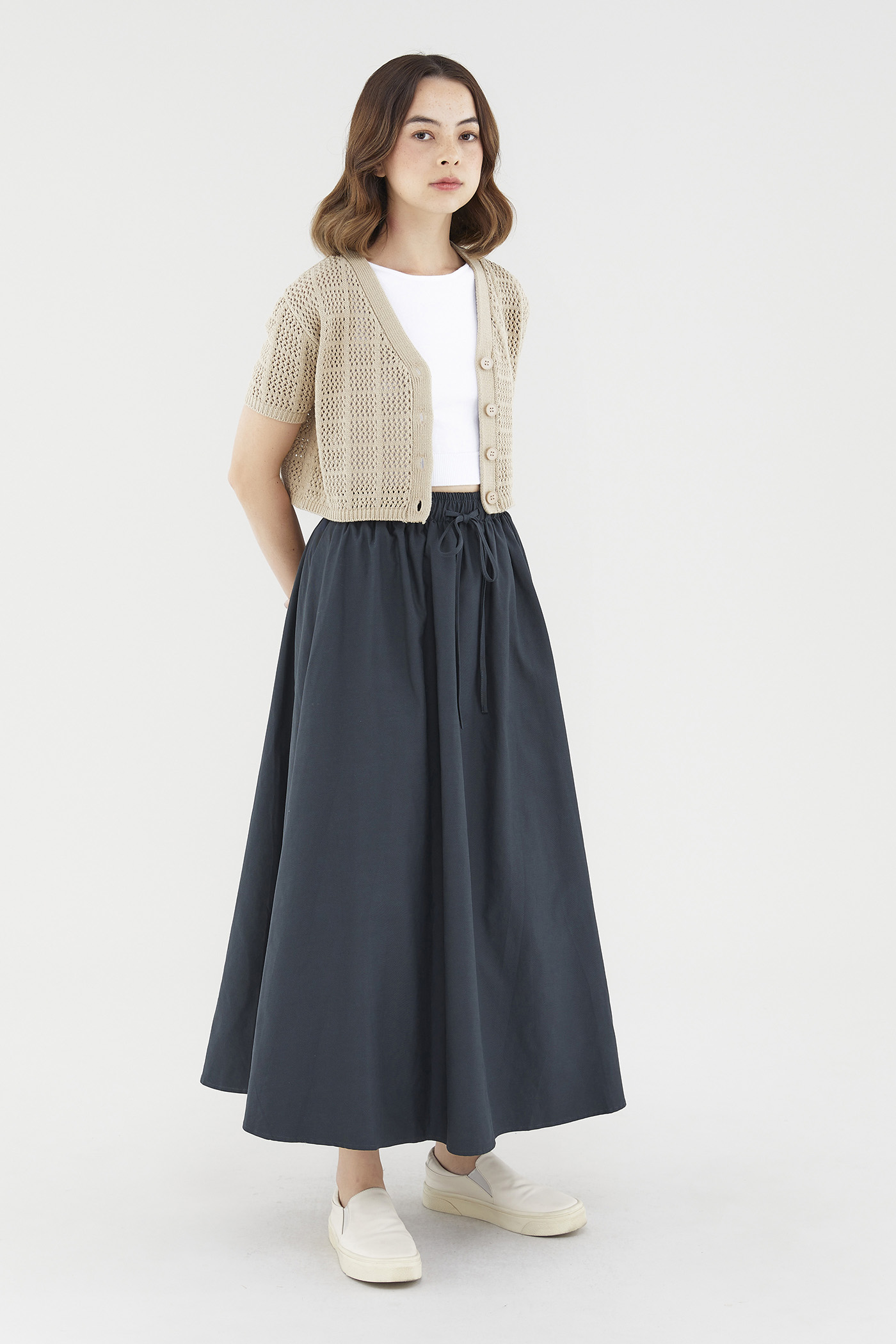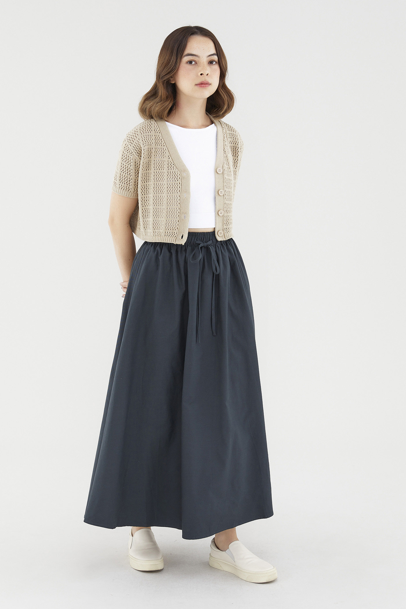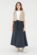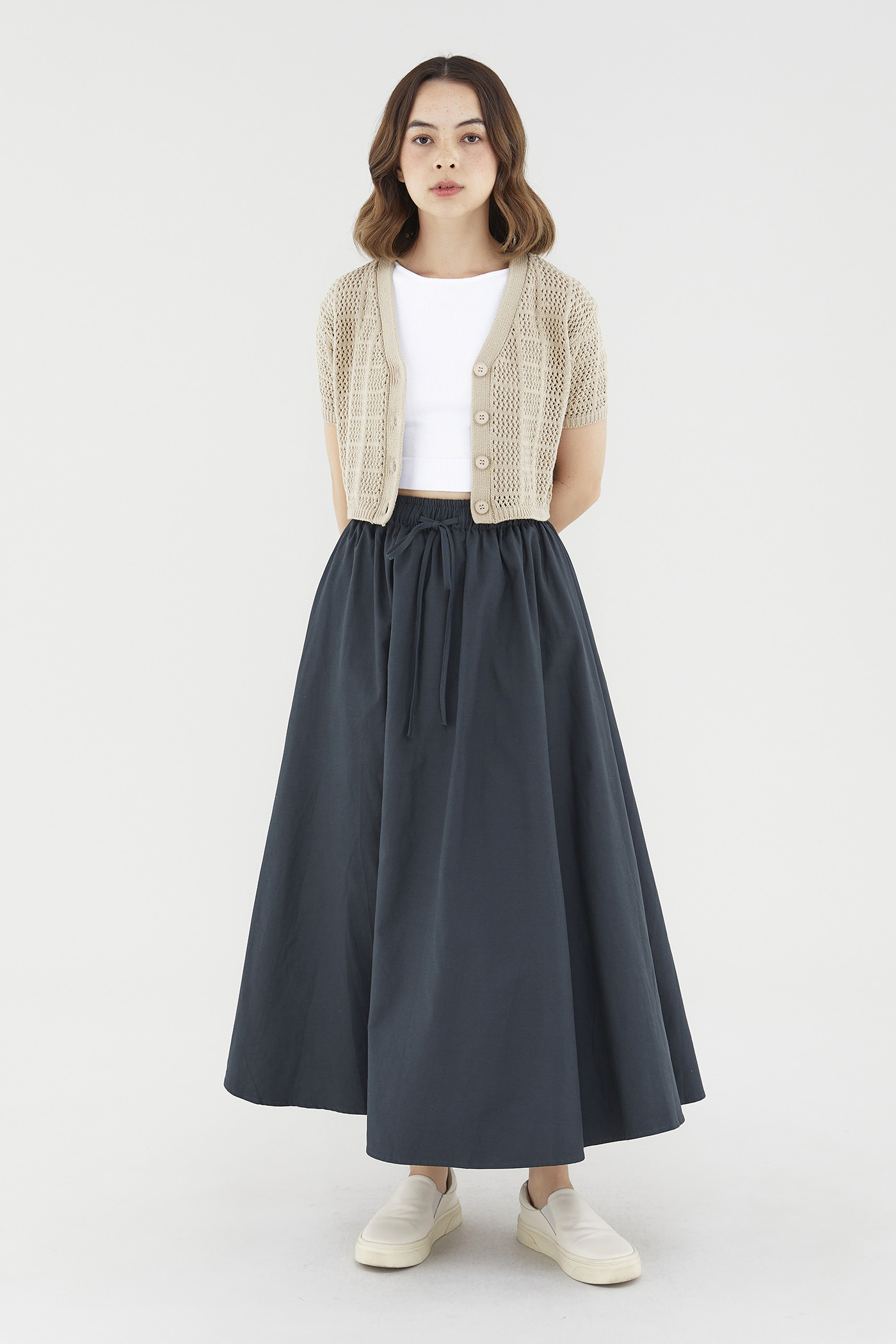 Easy-wearing volume. Cut from sturdy, non-sheer fabric, this maxi skirt features a softly structured silhouette and an elastic drawstring waist. Worn in a relaxed fit.