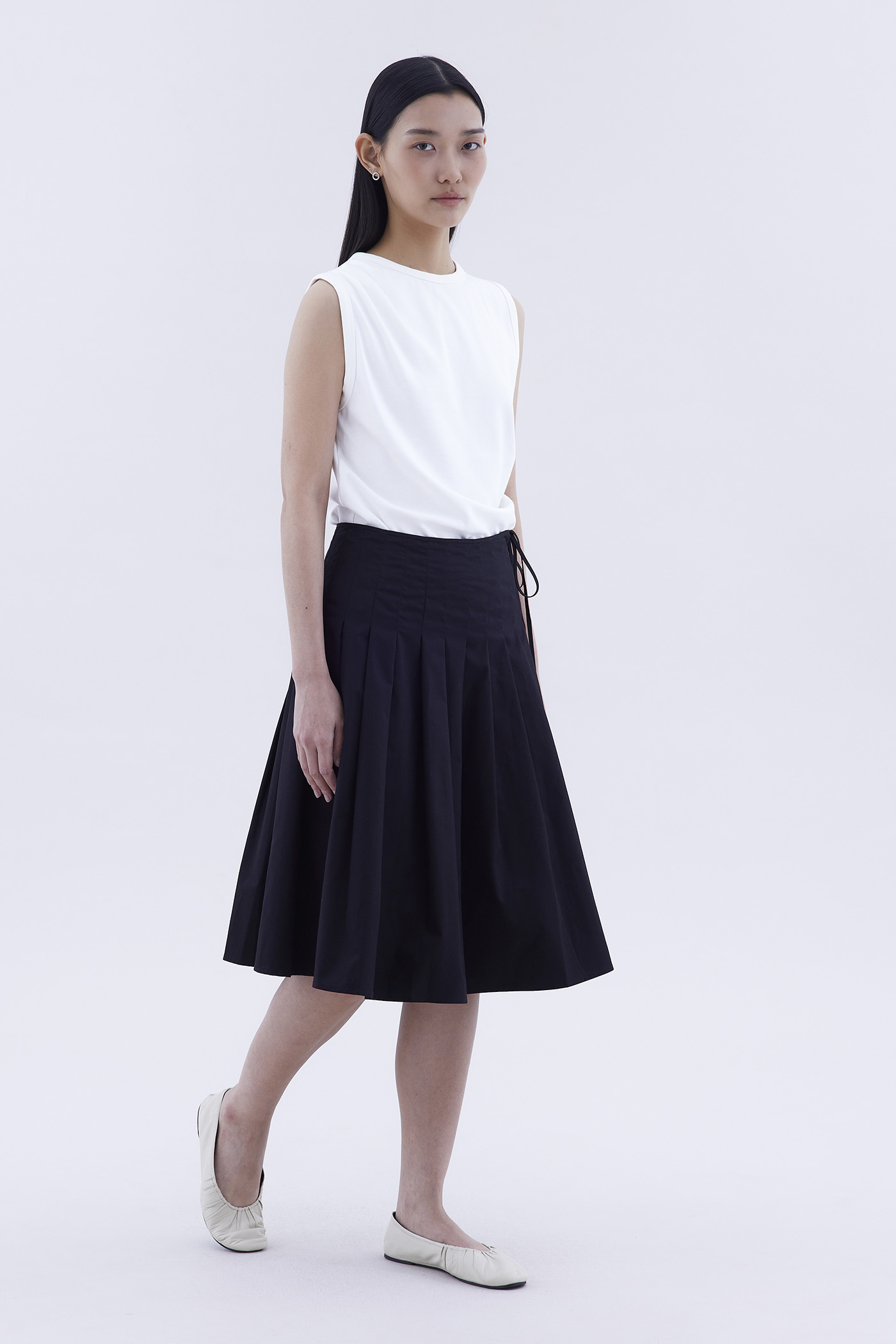 Feeling preppy. Made from crisp and softly structured cotton, this knee-length skirt features pleats, a waist tie-strap and a side zip closure. Fits slim in an A-line silhouette.