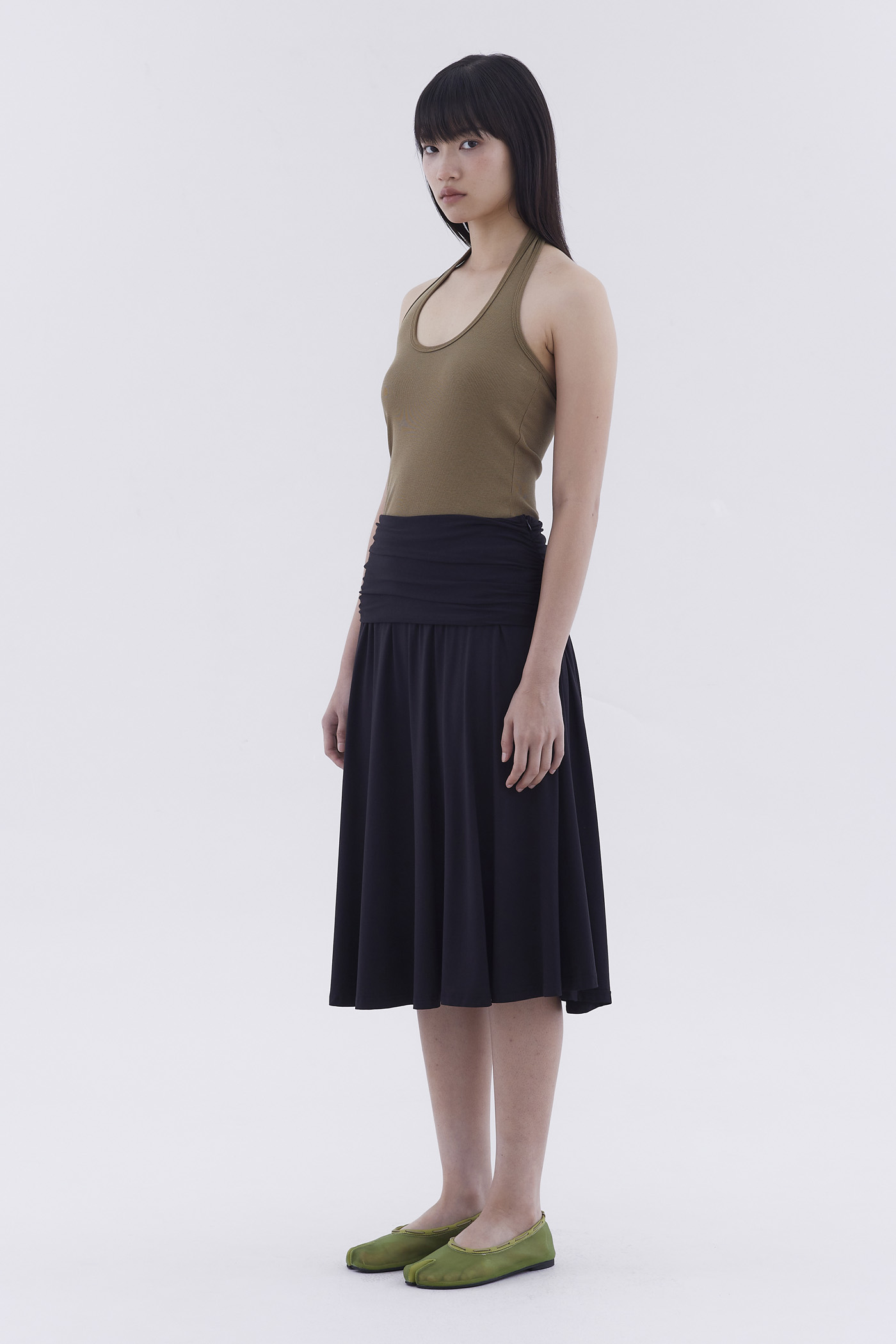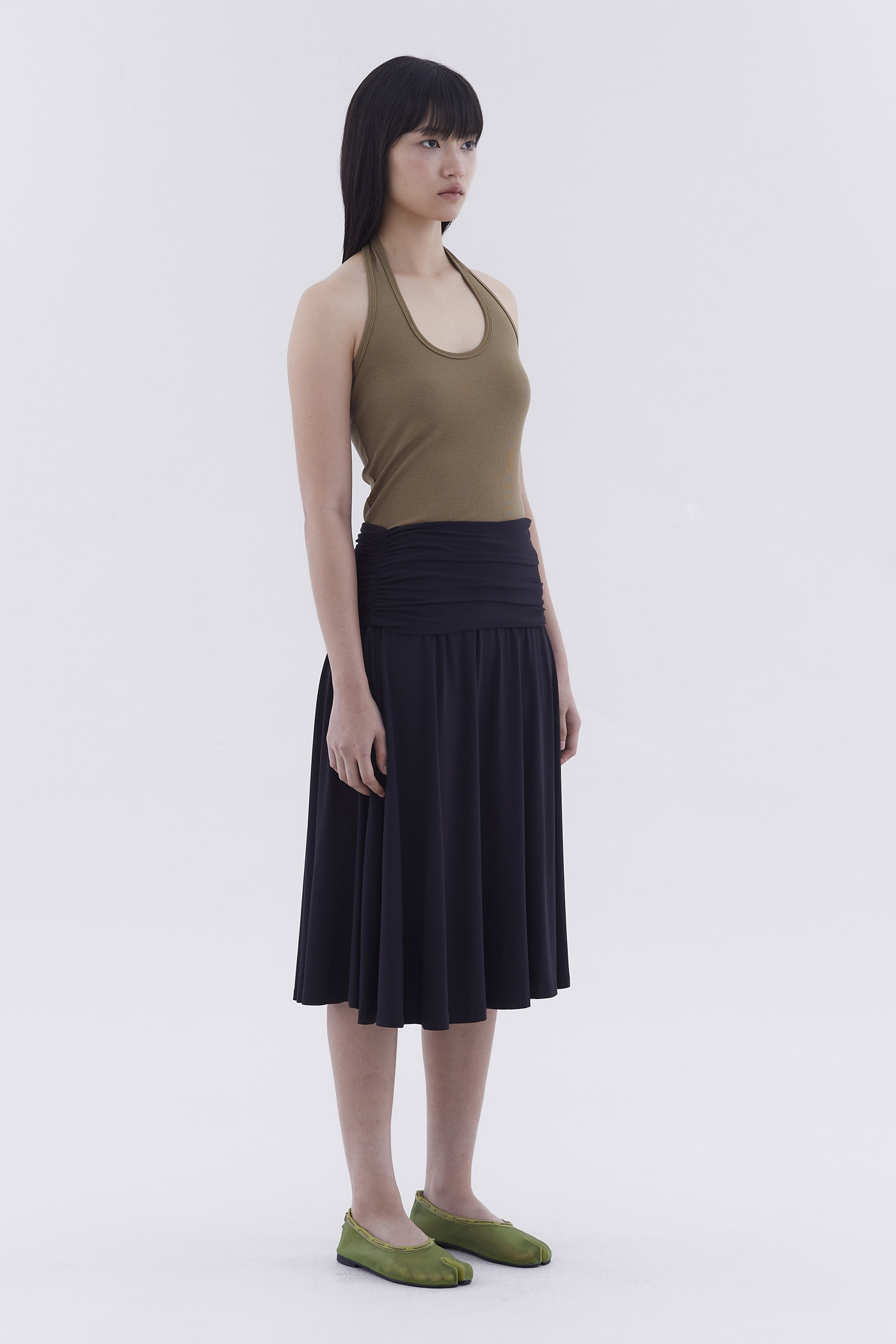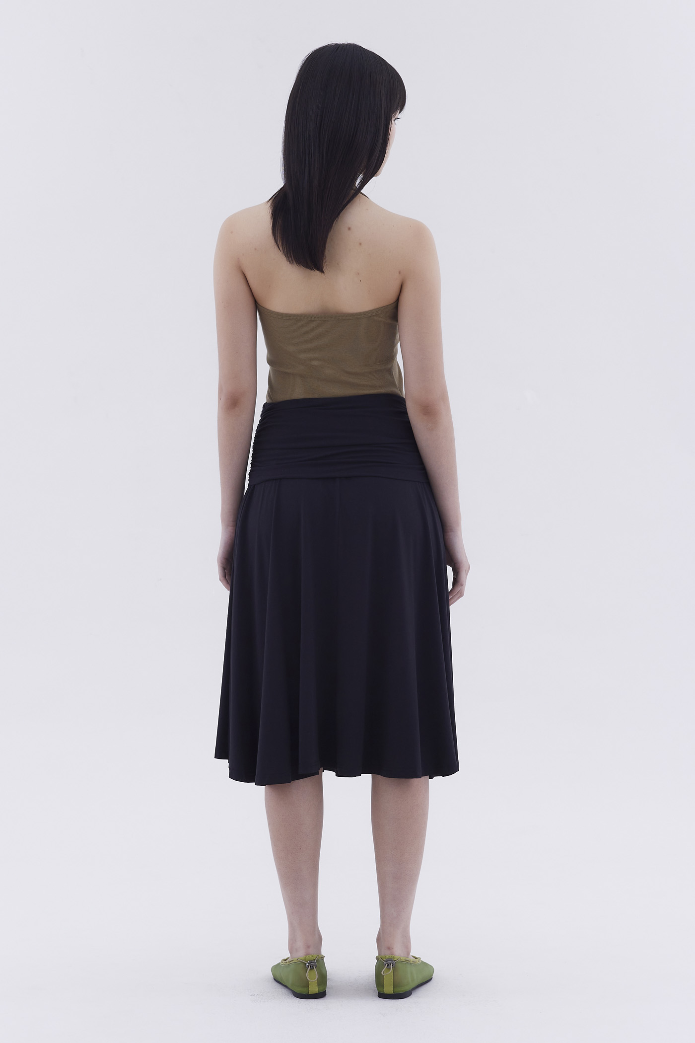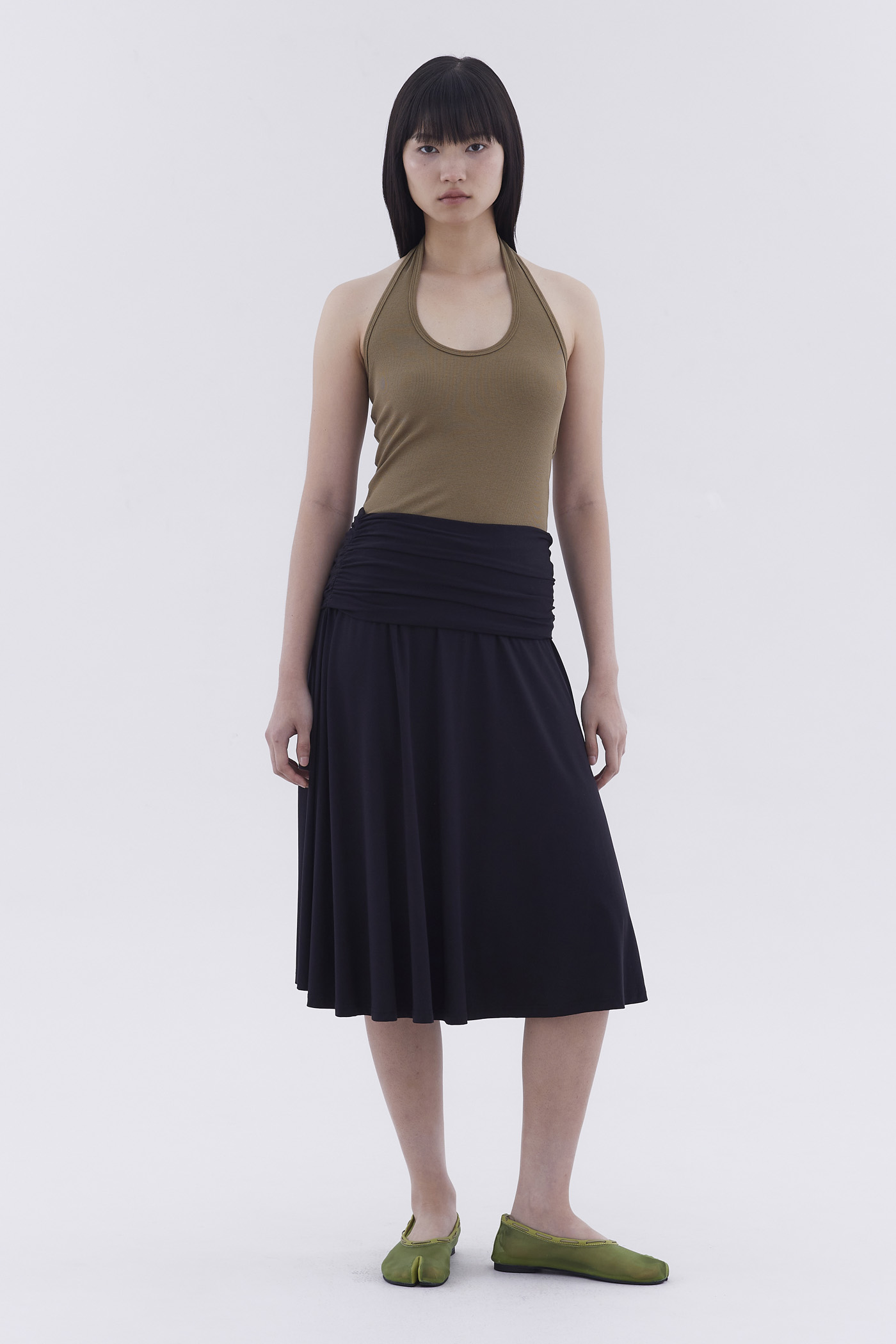 Fluid forms. Made from smooth and flowy fabric, this midi skirt features a stretchy and ruched foldover waist, as well as a side zip closure. Worn in a slim fit.