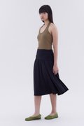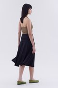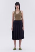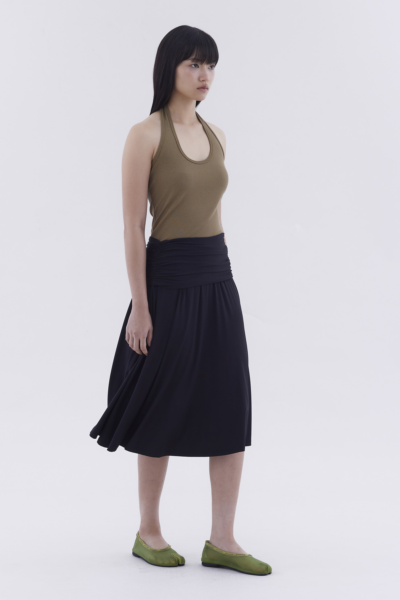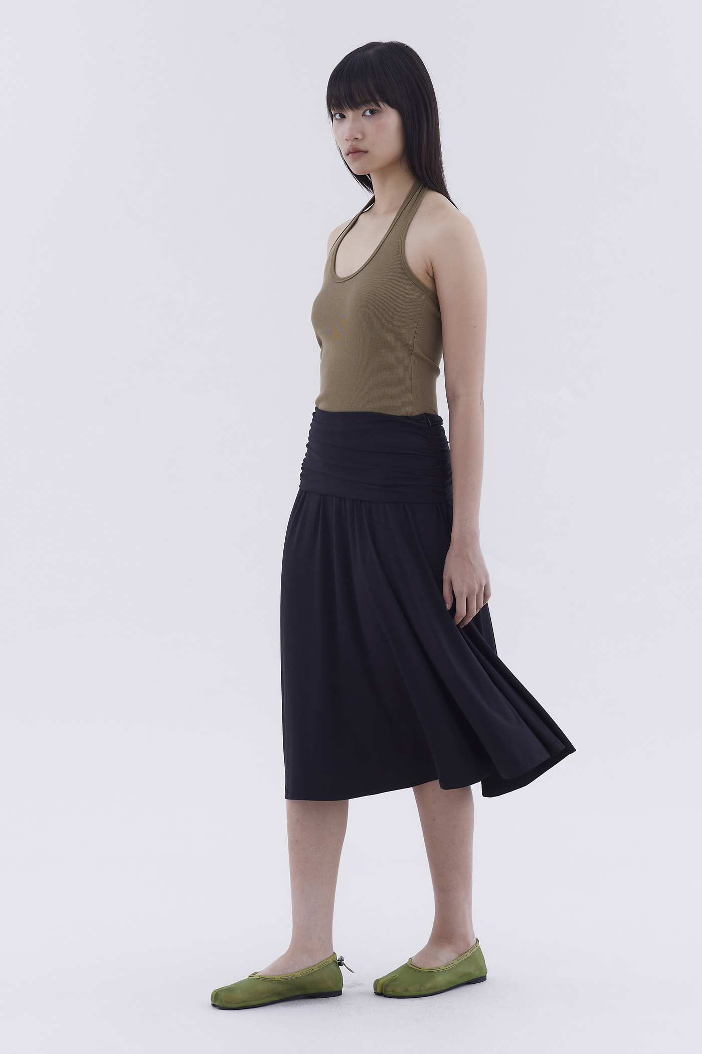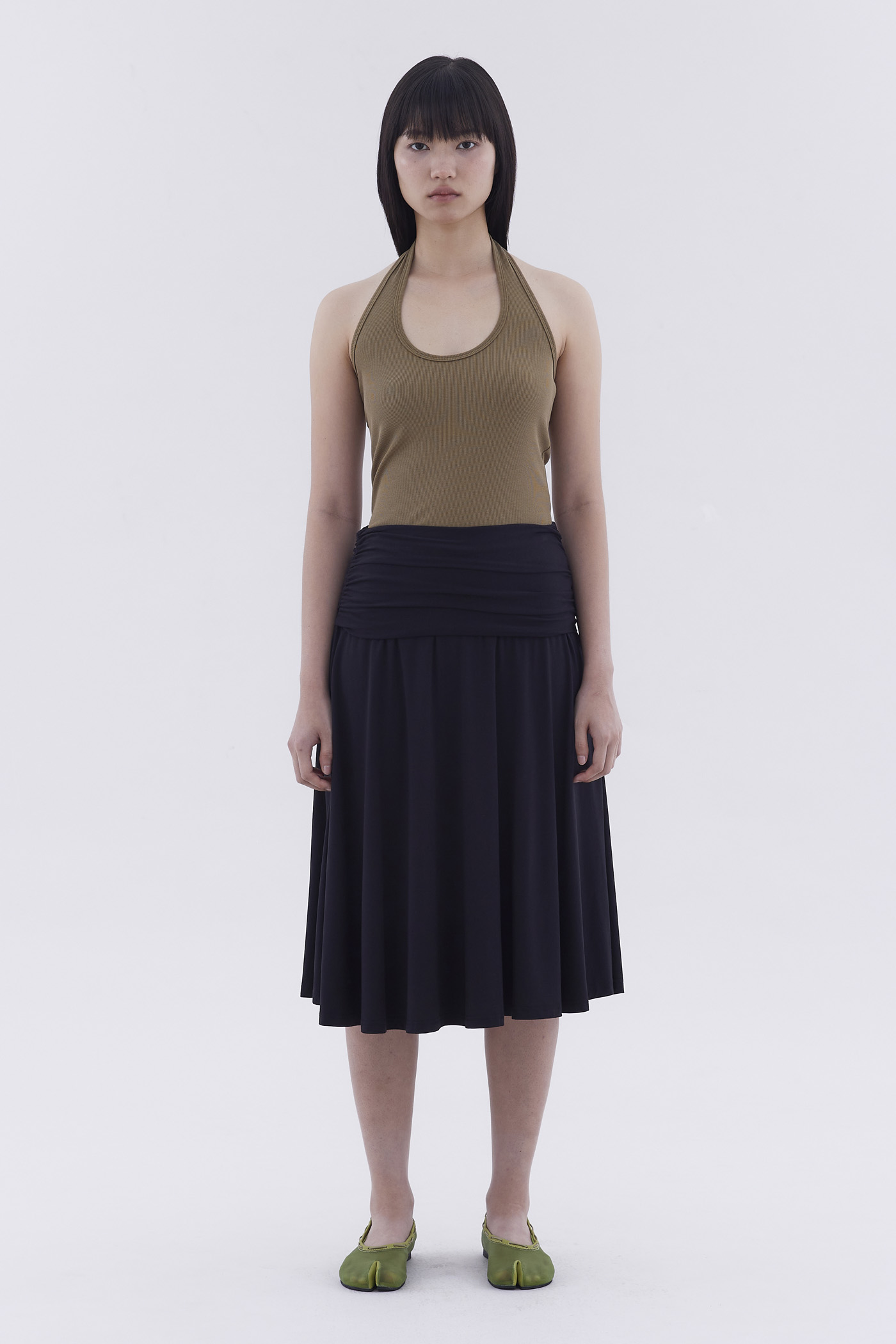 Fluid forms. Made from smooth and flowy fabric, this midi skirt features a stretchy and ruched foldover waist, as well as a side zip closure. Worn in a slim fit.