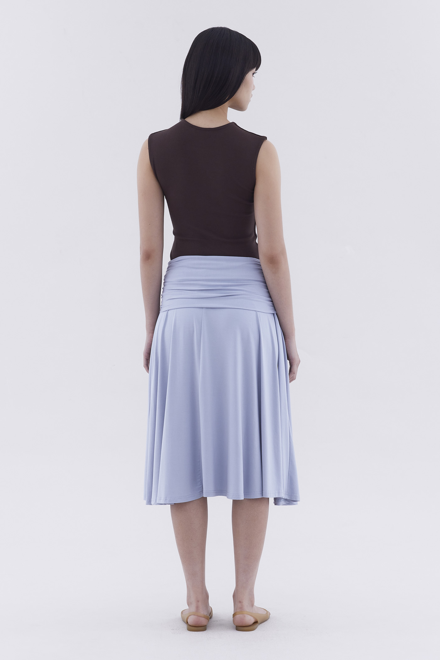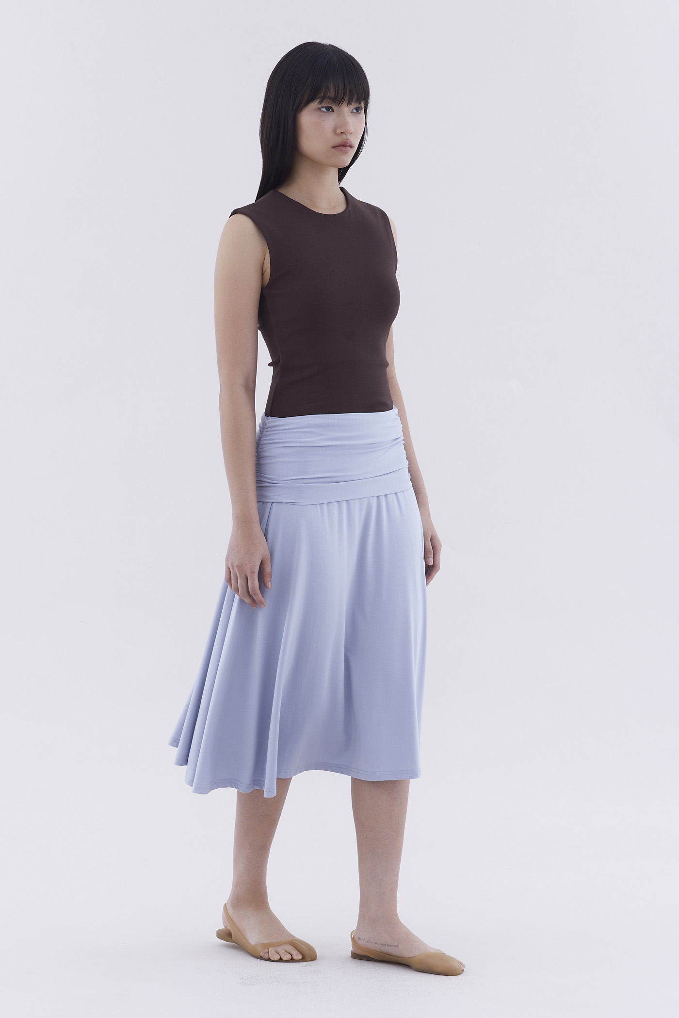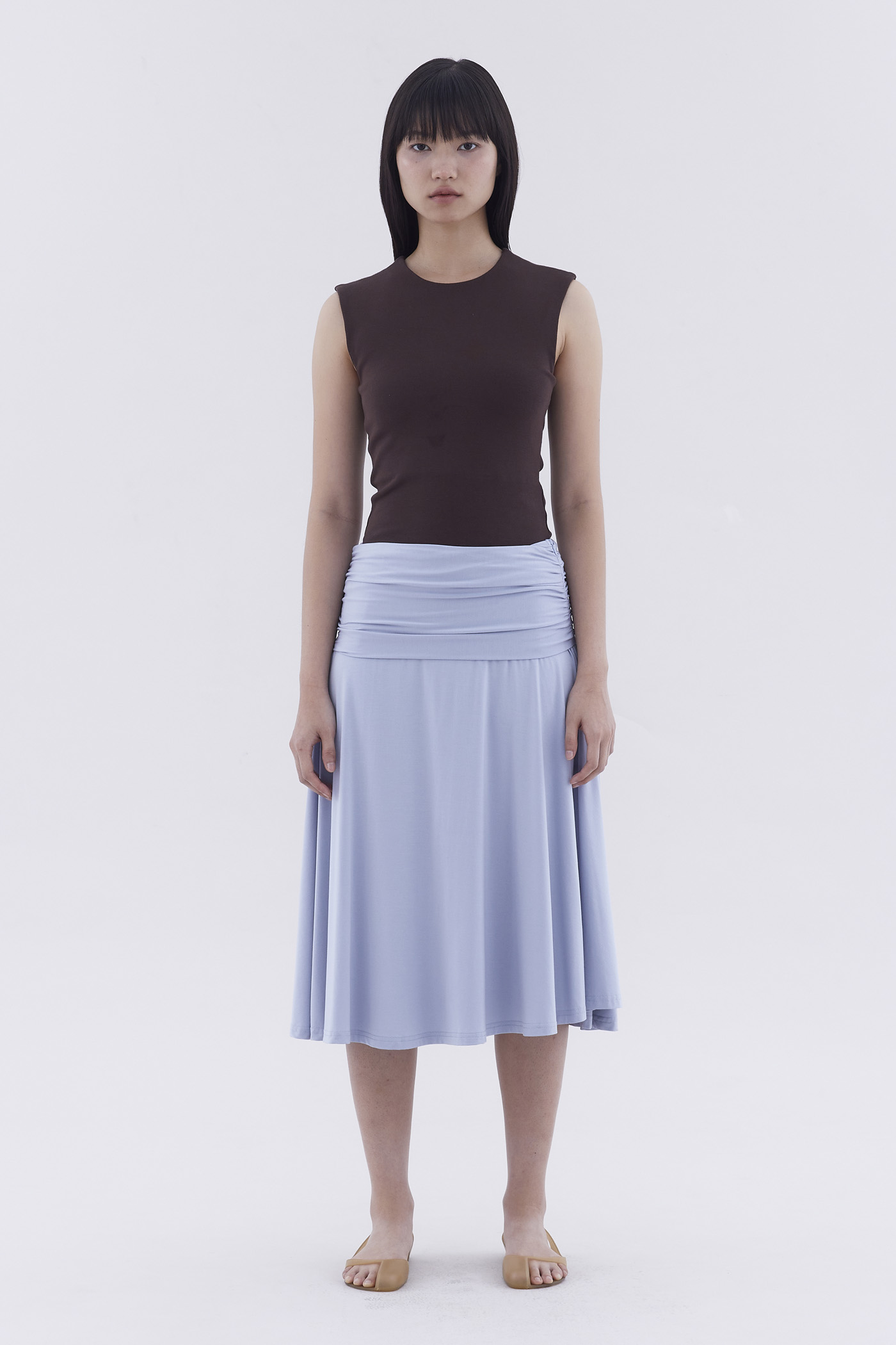 Fluid forms. Made from smooth and flowy fabric, this midi skirt features a stretchy and ruched foldover waist, as well as a side zip closure. Worn in a slim fit.