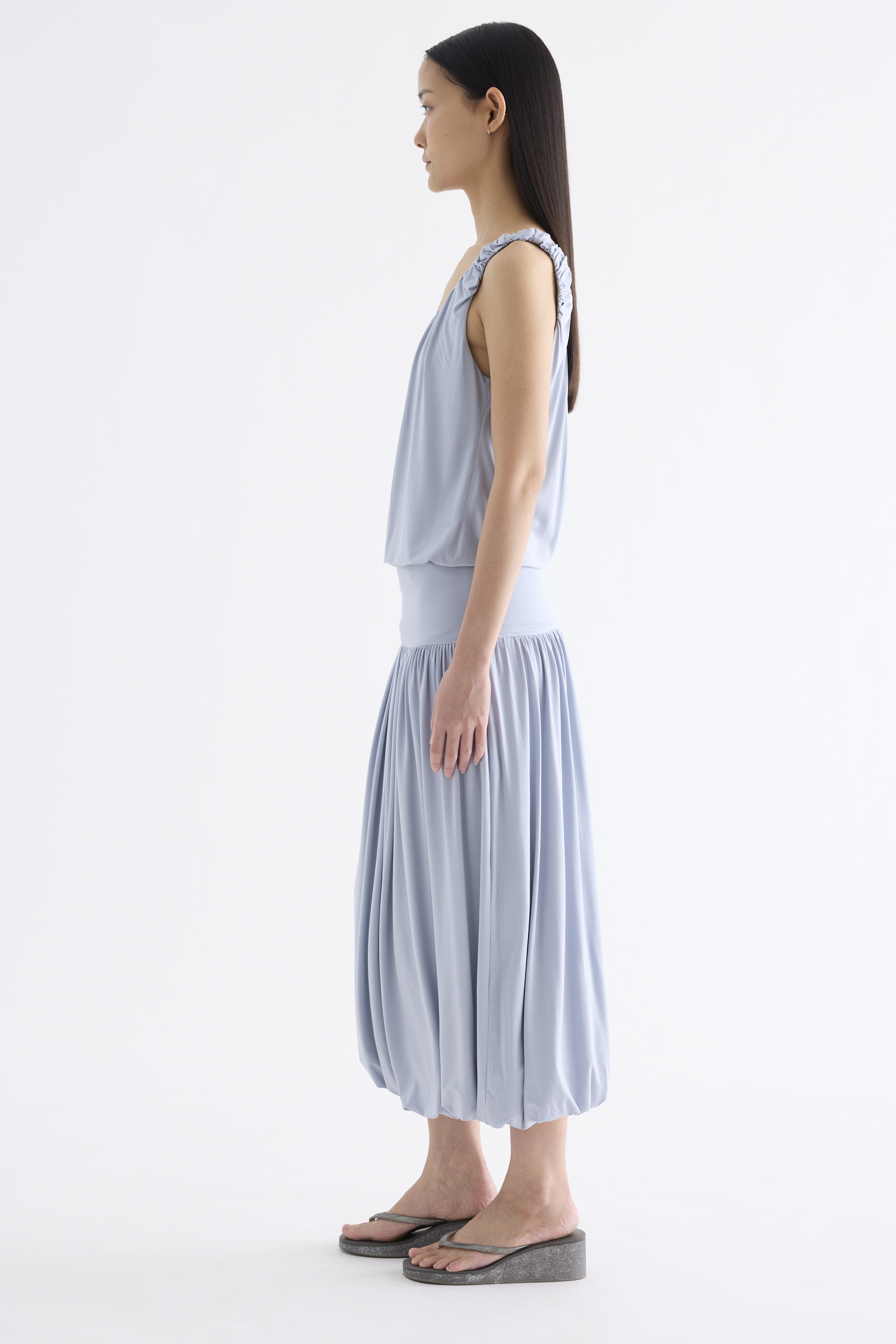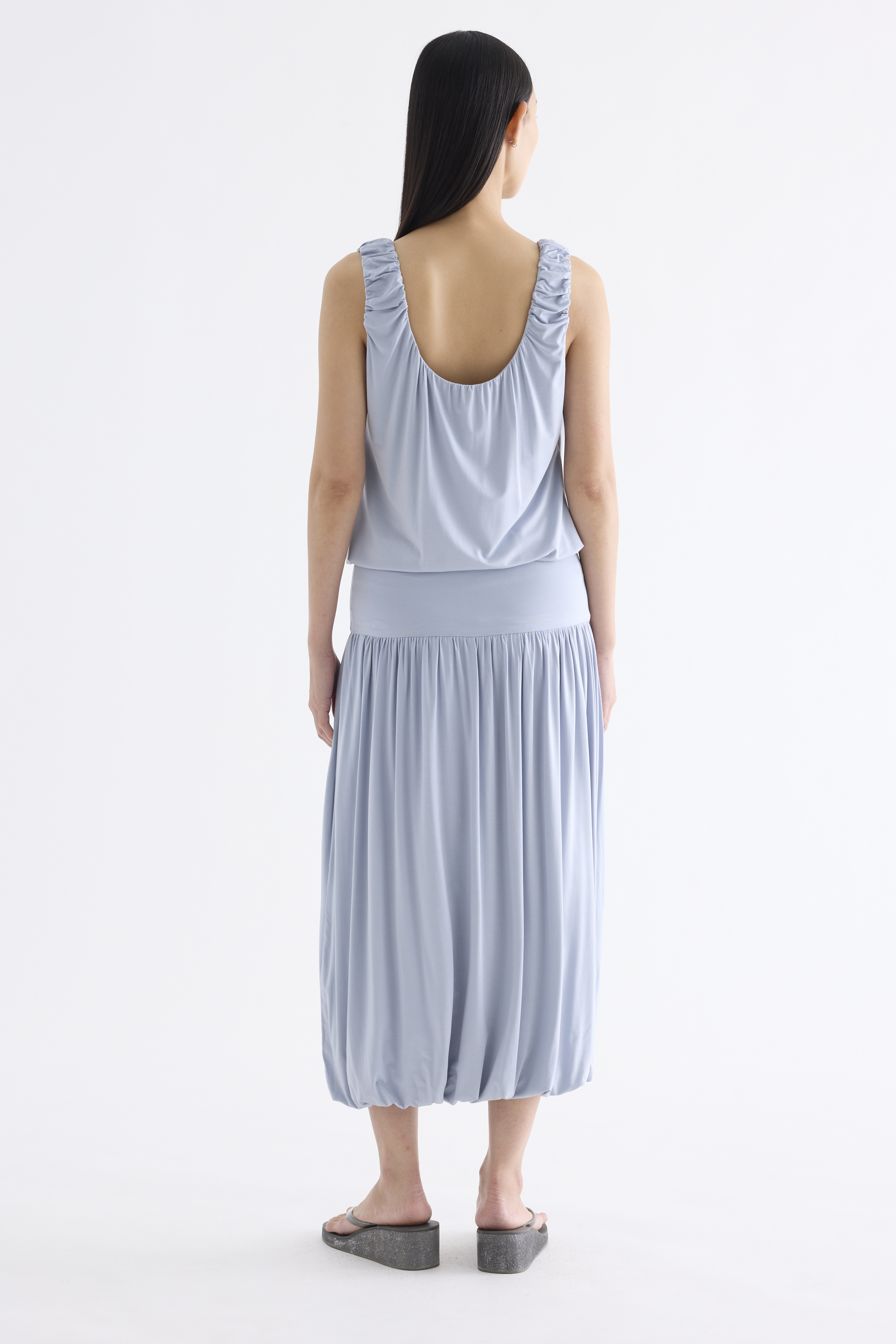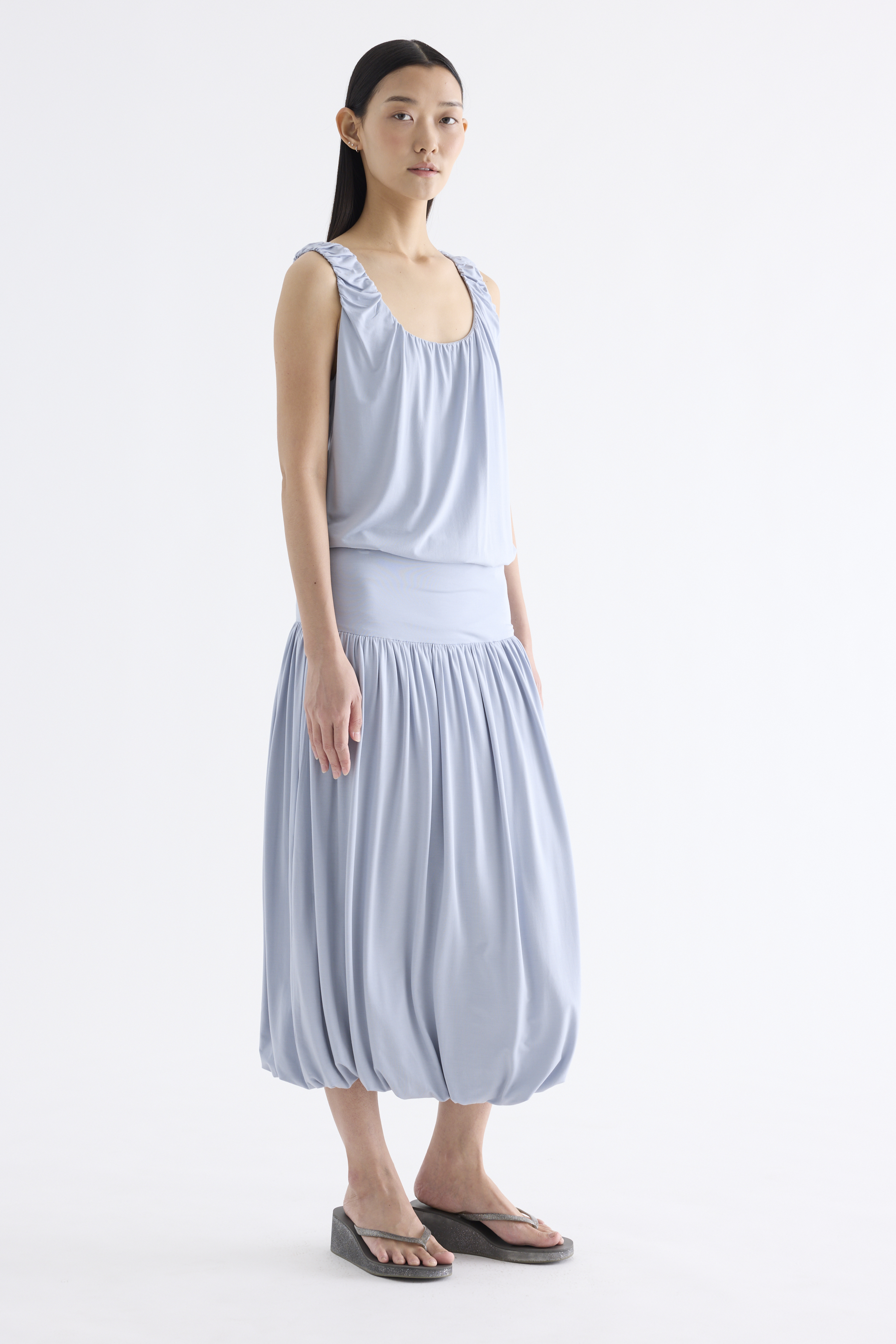 Volume, up. Made from smooth and stretchy fabric, this midi skirt features an extended waist panel and a gathered silhouette with a bubble hem. Worn in a relaxed fit with a size zip closure.