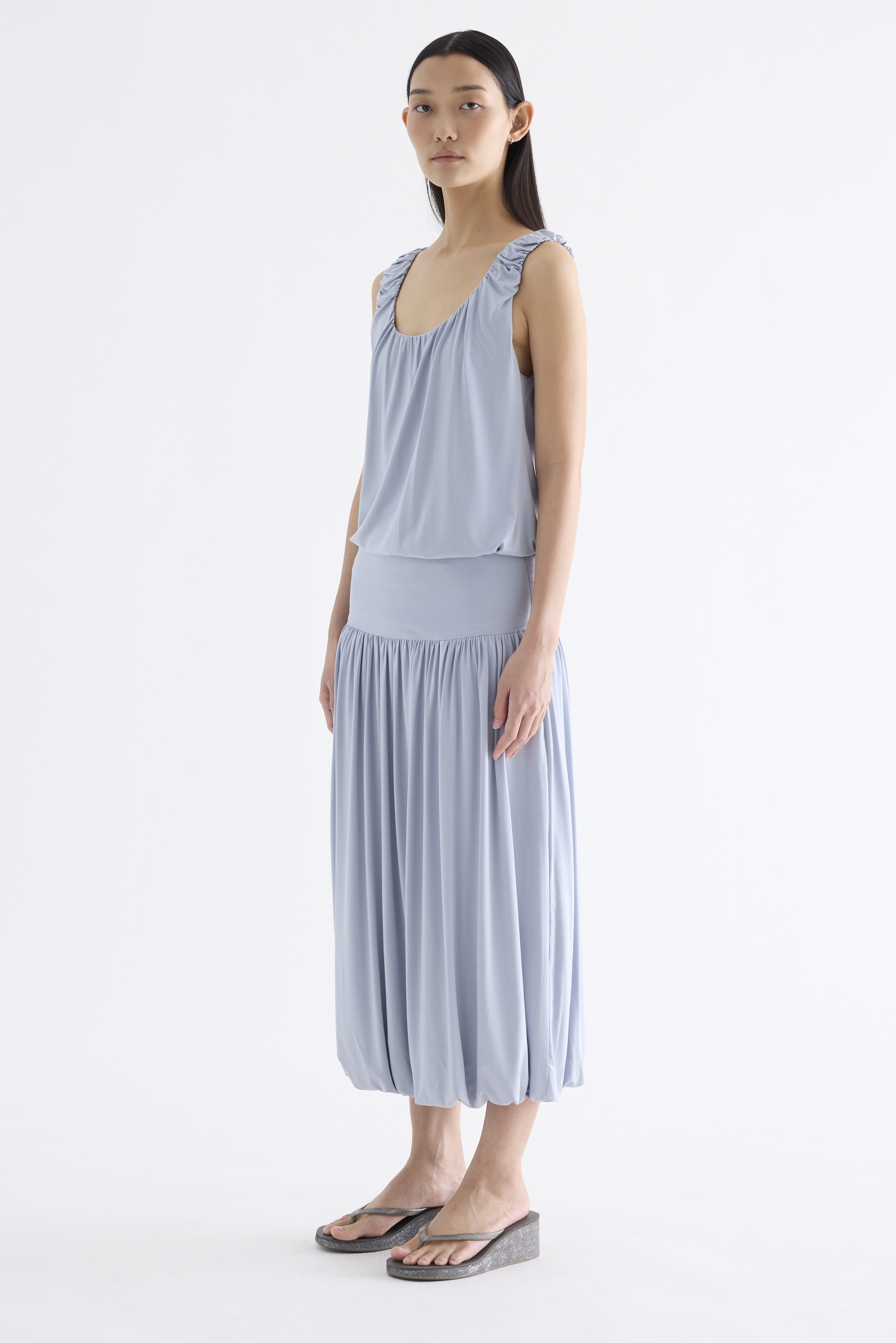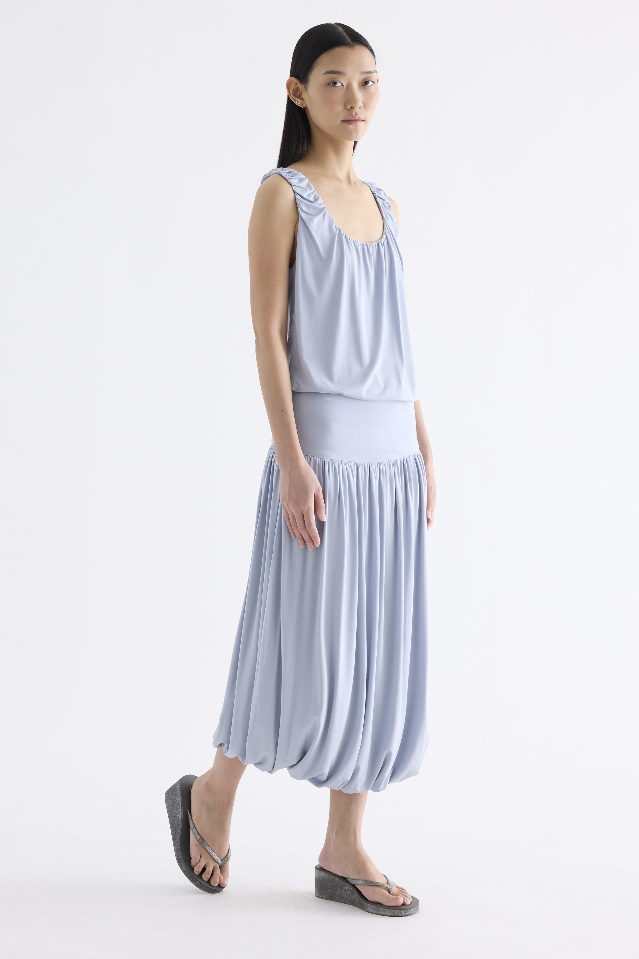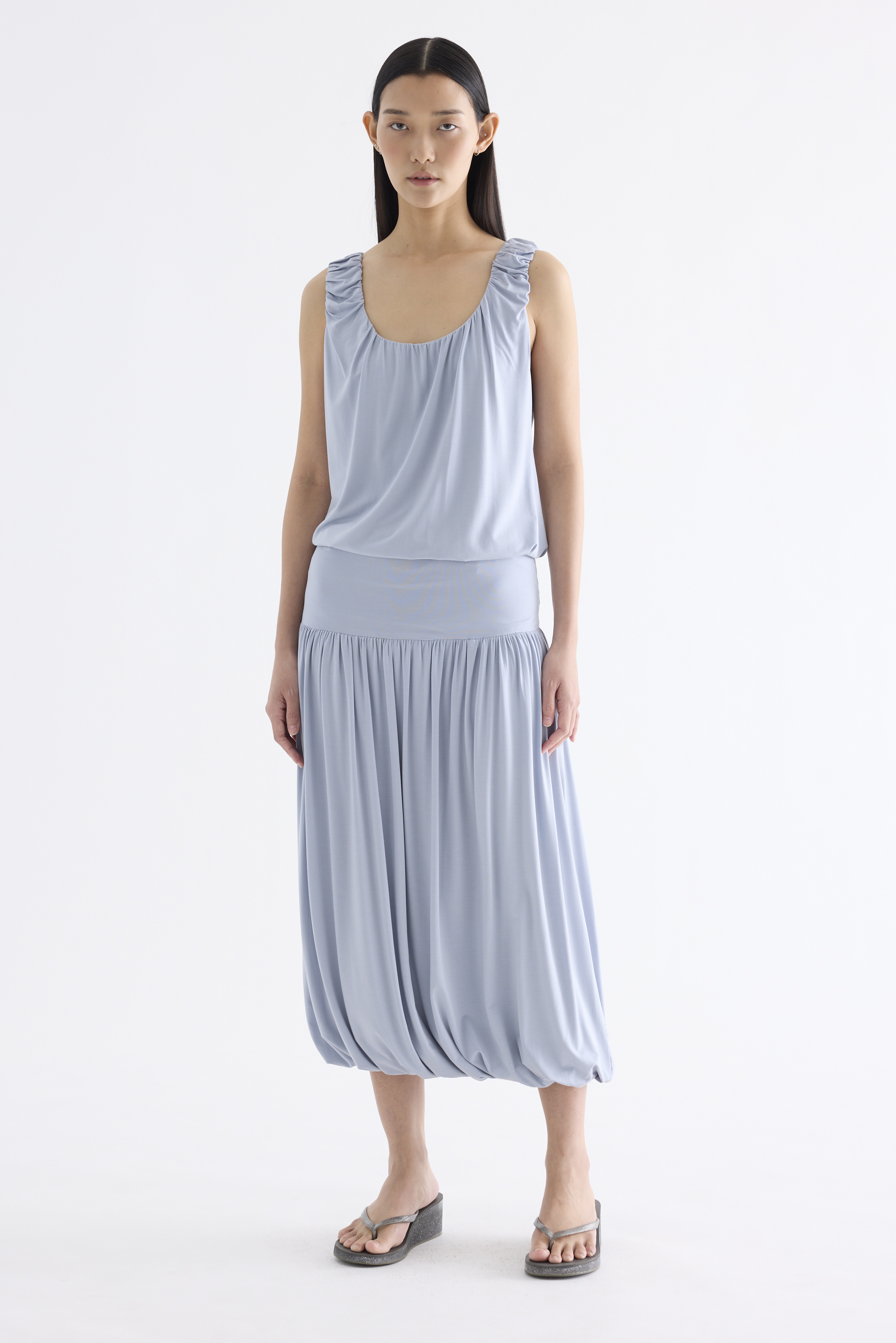 Volume, up. Made from smooth and stretchy fabric, this midi skirt features an extended waist panel and a gathered silhouette with a bubble hem. Worn in a relaxed fit with a size zip closure.