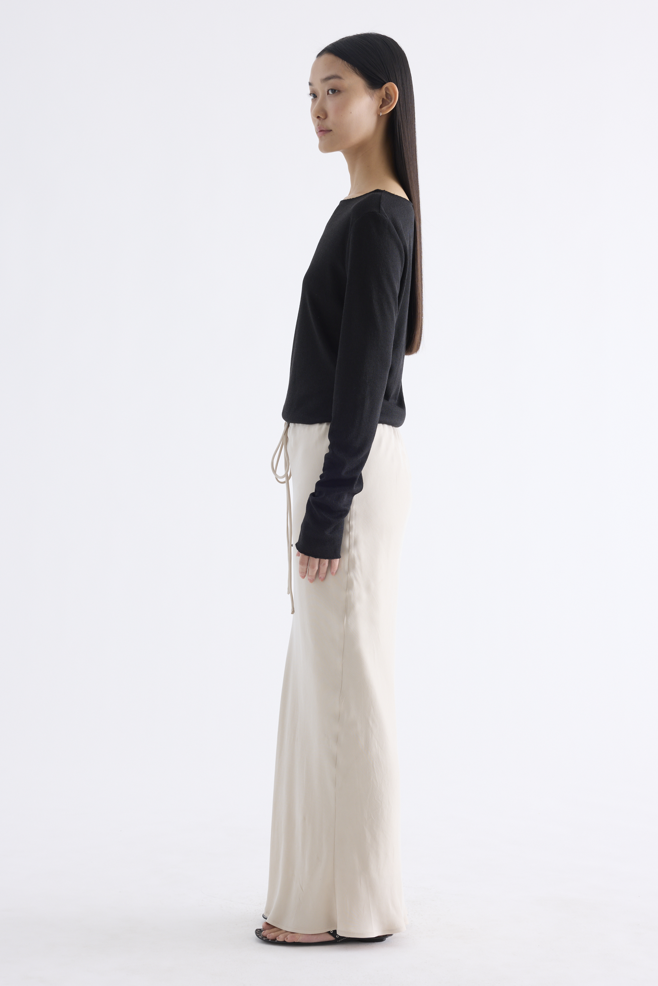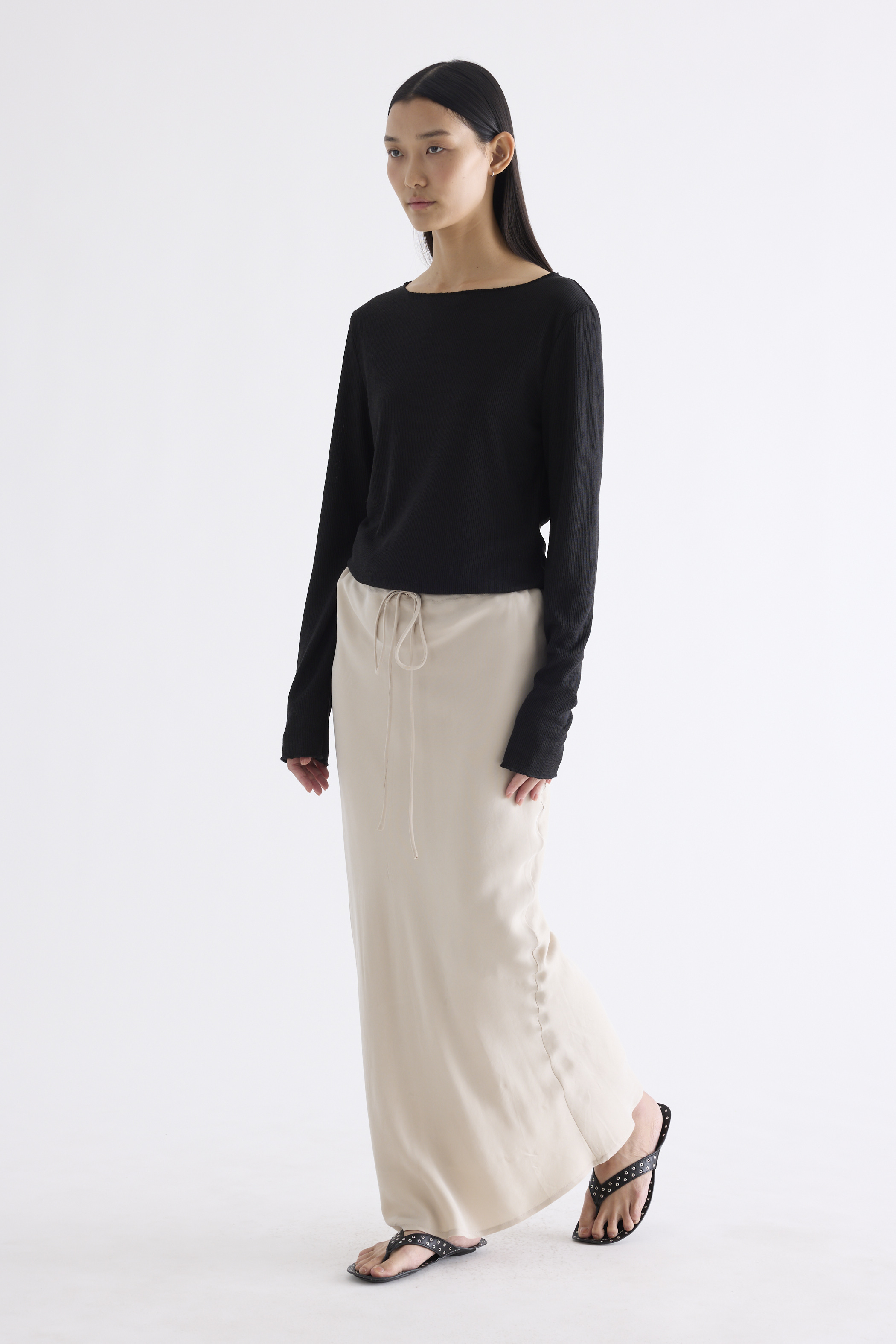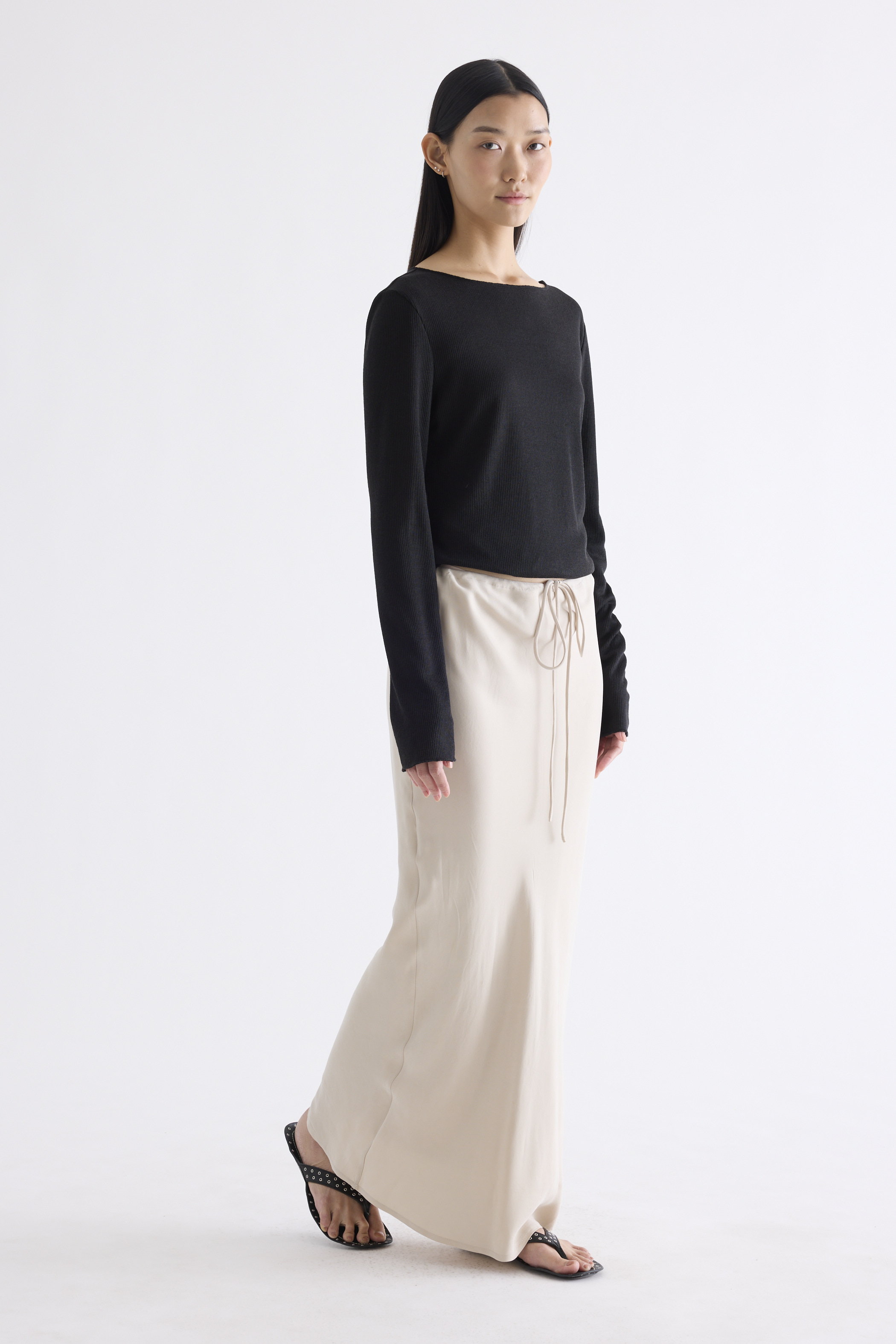 Fluid forms. Made from soft and smooth fabric, this maxi skirt features a bias-cut silhouette with an elasticated drawstring waistband. Worn in a slim fit.