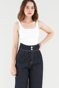 Occasion ready. Made from smooth, satiny fabric, this sleeveless top features a wide neckline, non-adjustable wide shoulder straps and raised seams beneath the bust. Fits slim in a cropped length, with a zip closure at the back.