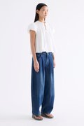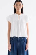 Here for the flare. Cut from crisp and softly structured cotton, this top features a frill-trimmed neckline, front opening with tie-strap, pin-tuck pleats and elasticated puffy sleeves. Worn in a relaxed swing silhouette.