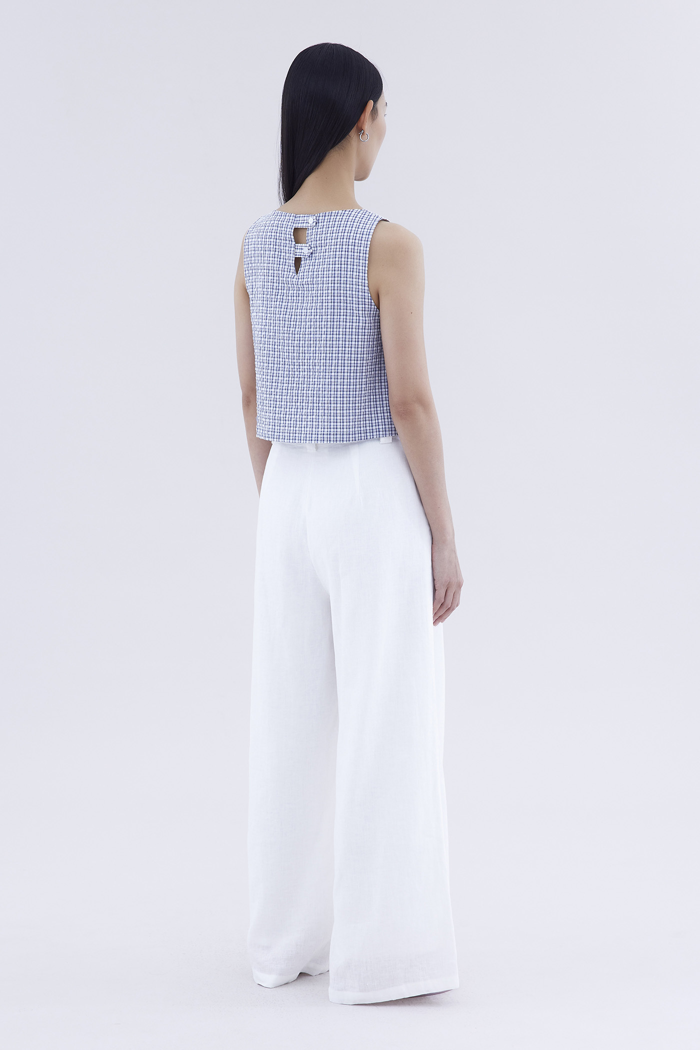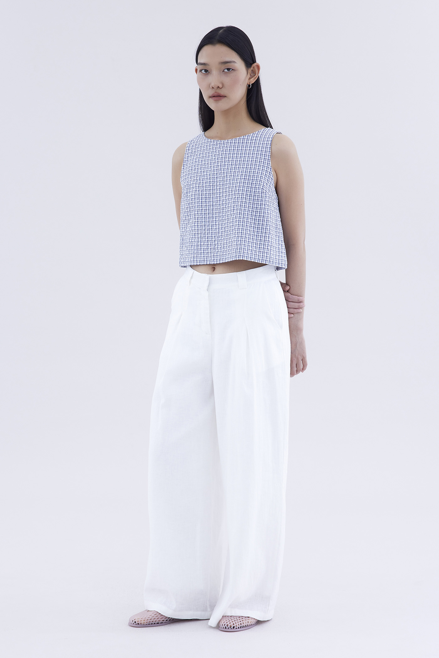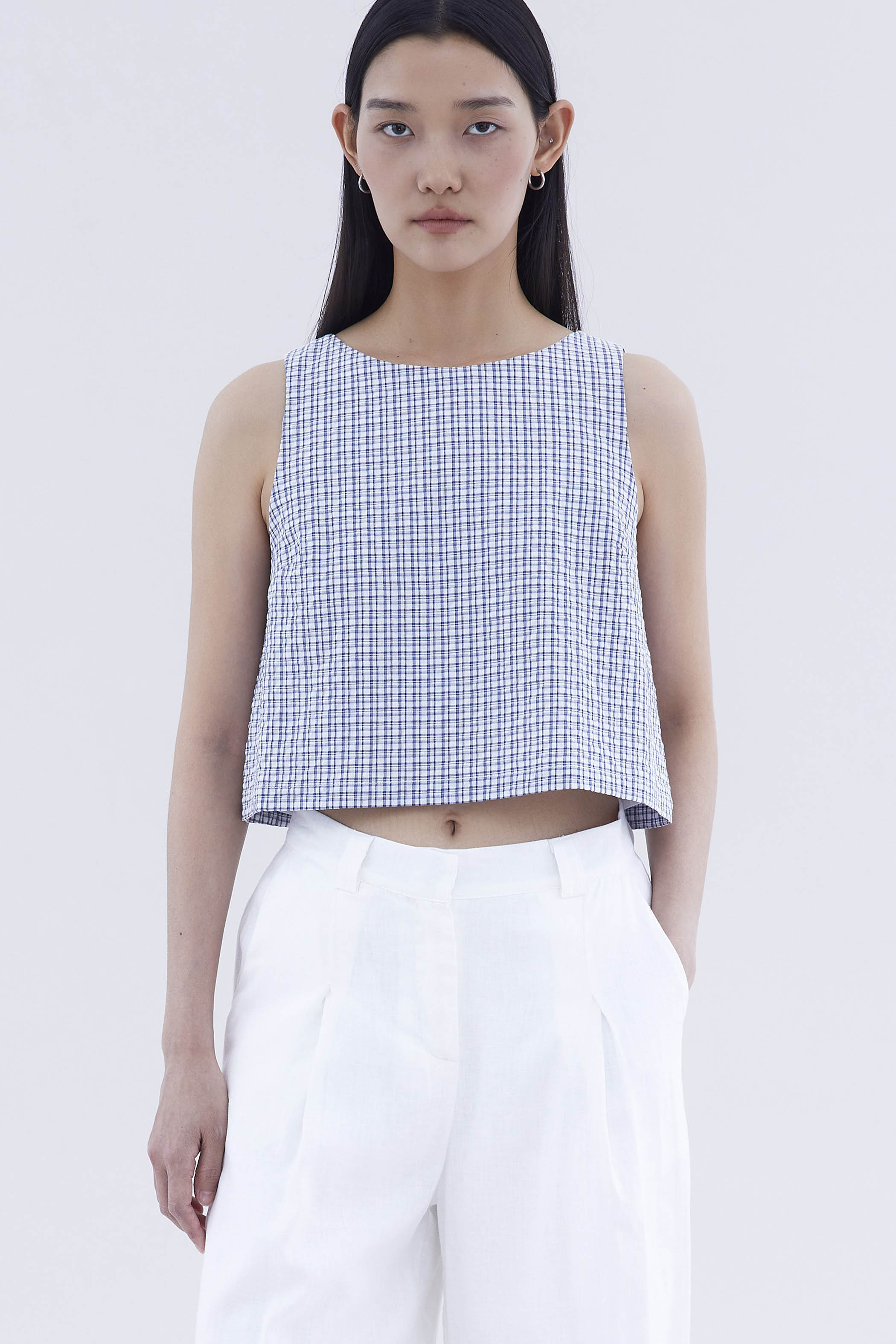 Clean lines. Made from airy and softly structured seersucker cotton, this sleeveless top features a round neckline and back buttons. Fits relaxed in a flattering boxy silhouette.