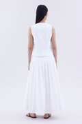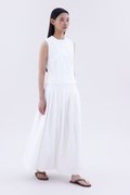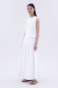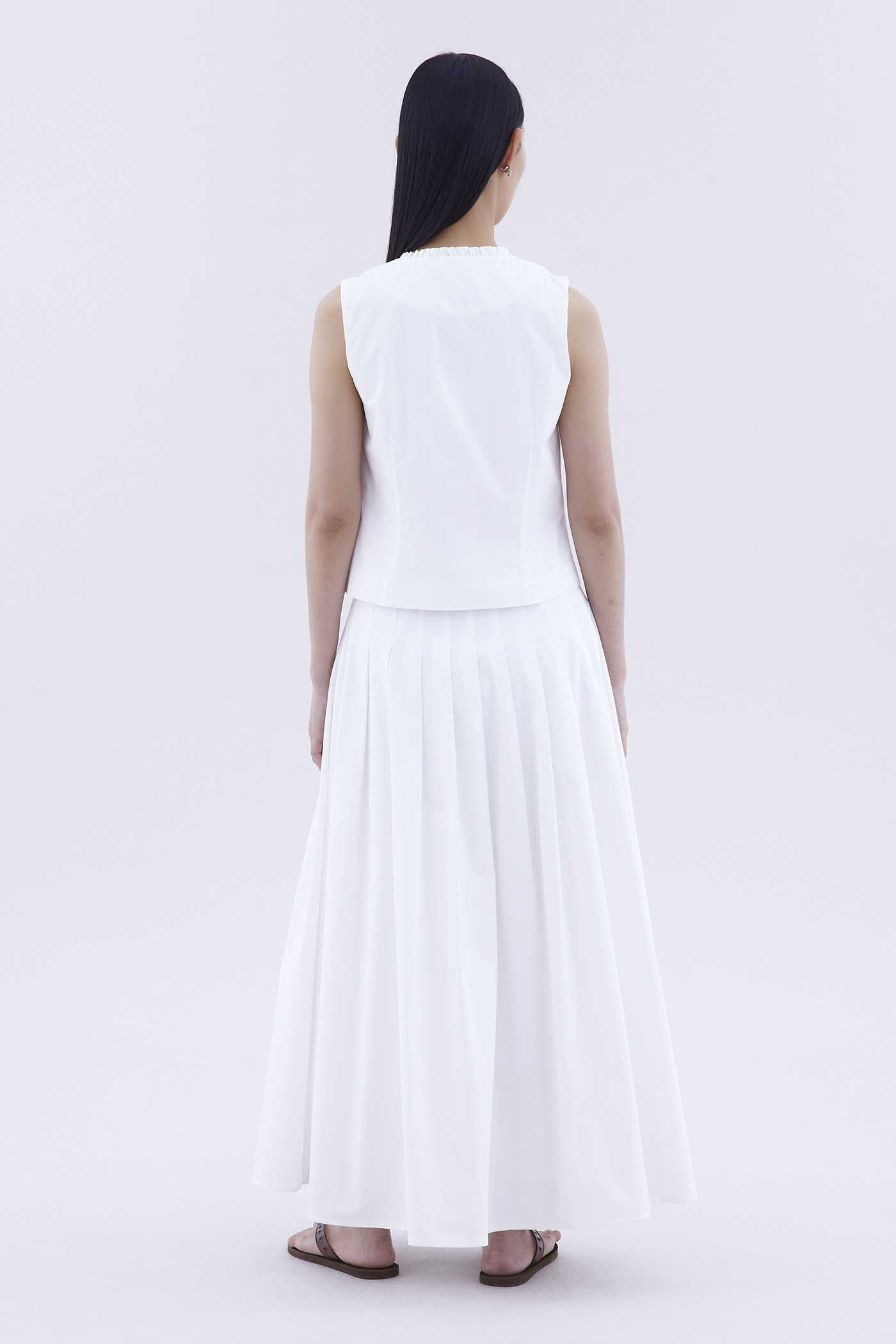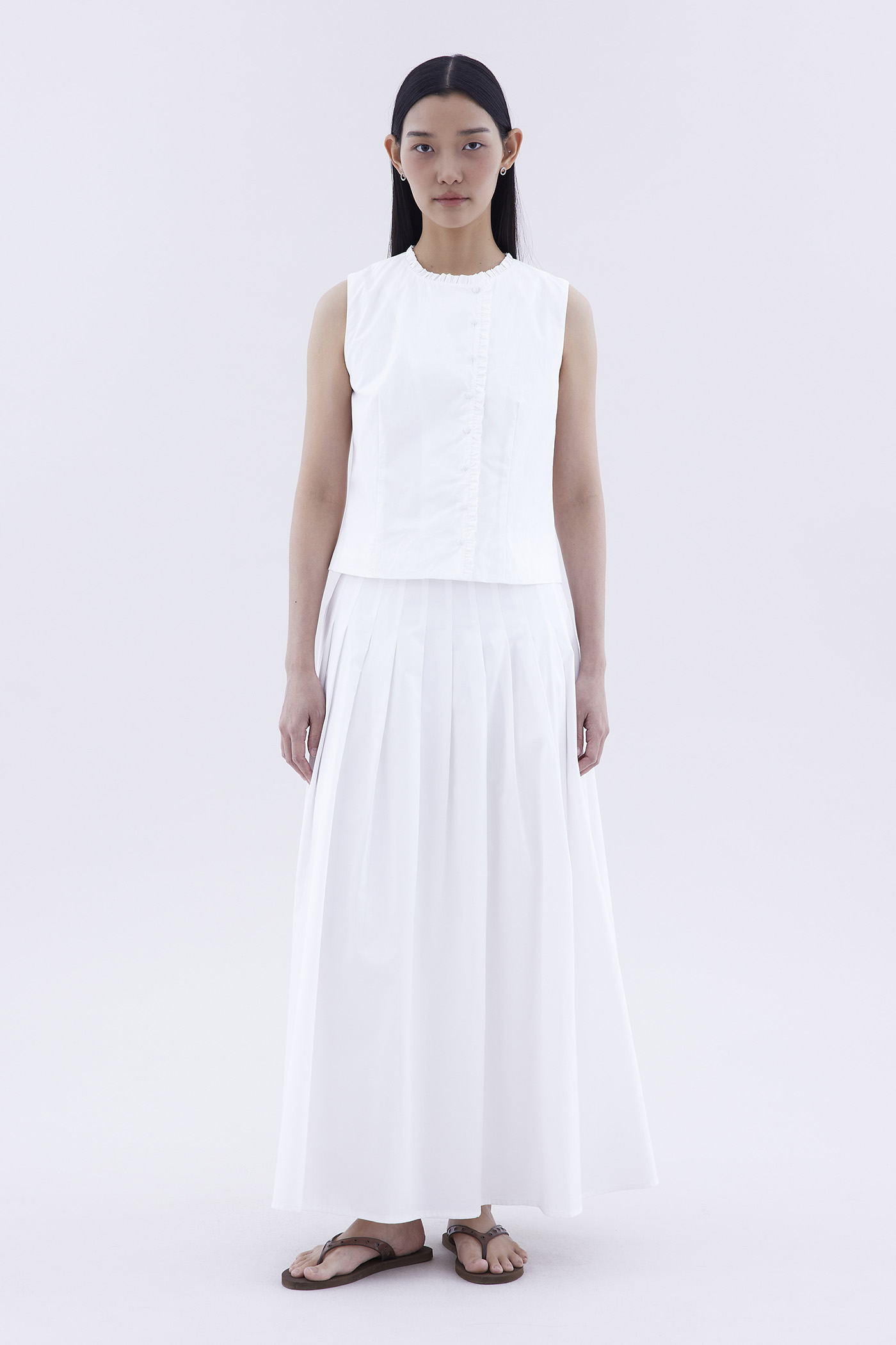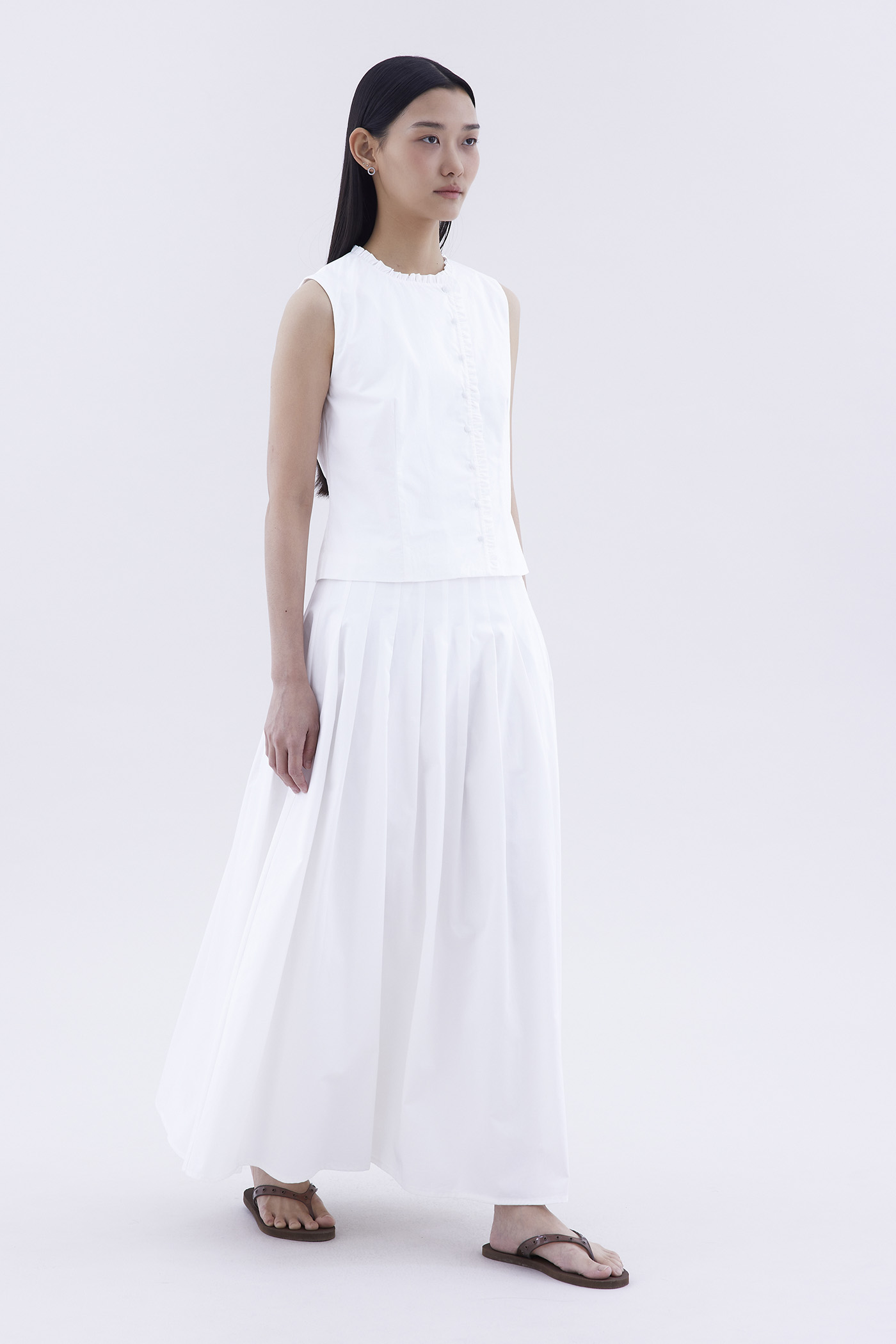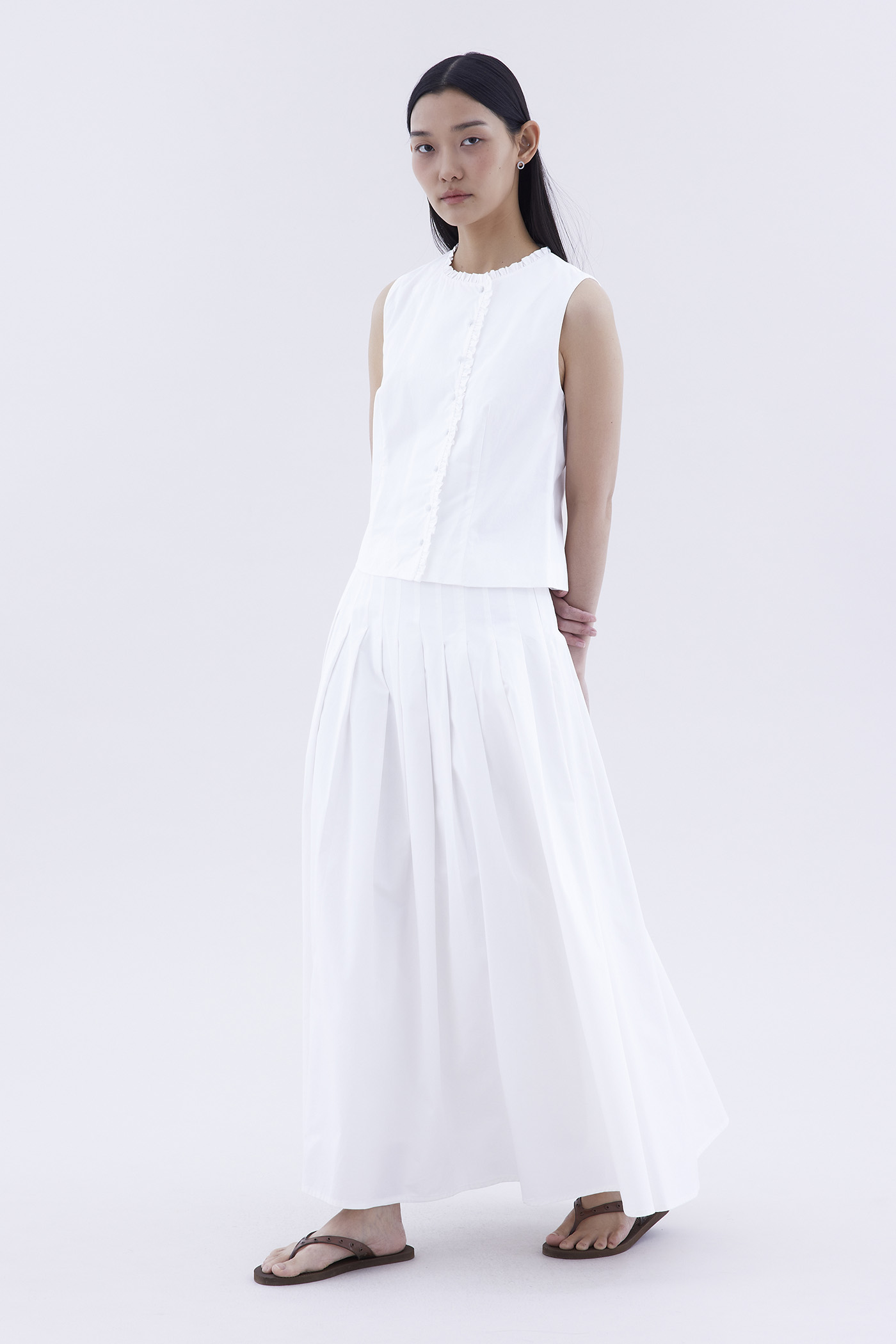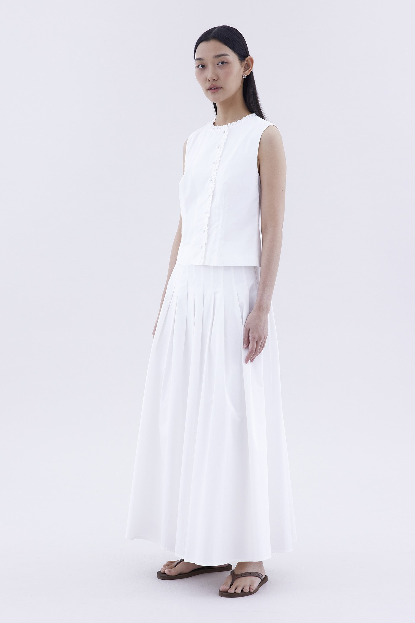 Textured and tailored. Made from crisp and softly structured cotton, this sleeveless top features a ruffle-trimmed round neckline and button-down front. Worn in a slim fit.
