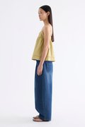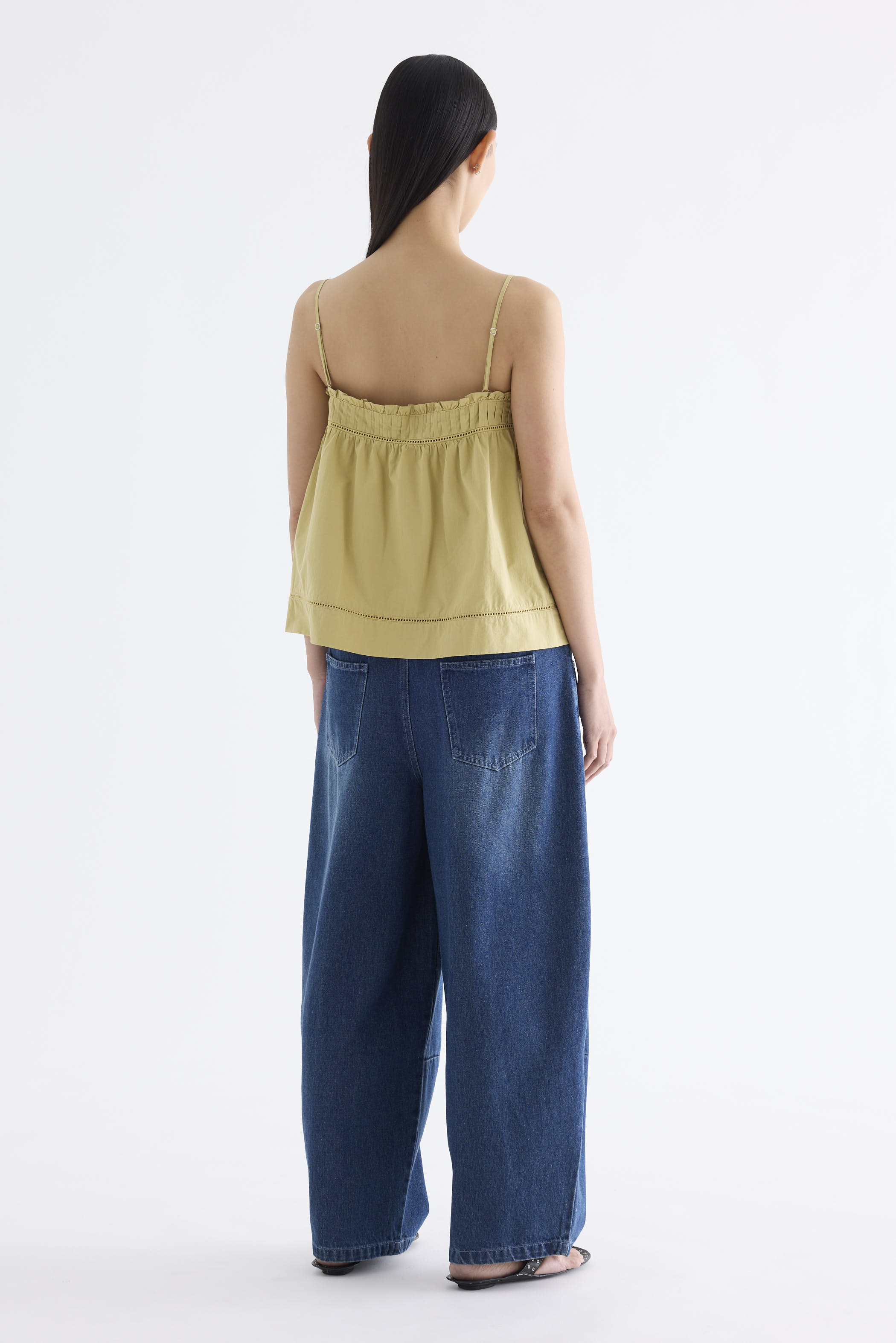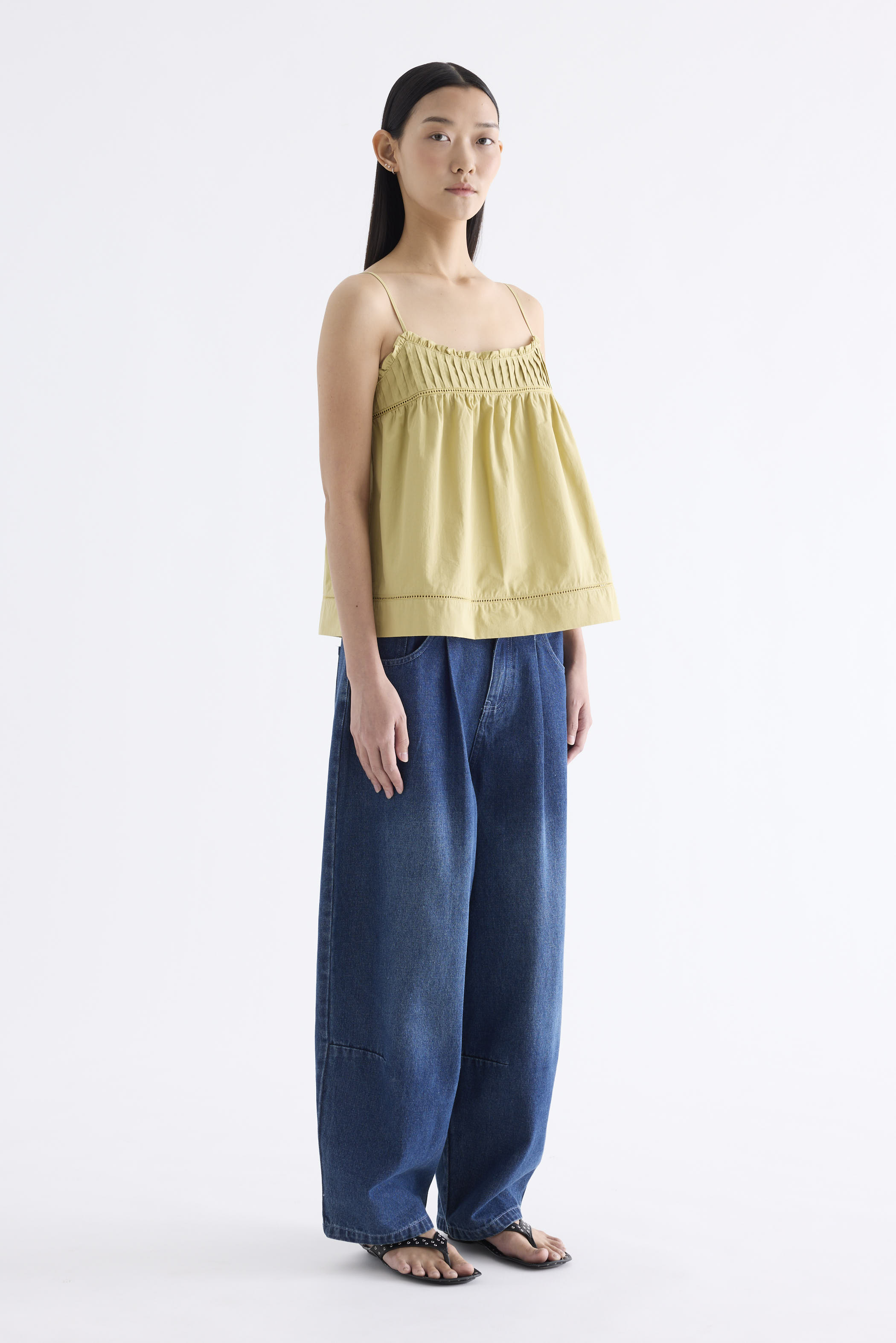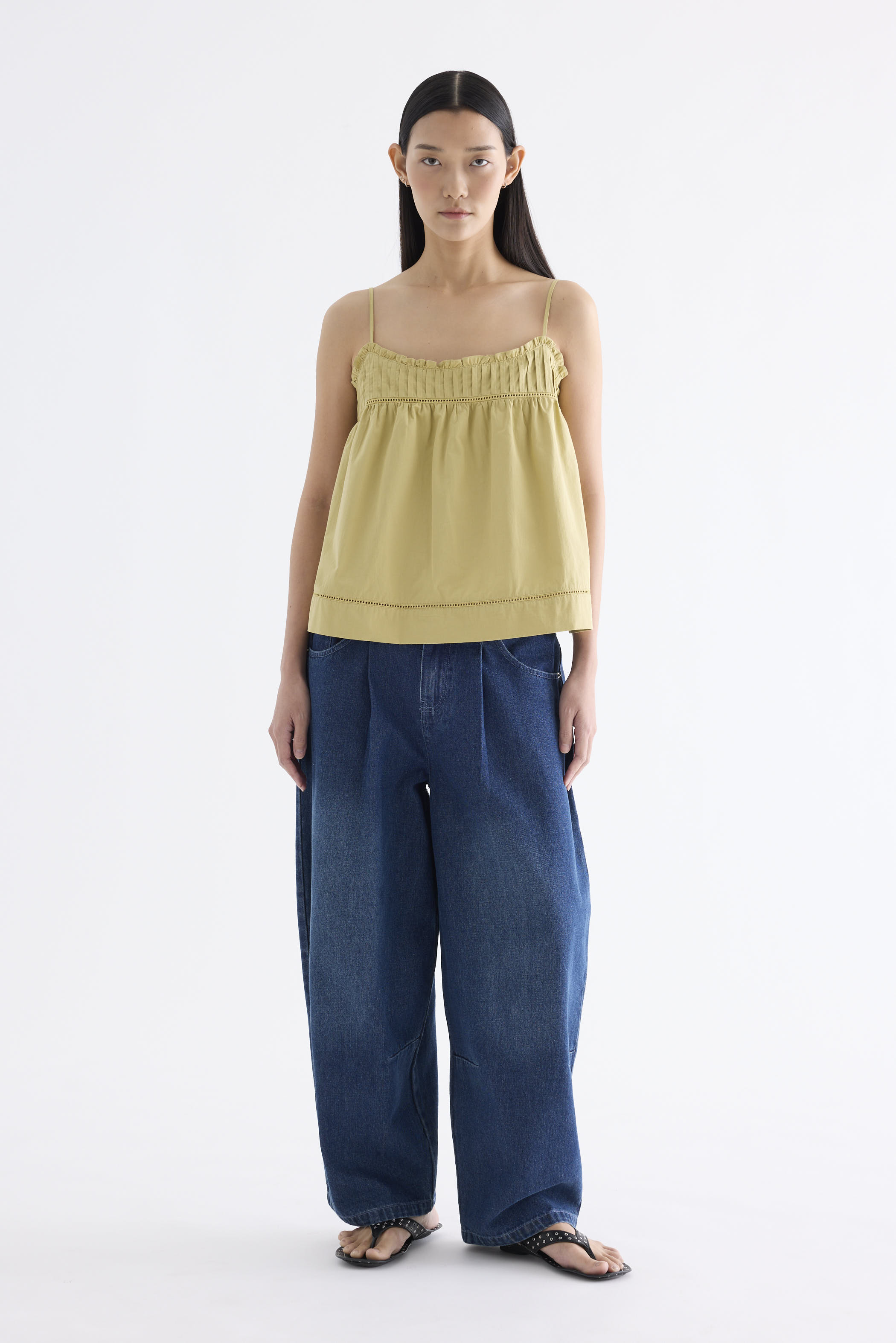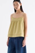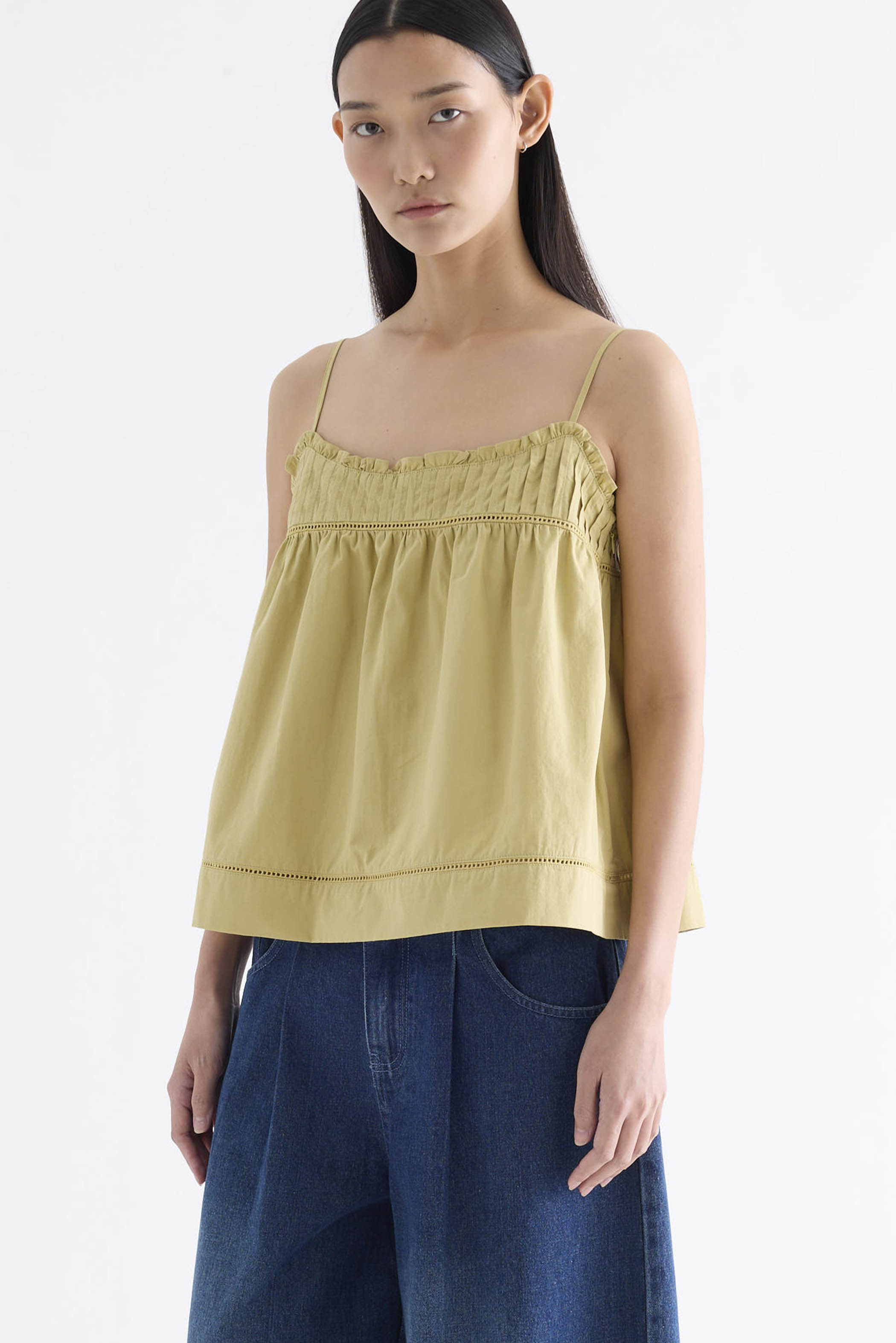 Catchy necklines. Cut from crisp and softly structured cotton, this sleeveless top features slim adjustable shoulder straps, a frill-trimmed neckline, a pleated bust and lace detailing. Worn in a relaxed empire silhouette with a side zip closure.