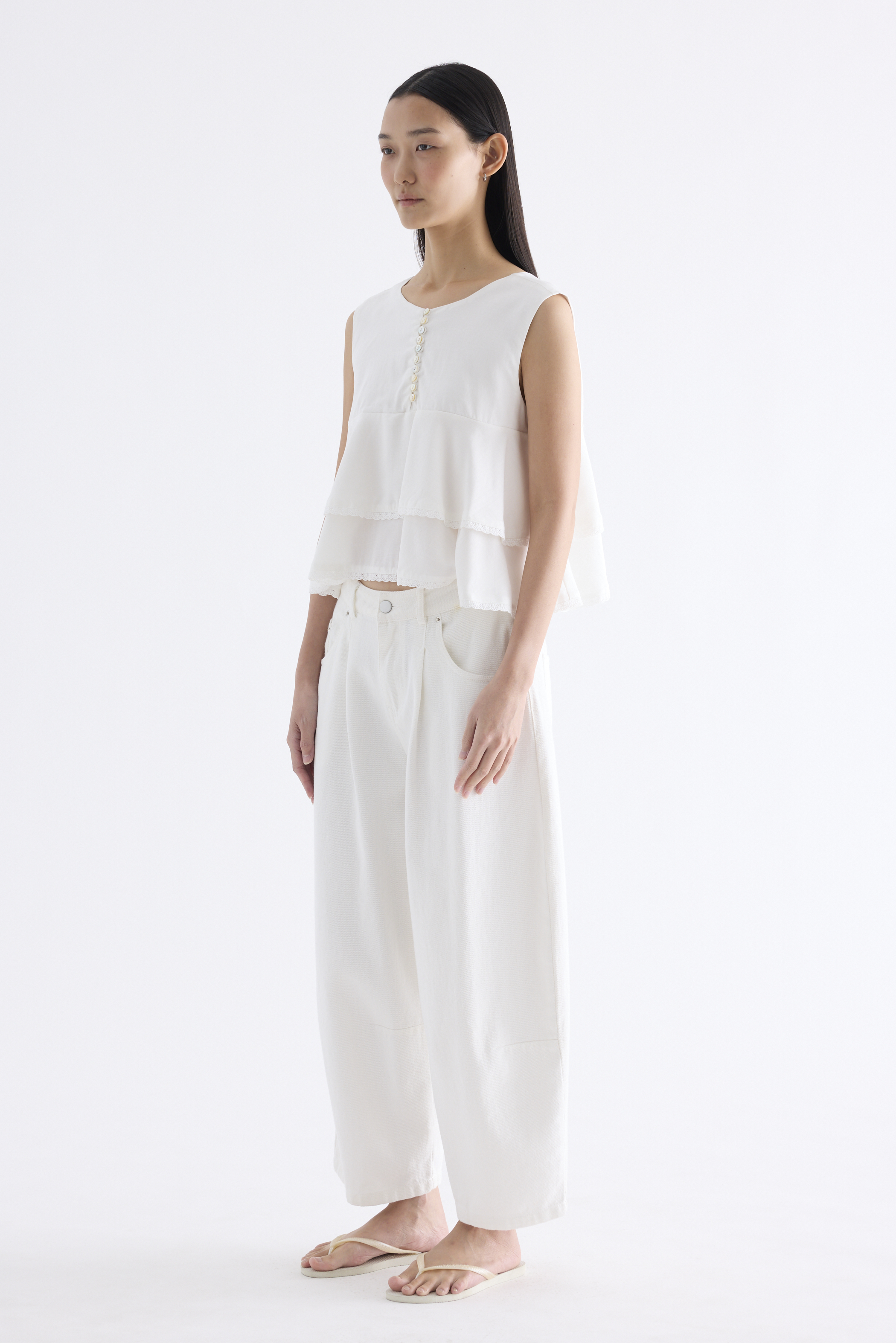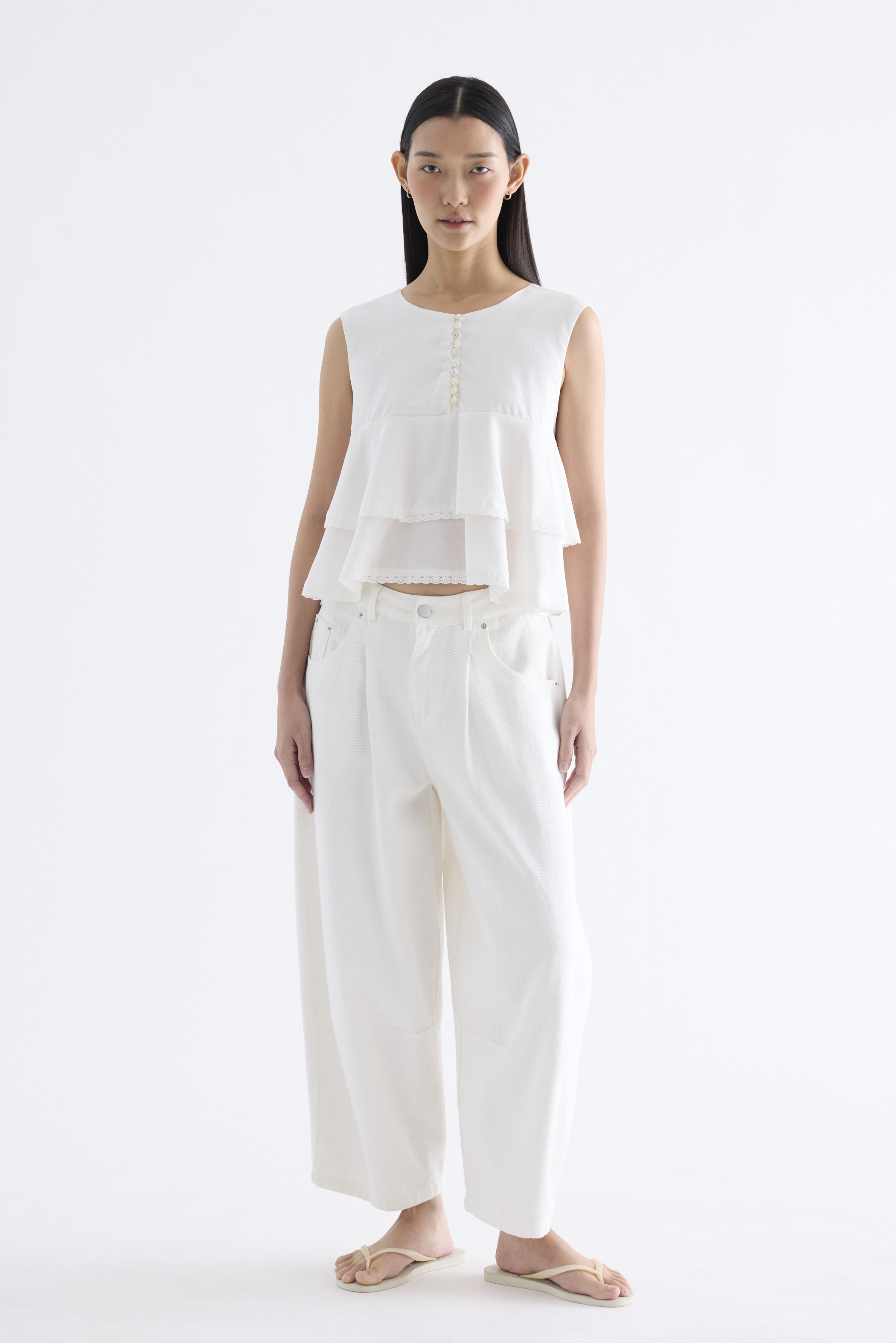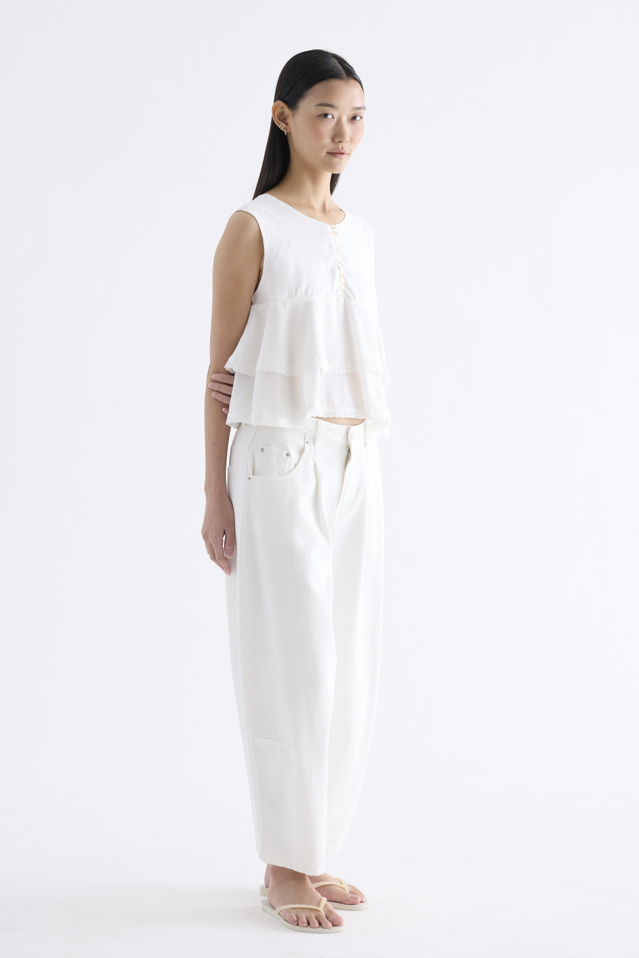 Good moves. Made from smooth and flowy Tencel, this sleeveless top features lace-trimmed tiers, a round neckline, front loop buttons and a V-shaped back opening with a tie-strap closure. Worn in a relaxed, swishy silhouette.