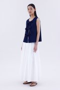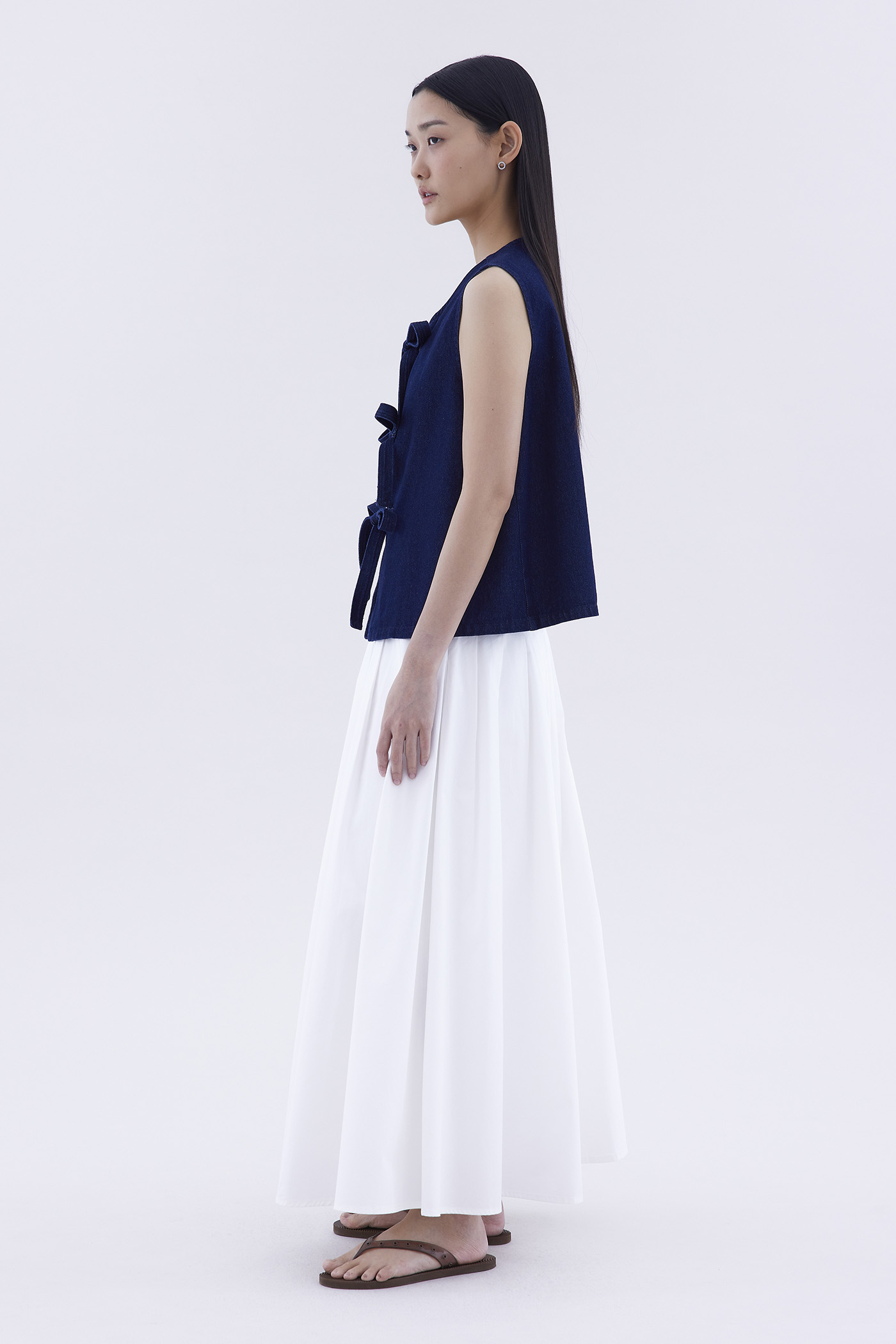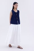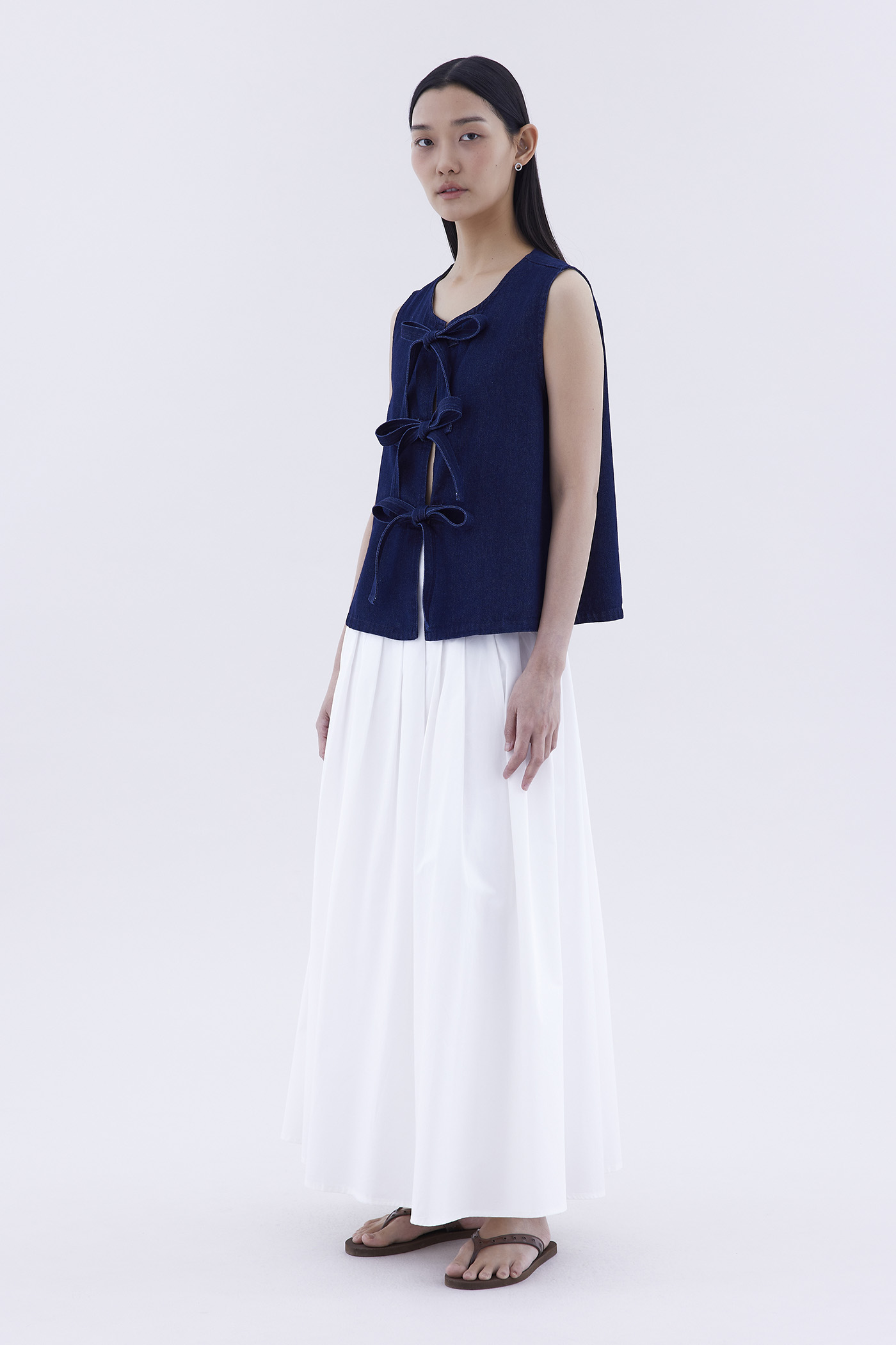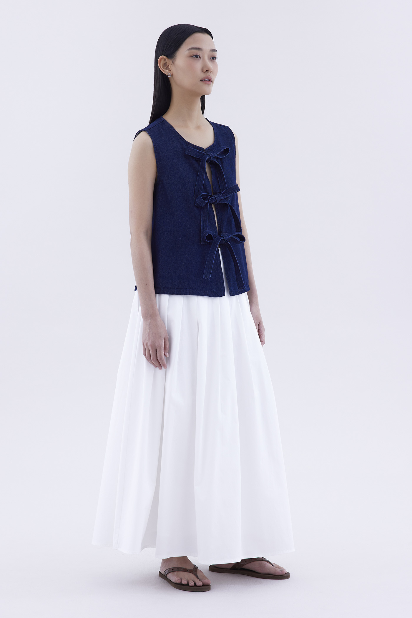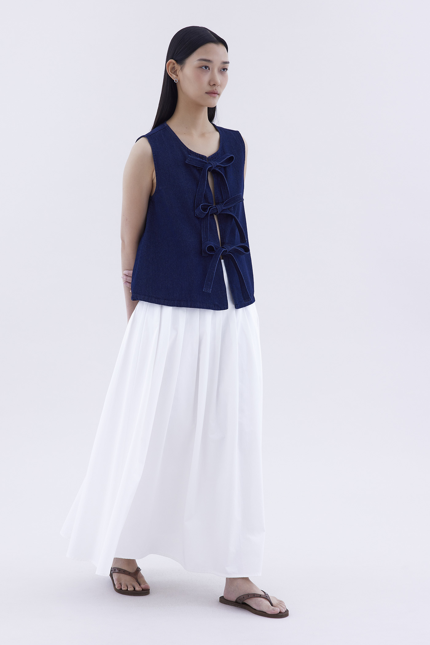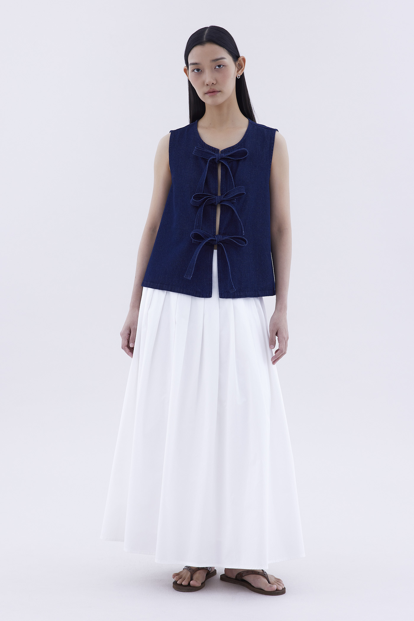 Bold and blue. Cut from softly structured cotton denim, this sleeveless top features a round neckline and an open front with tie-strap closures. Worn in a slim fit.