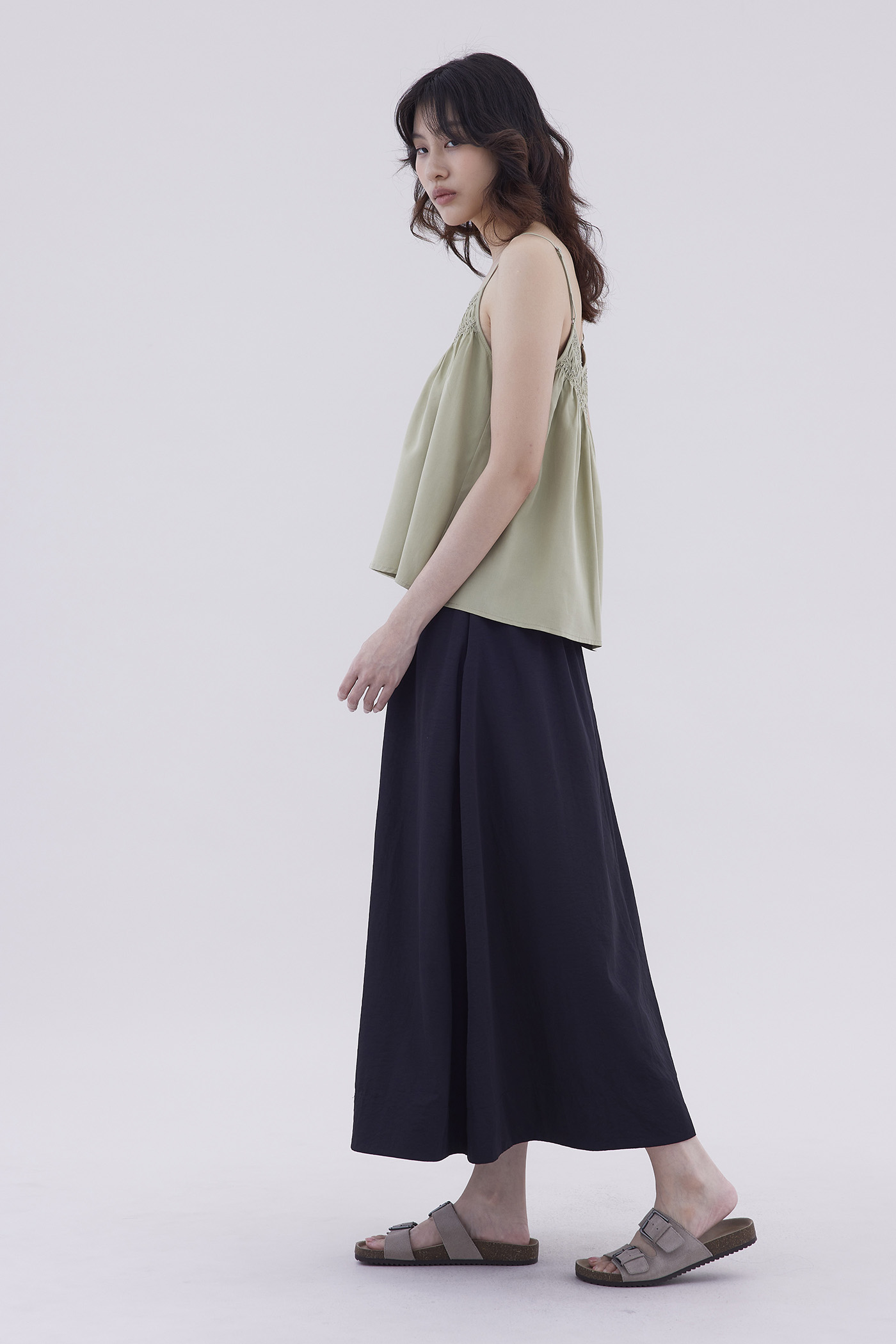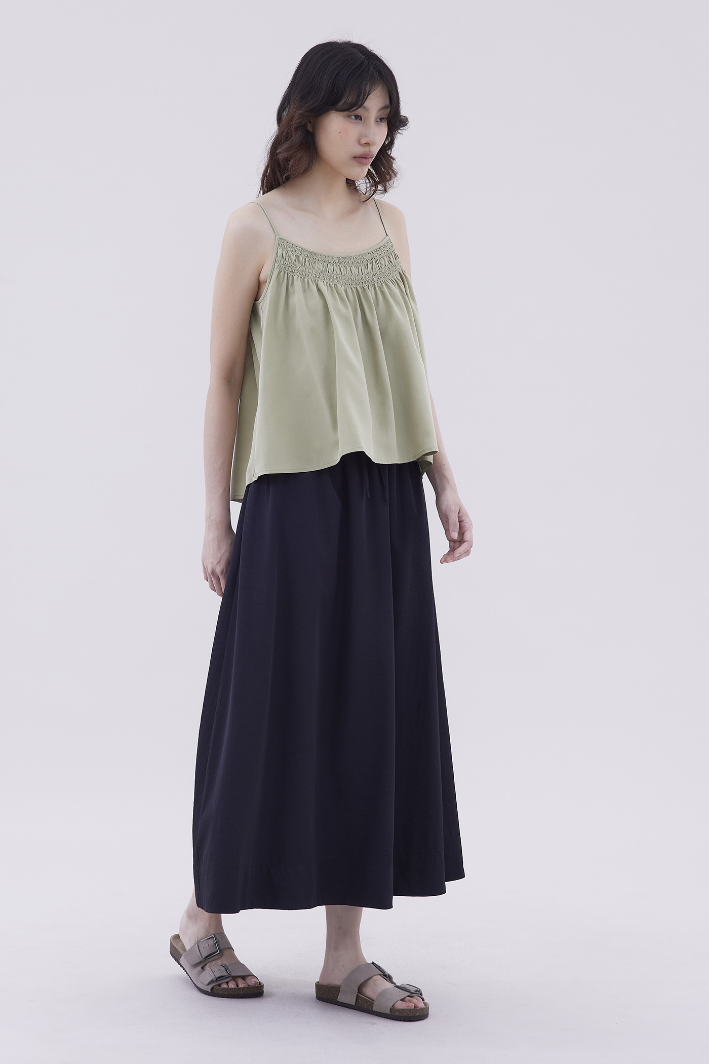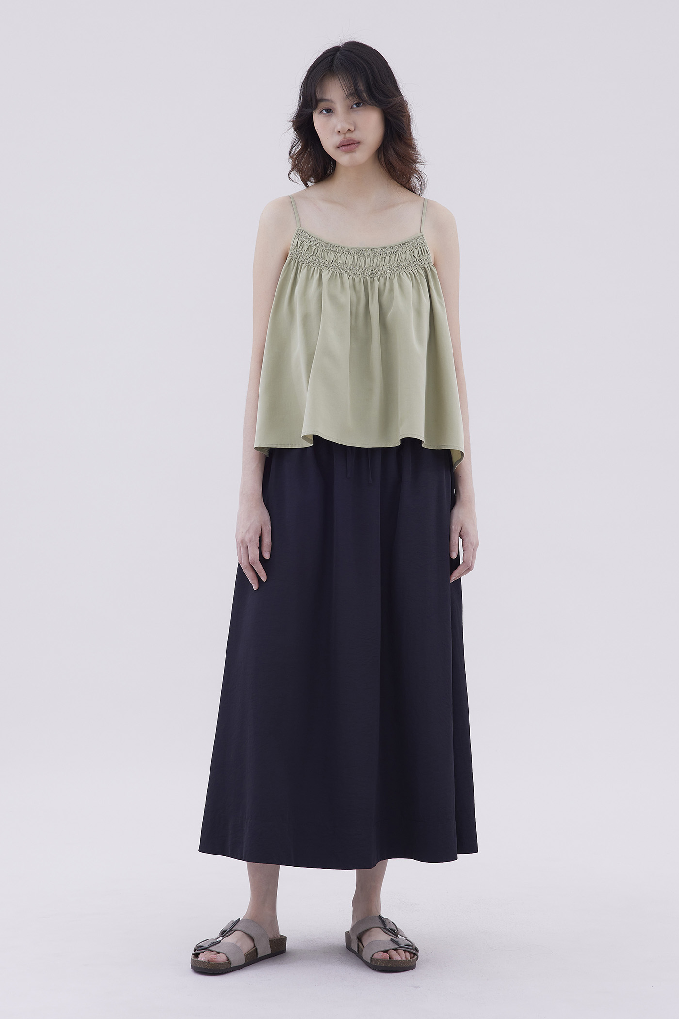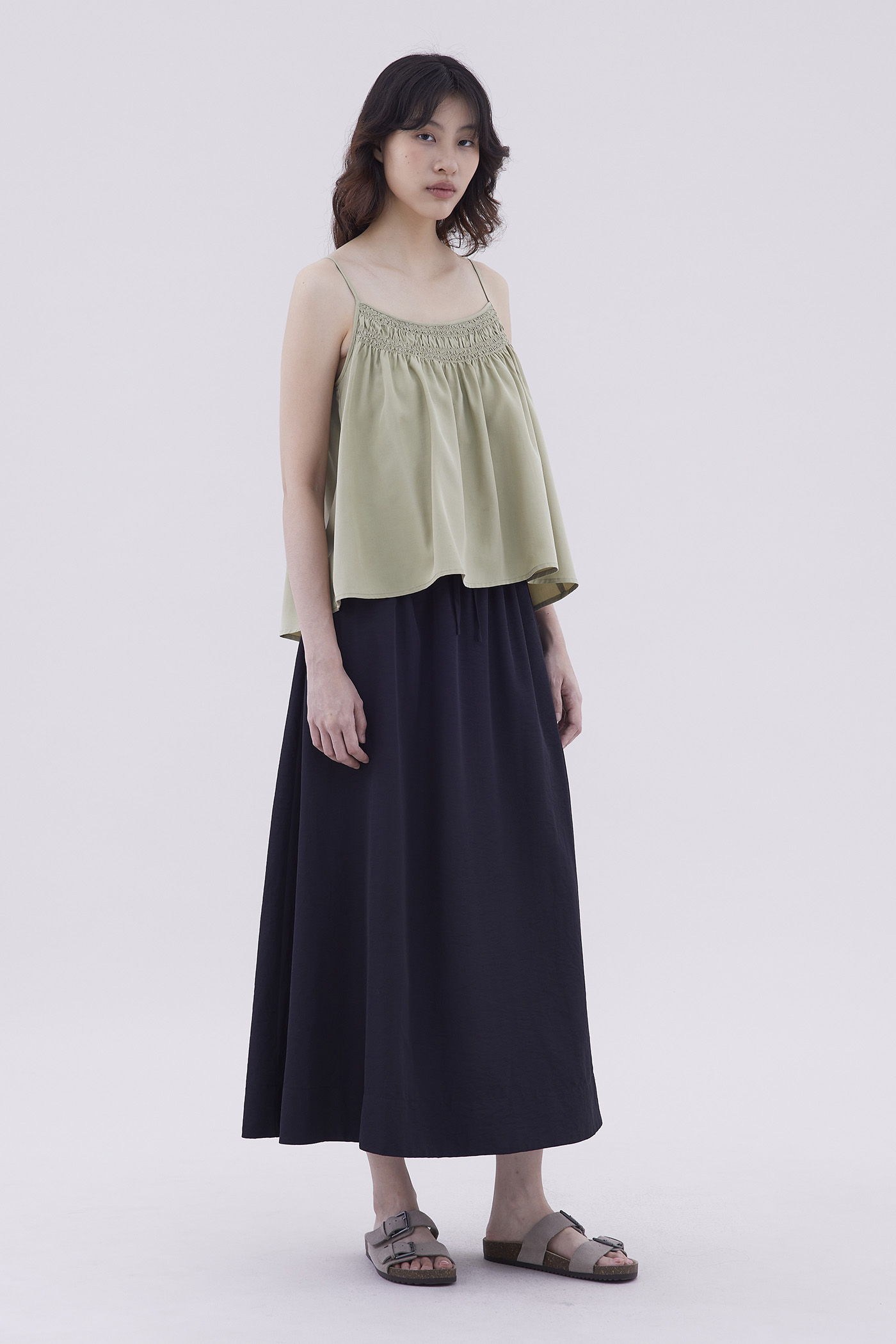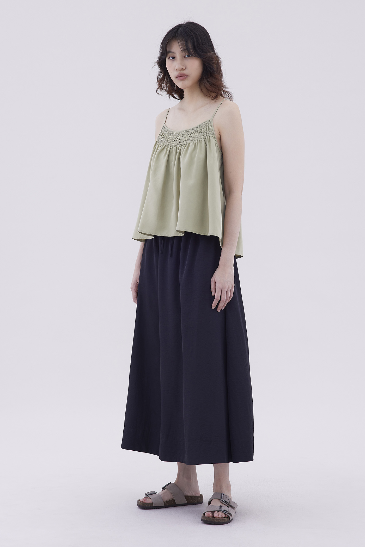 Catchy necklines. Made from light and flowy fabric, this sleeveless camisole features a smocked neckline and slim adjustable shoulder straps. Fits relaxed in a flared silhouette.