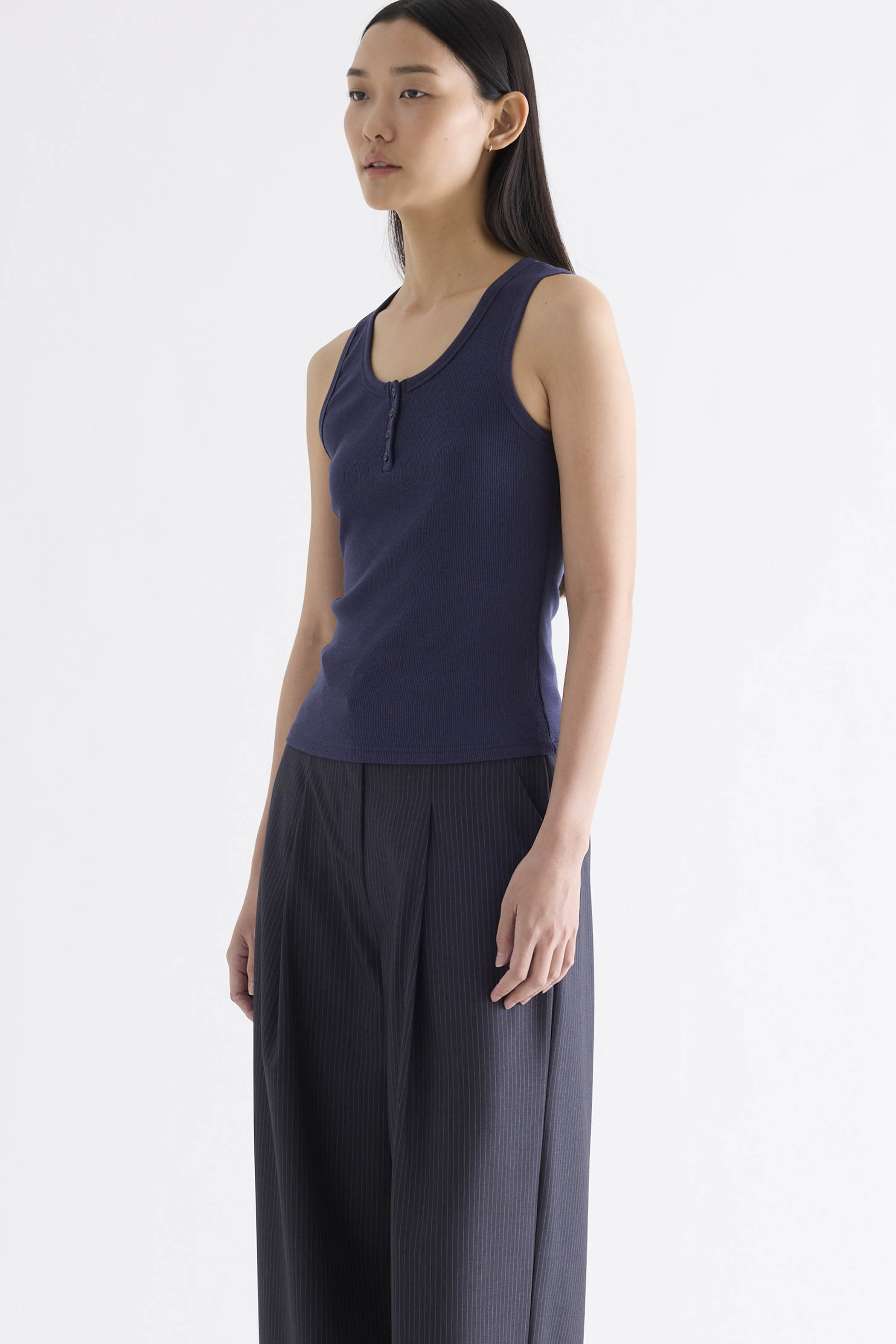 Your mix-and-match essential. Made from soft and ribbed knit, this sleeveless tank features a U-shaped neckline and half buttons. Worn in a slim fit.