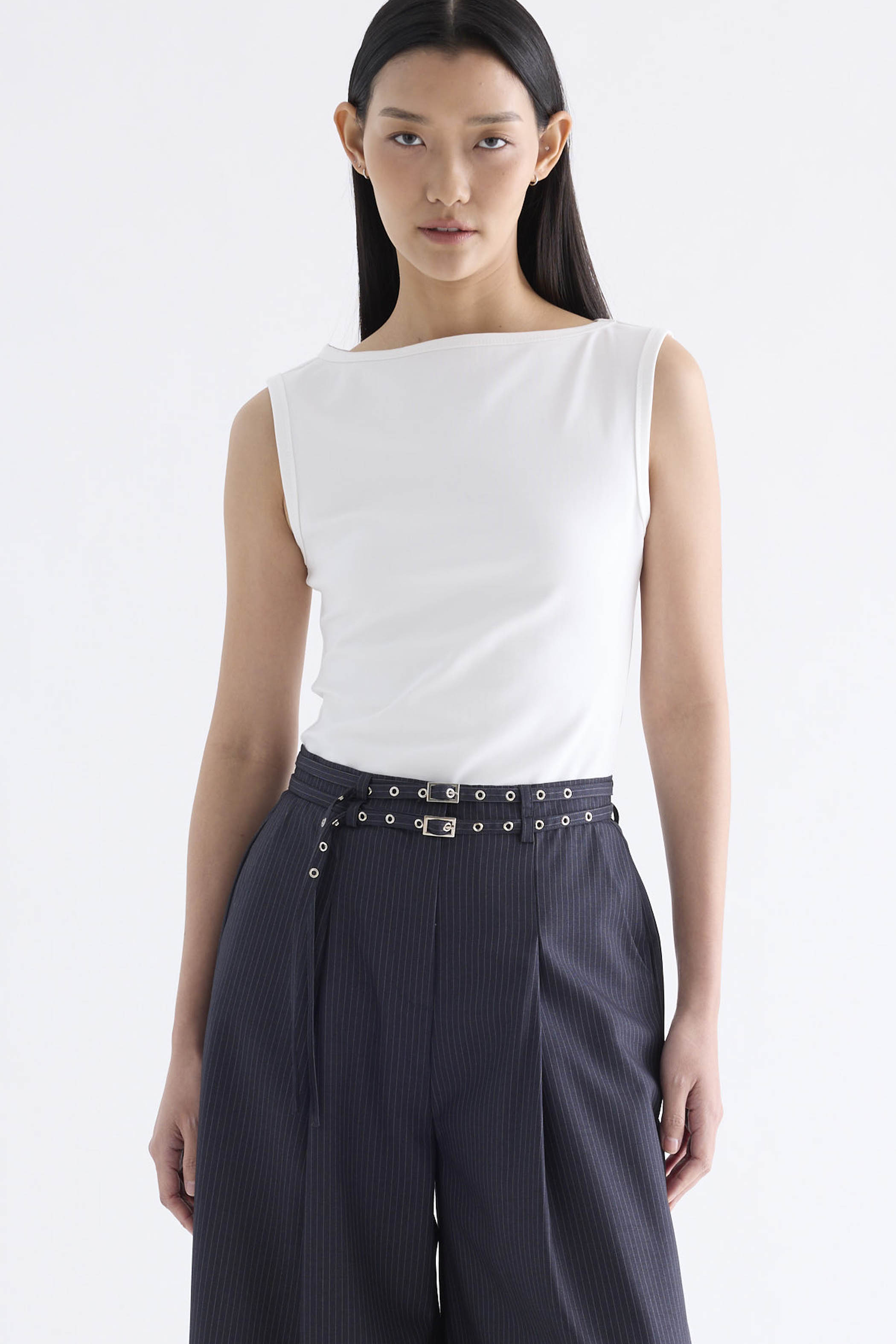 Less is more. Made from soft and stretchy fabric, this sleeveless tank features a boat neckline and fitted silhouette.