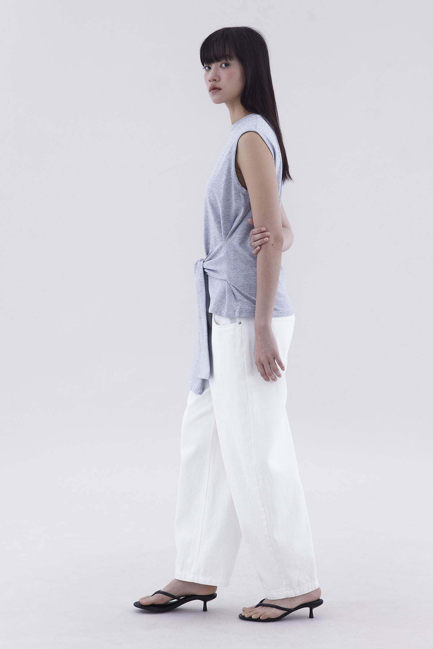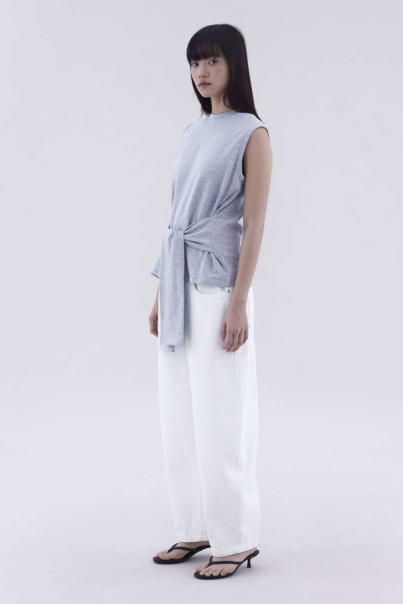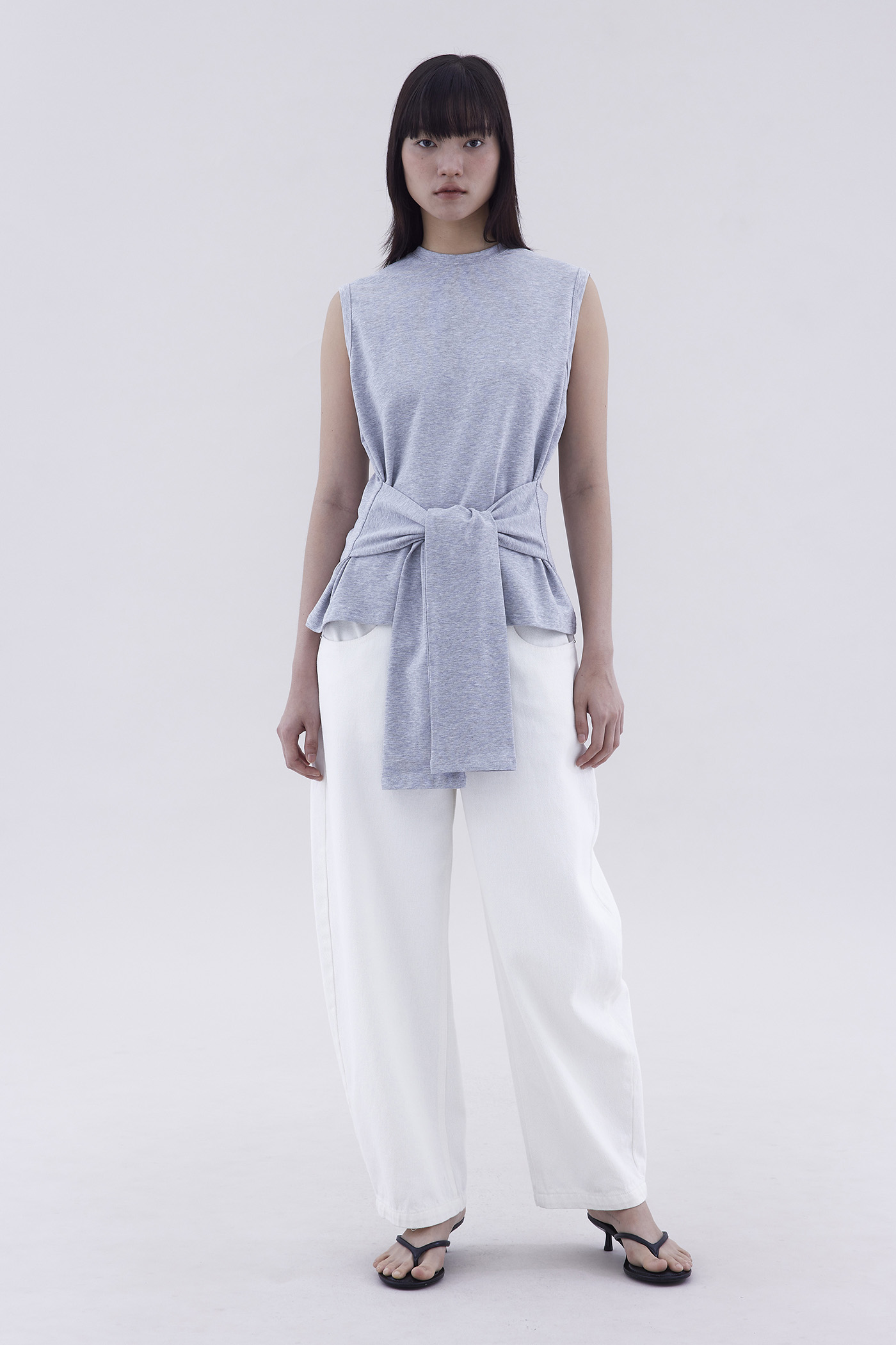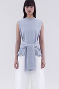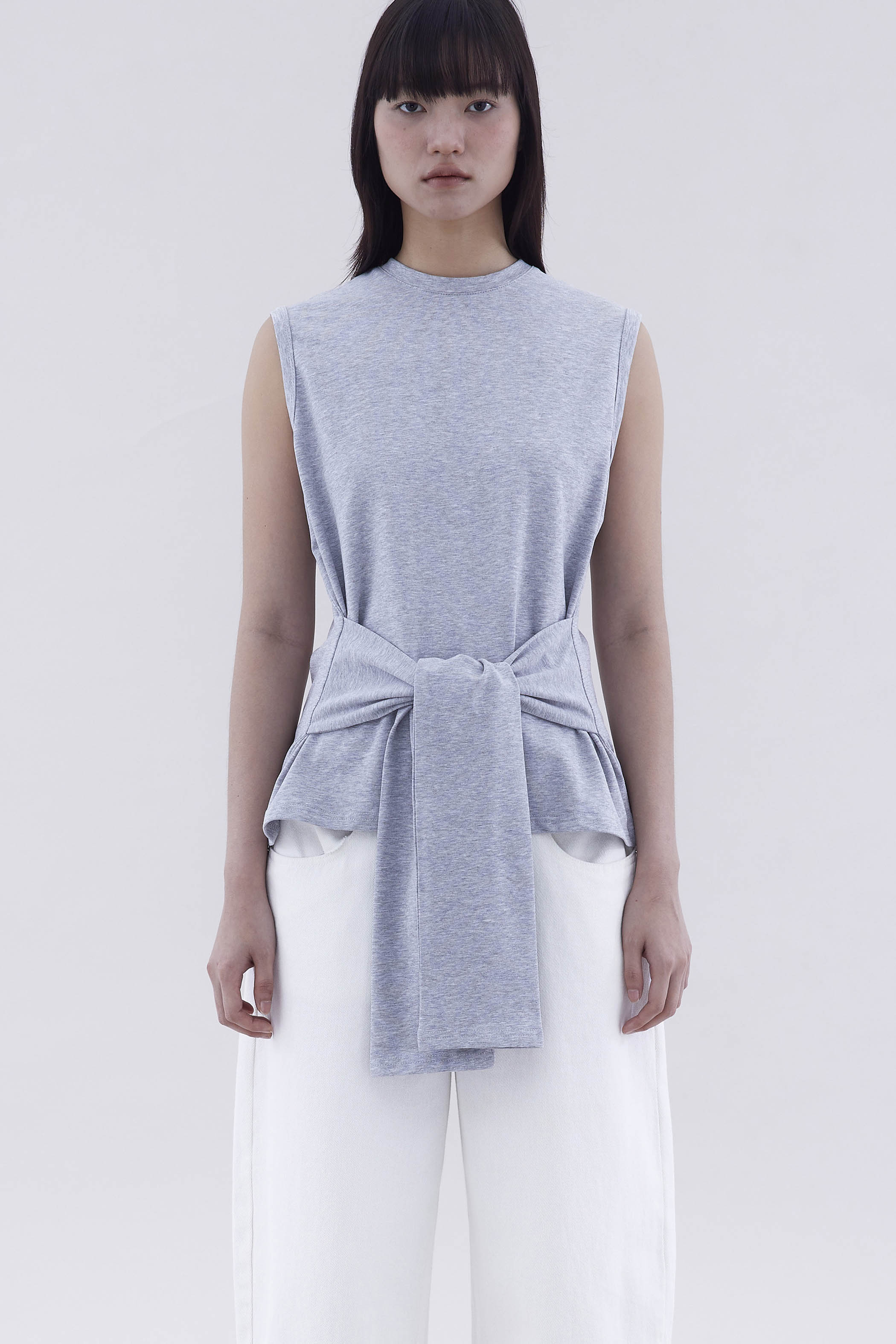 Two in one. Made from soft and stretchy fabric, this sleeveless tee features a round neckline and waist-tie strap.