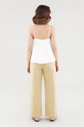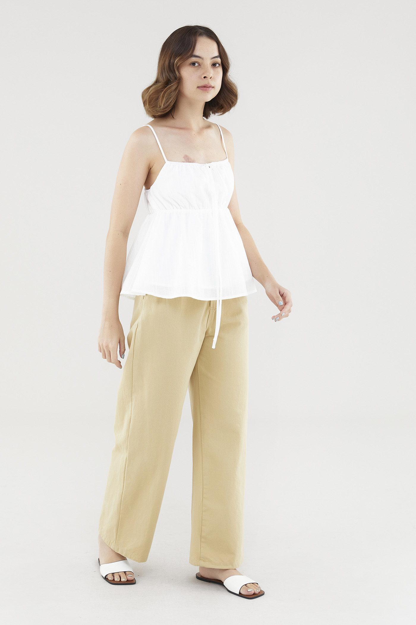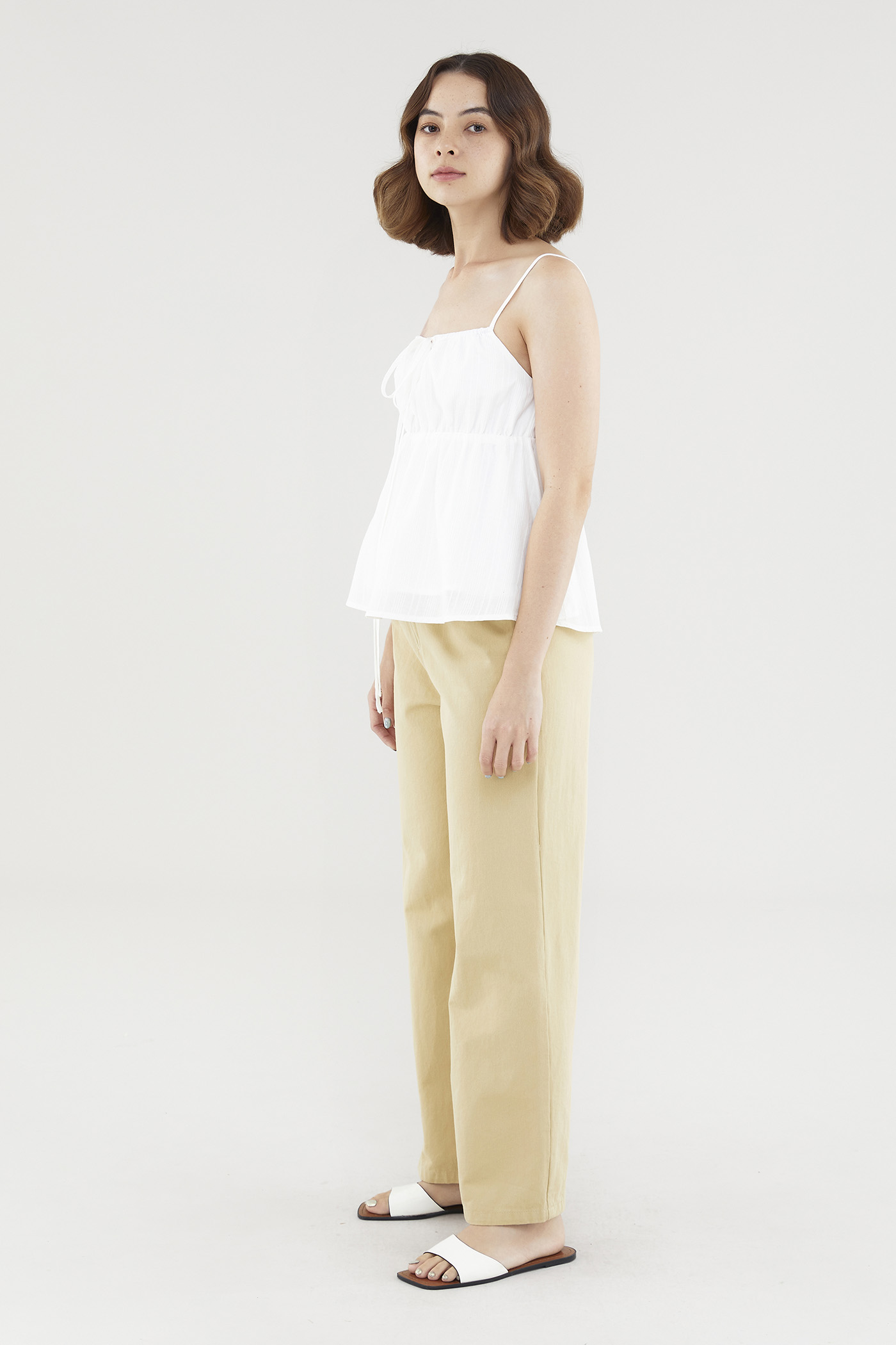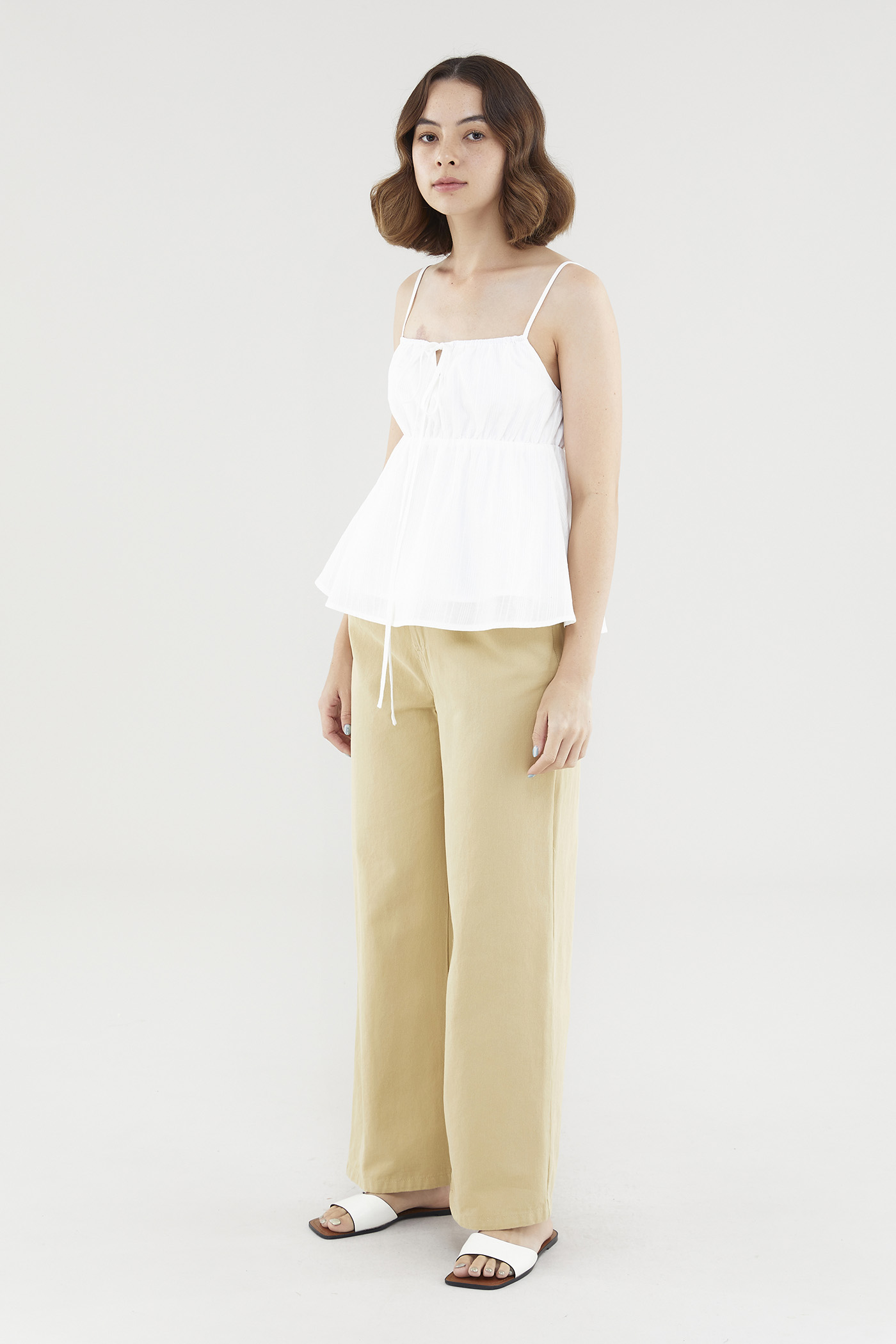 Effortlessly elegant. Made from textured, non-stretch cotton, this sleeveless top features slim adjustable shoulder straps, a stretchy neckline with front tie-straps and an elasticated bust. Worn in a relaxed babydoll silhouette that flares out beneath the bust.