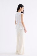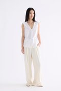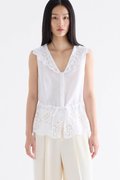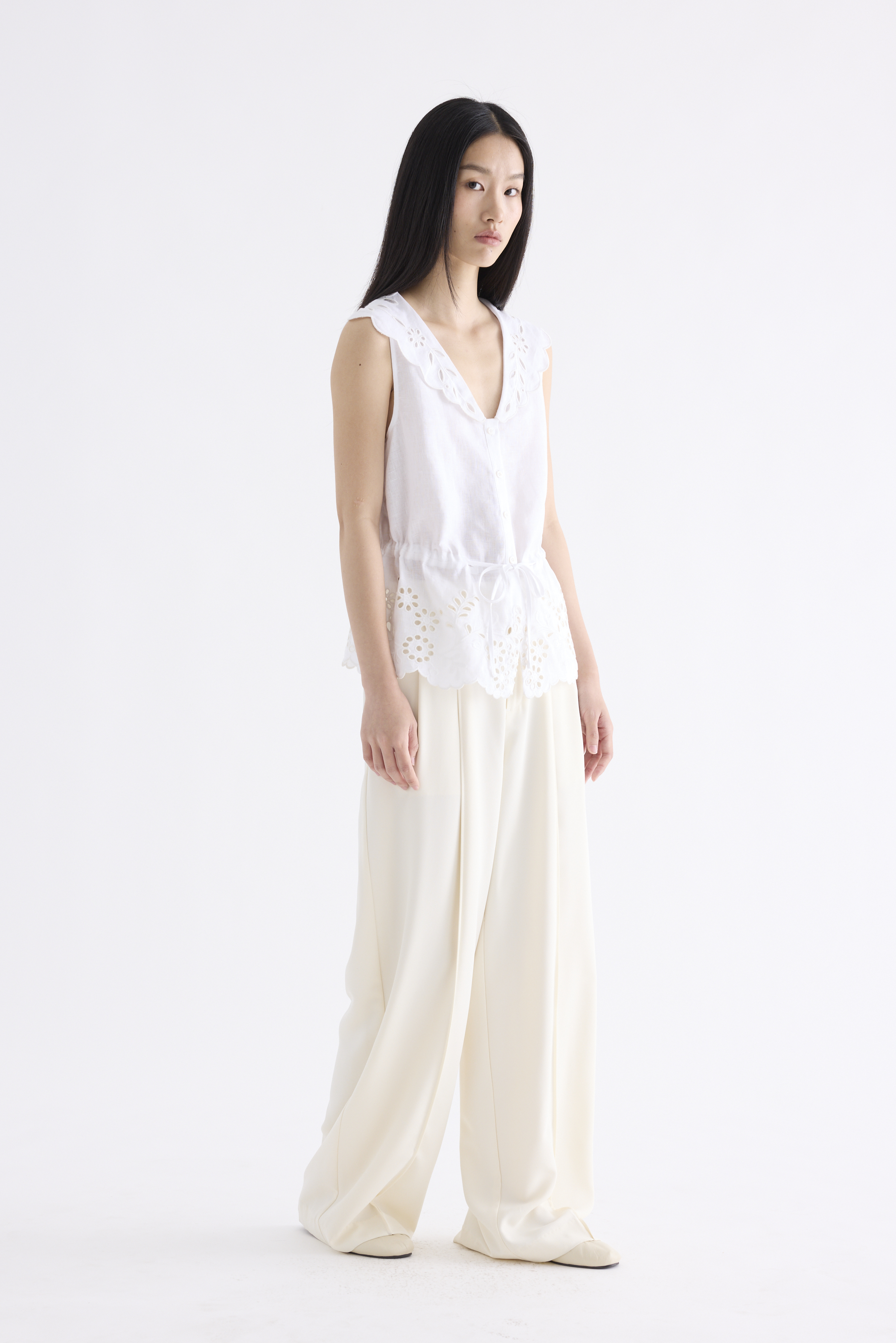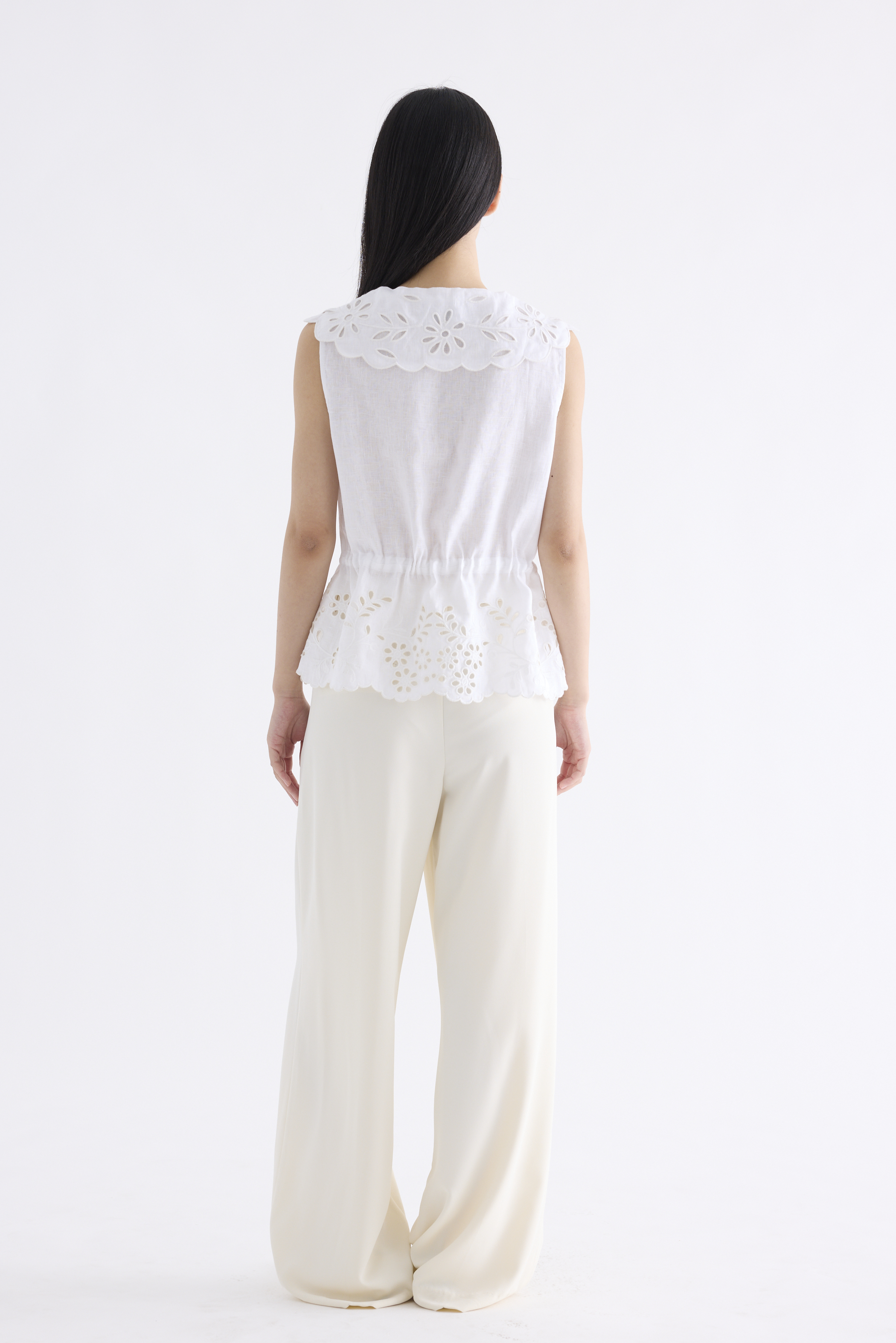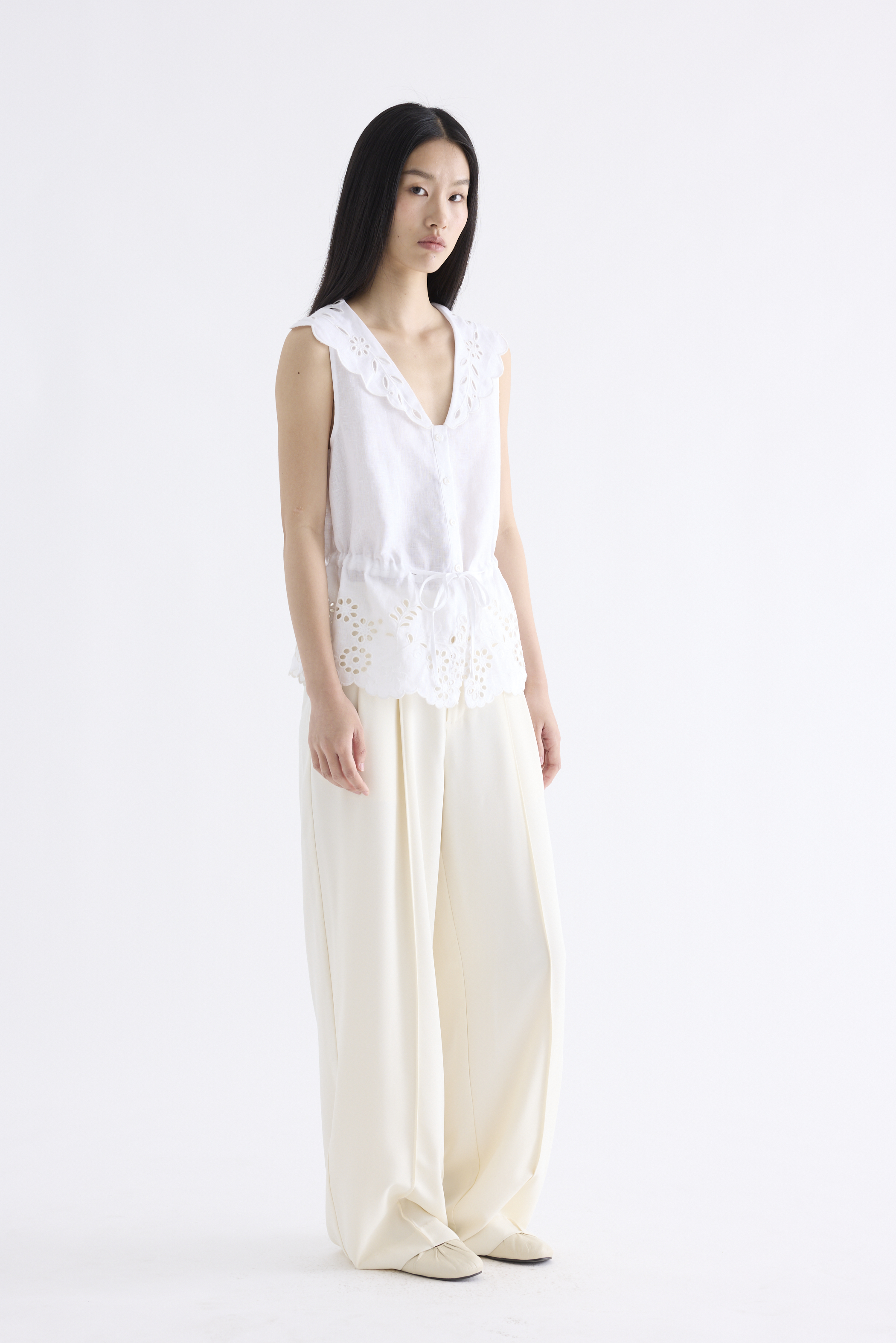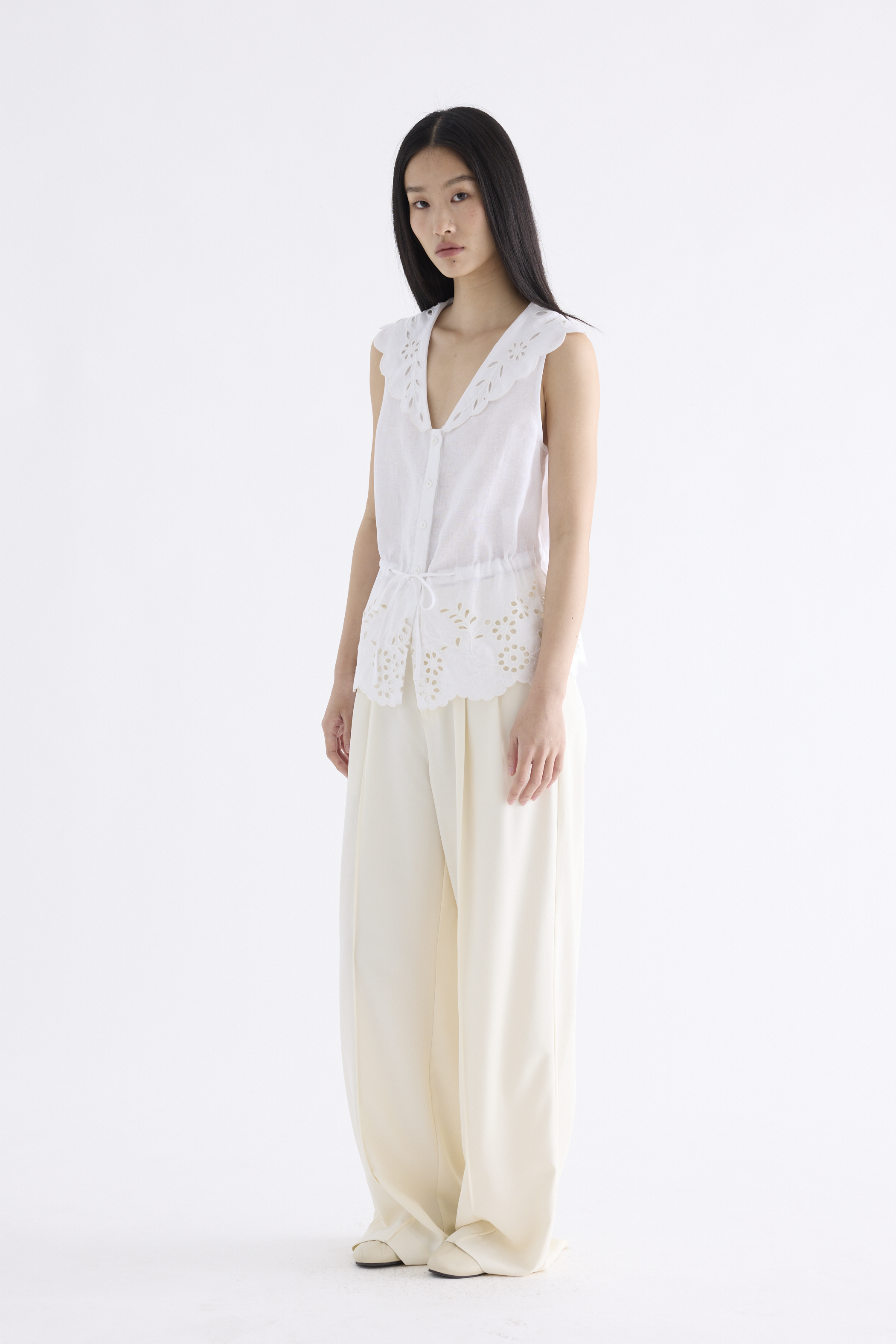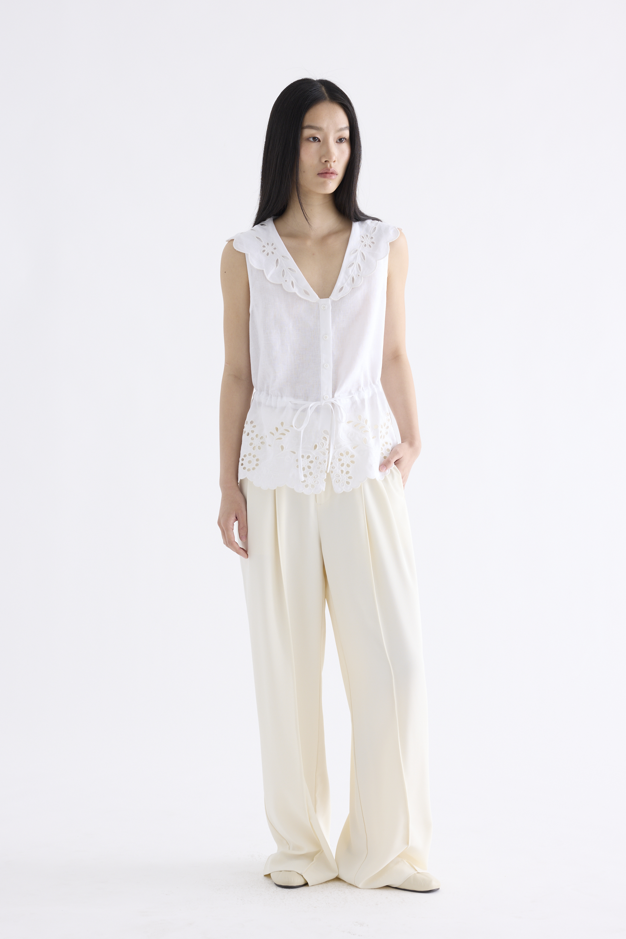 From the Postscript collection. This sleeveless top features statement lace collars and a lace hem, a V-neckline and a button-down front. Its fit is adjustable via a drawstring waist tie.